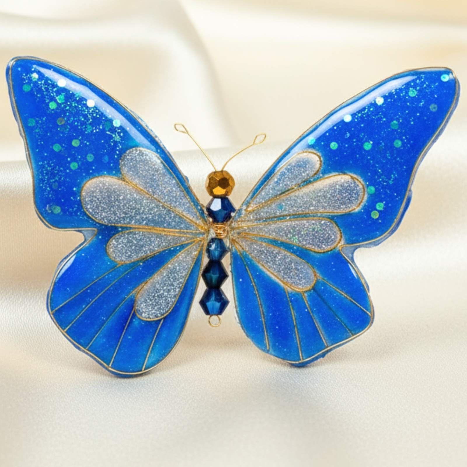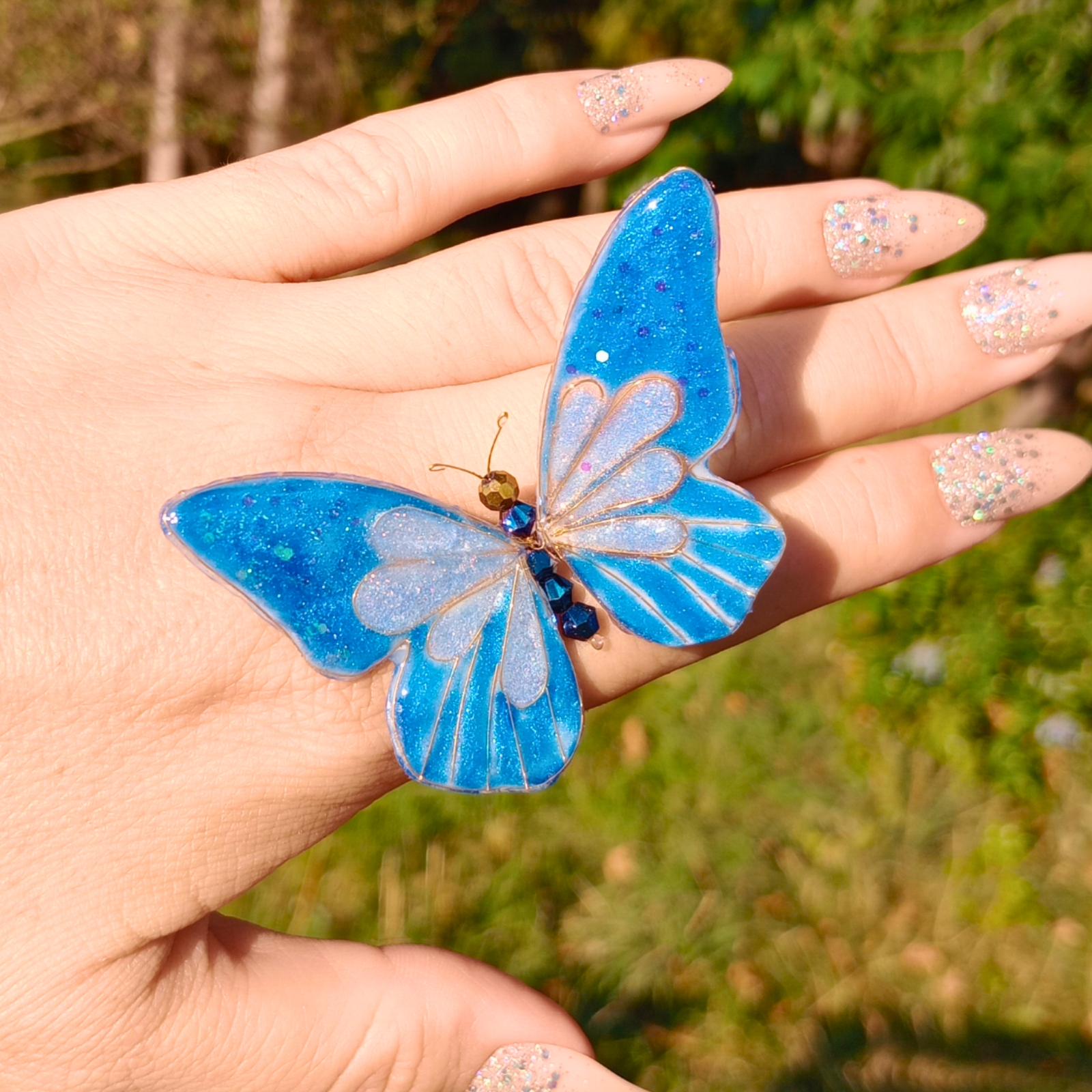 Acest accesoriu de păr reprezintă o creație artistică, unică, inspirată de frumusețea și fragilitatea naturii . Realizat manual din rășină de calitate, cristale strălucitoare și sârmă aurie fină, fluturele simbolizează libertate și eleganță. Designul unic și finisajele fine îl fac potrivit pentru evenimente speciale, dar și pentru a aduce un plus de rafinament ținutelor de zi cu zi. Un adevărat statement piece, care poate fi purtat cu încredere de femei moderne și sofisticate.