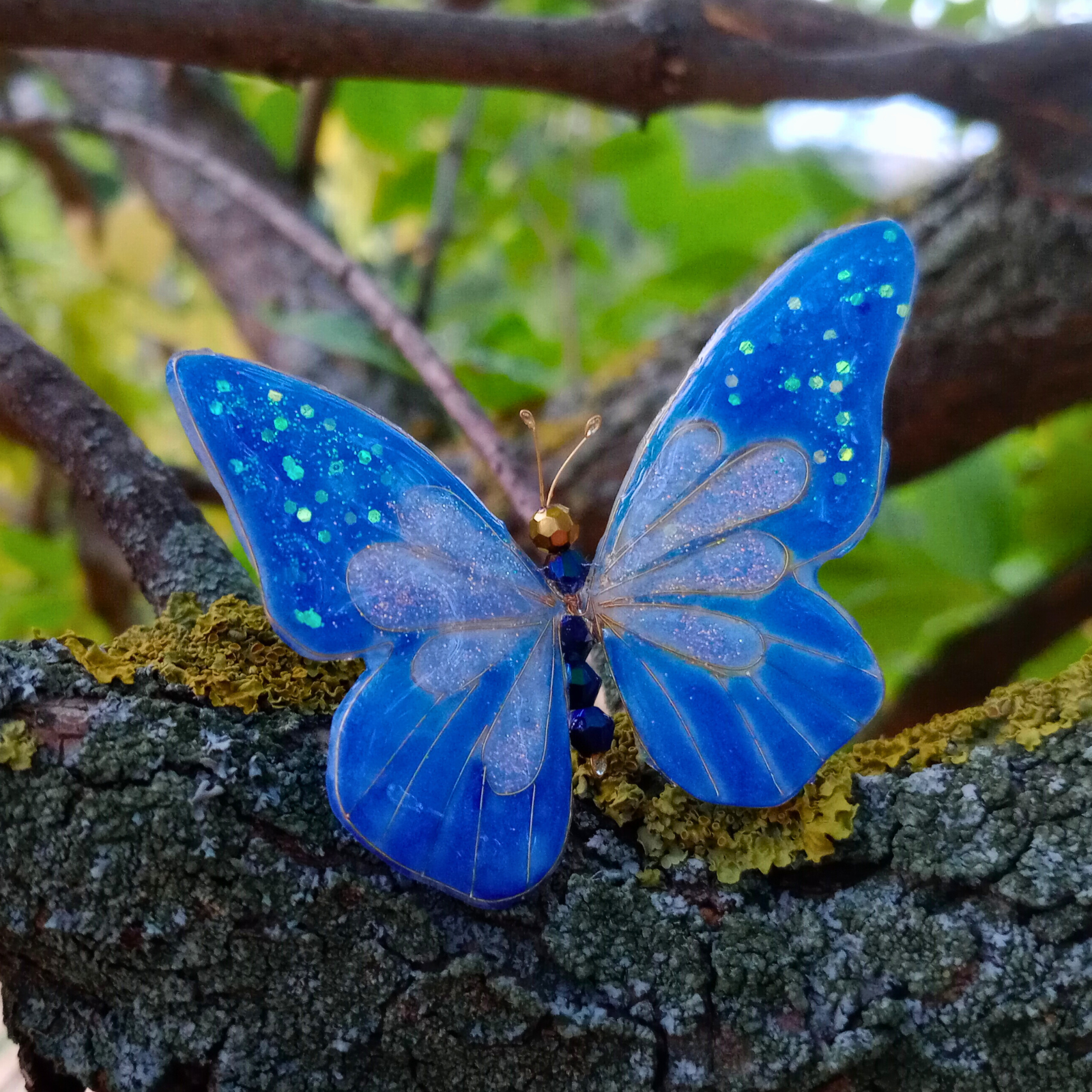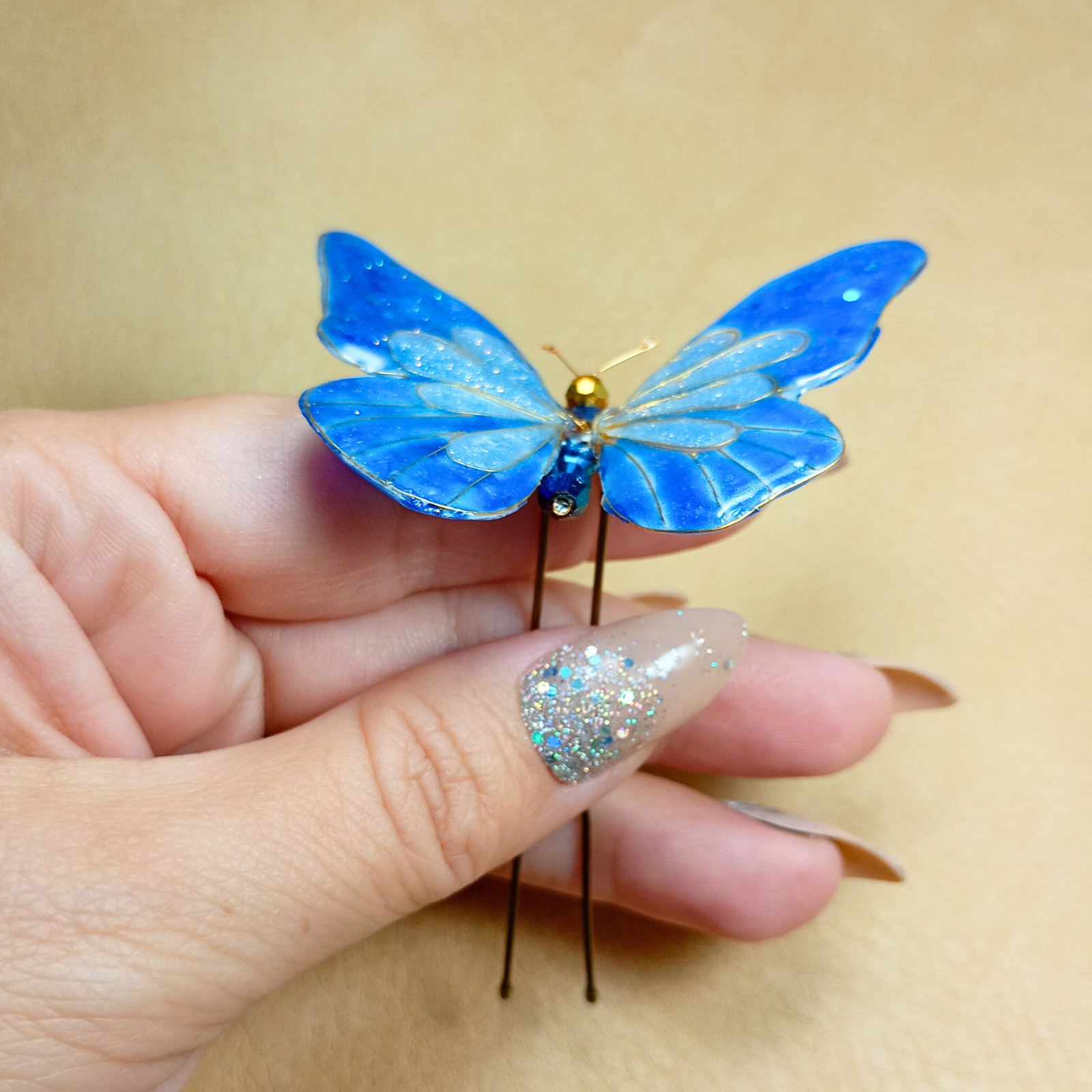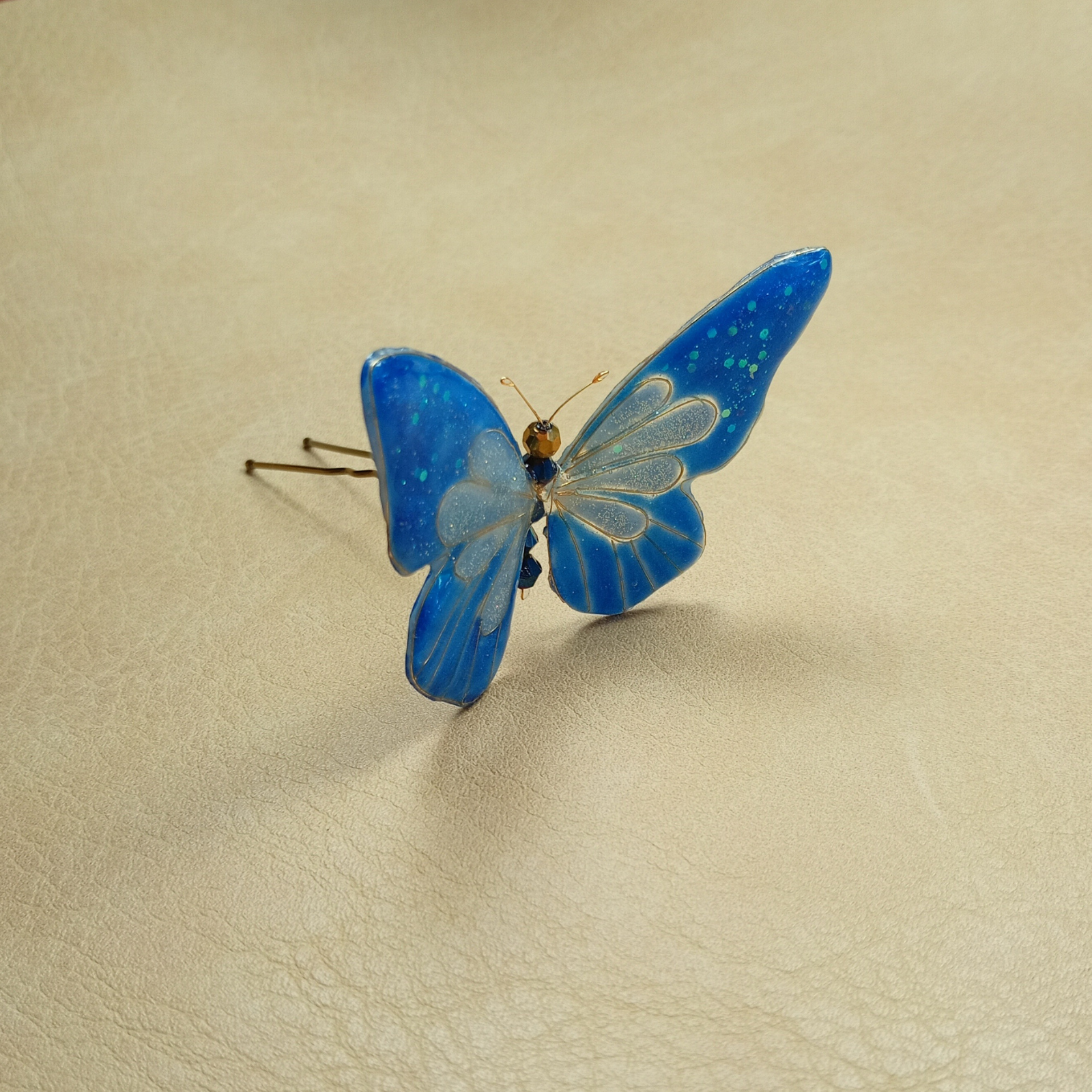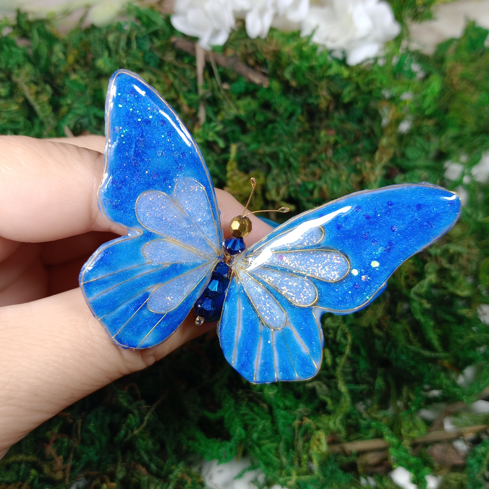 Acest accesoriu de păr reprezintă o creație artistică, unică, inspirată de frumusețea și fragilitatea naturii . Realizat manual din rășină de calitate, cristale strălucitoare și sârmă aurie fină, fluturele simbolizează libertate și eleganță. Designul unic și finisajele fine îl fac potrivit pentru evenimente speciale, dar și pentru a aduce un plus de rafinament ținutelor de zi cu zi. Un adevărat statement piece, care poate fi purtat cu încredere de femei moderne și sofisticate.
