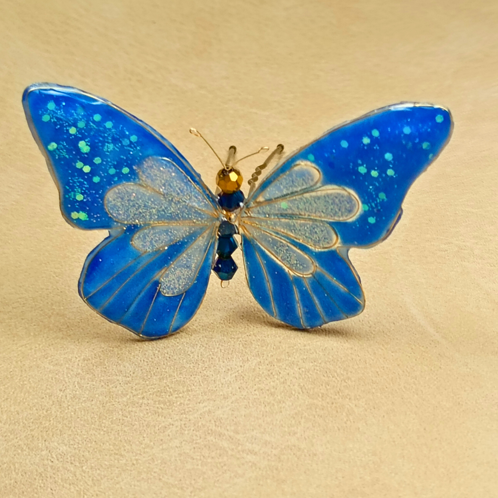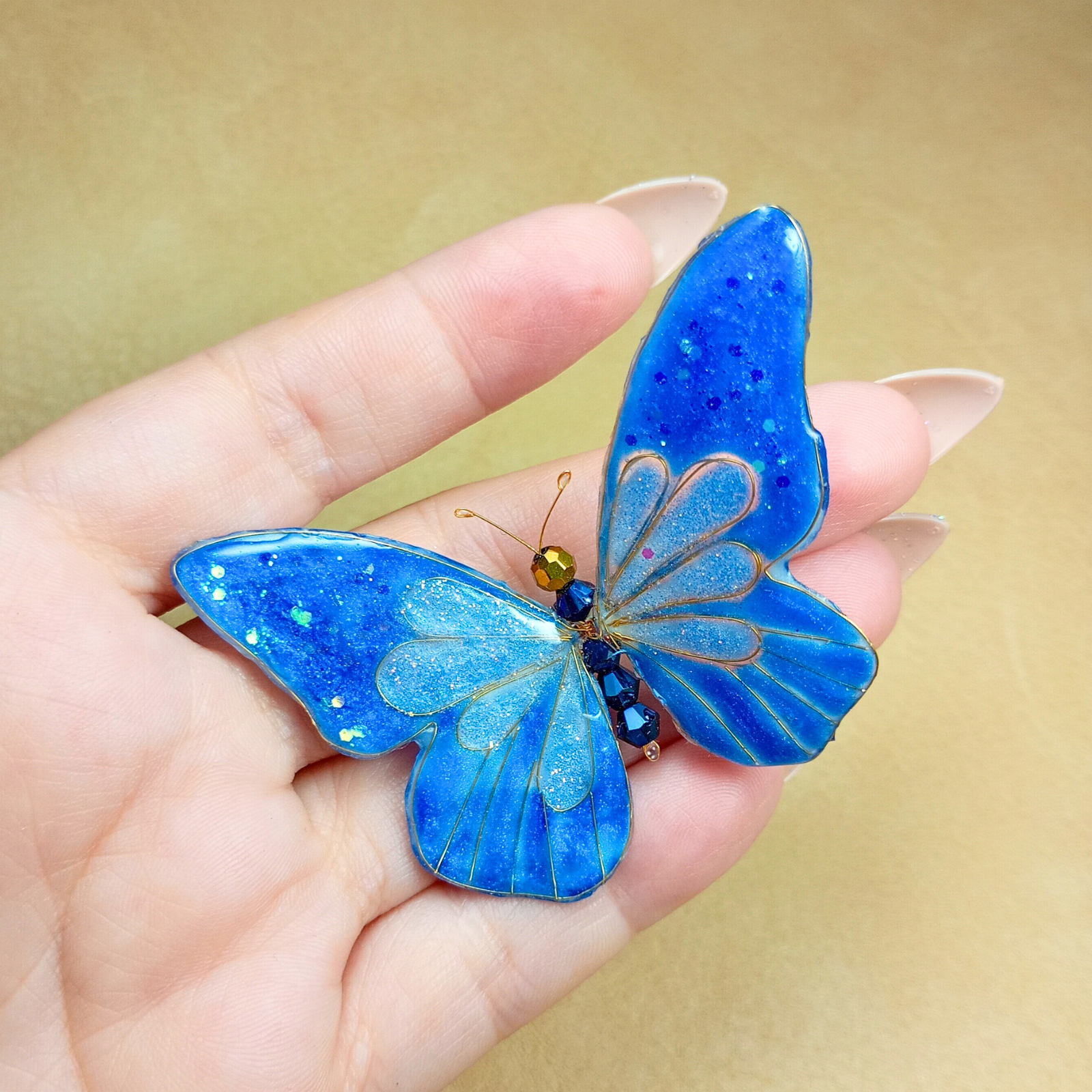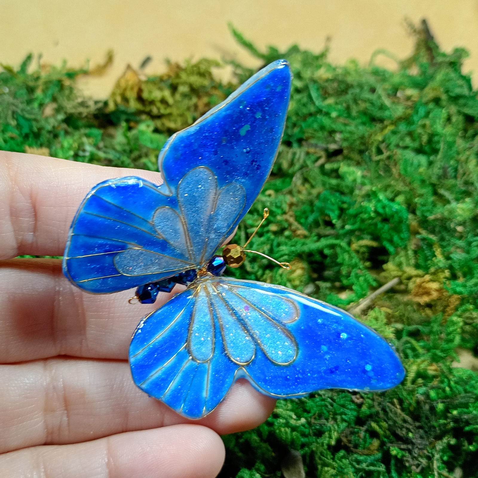 Acest accesoriu de păr reprezintă o creație artistică, unică, inspirată de frumusețea și fragilitatea naturii . Realizat manual din rășină de calitate, cristale strălucitoare și sârmă aurie fină, fluturele simbolizează libertate și eleganță. Designul unic și finisajele fine îl fac potrivit pentru evenimente speciale, dar și pentru a aduce un plus de rafinament ținutelor de zi cu zi. Un adevărat statement piece, care poate fi purtat cu încredere de femei moderne și sofisticate.