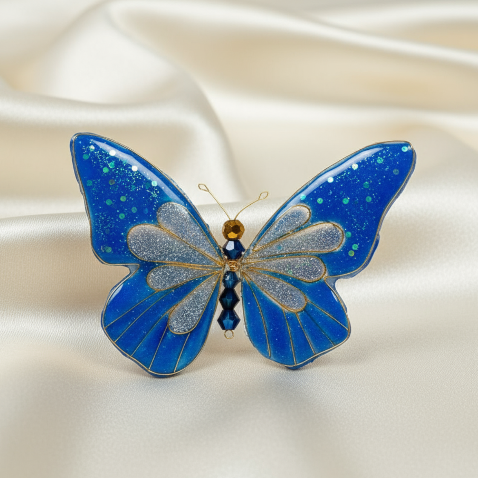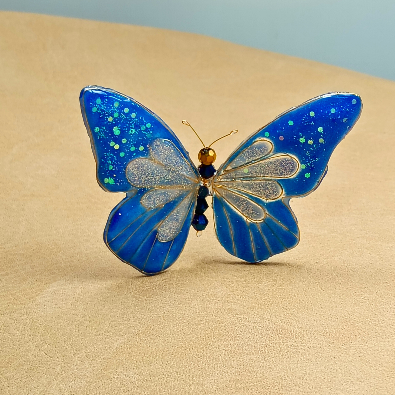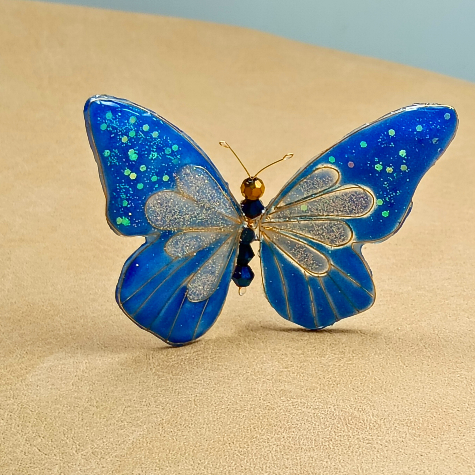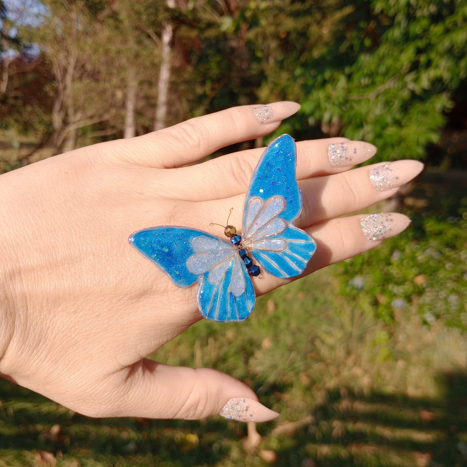 Acest accesoriu de păr reprezintă o creație artistică, unică, inspirată de frumusețea și fragilitatea naturii . Realizat manual din rășină de calitate, cristale strălucitoare și sârmă aurie fină, fluturele simbolizează libertate și eleganță. Designul unic și finisajele fine îl fac potrivit pentru evenimente speciale, dar și pentru a aduce un plus de rafinament ținutelor de zi cu zi. Un adevărat statement piece, care poate fi purtat cu încredere de femei moderne și sofisticate.