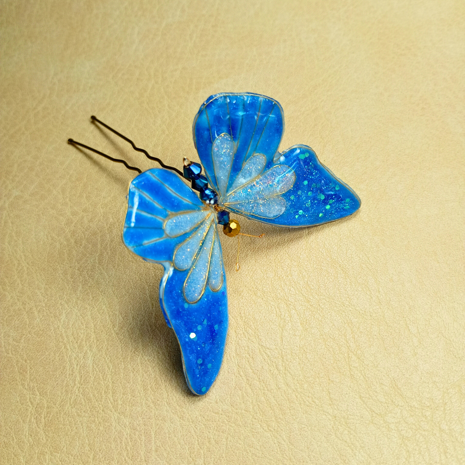 Acul de păr este modelat manual din rășină, sârmă aurie (gilt), pigmenți, glitter, cristale de sticlă