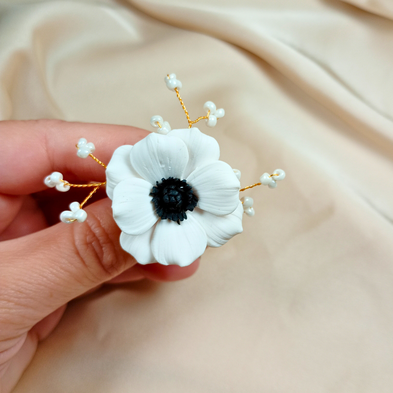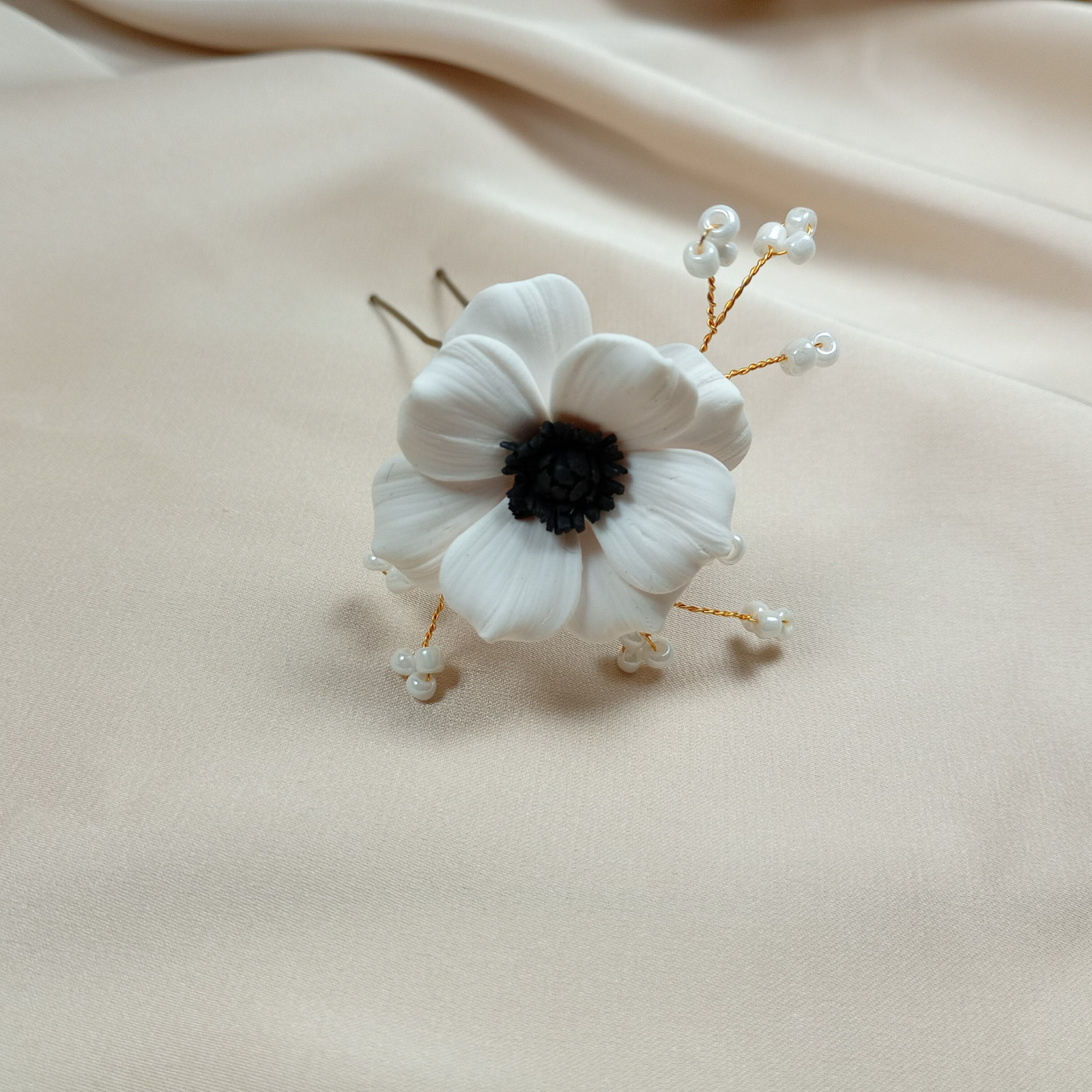 Acest ac de păr delicat are ca piesă centrală o floare de anemonă albă, modelată manual din argilă polimerică, cu petale texturate și centru negru, care oferă profunzime și contrast. În jurul florii se află rămurele subțiri din sârmă gilt aurie, decorate cu mărgele de sticlă tip perlă, ce adaugă un luciu discret și un efect aerat.