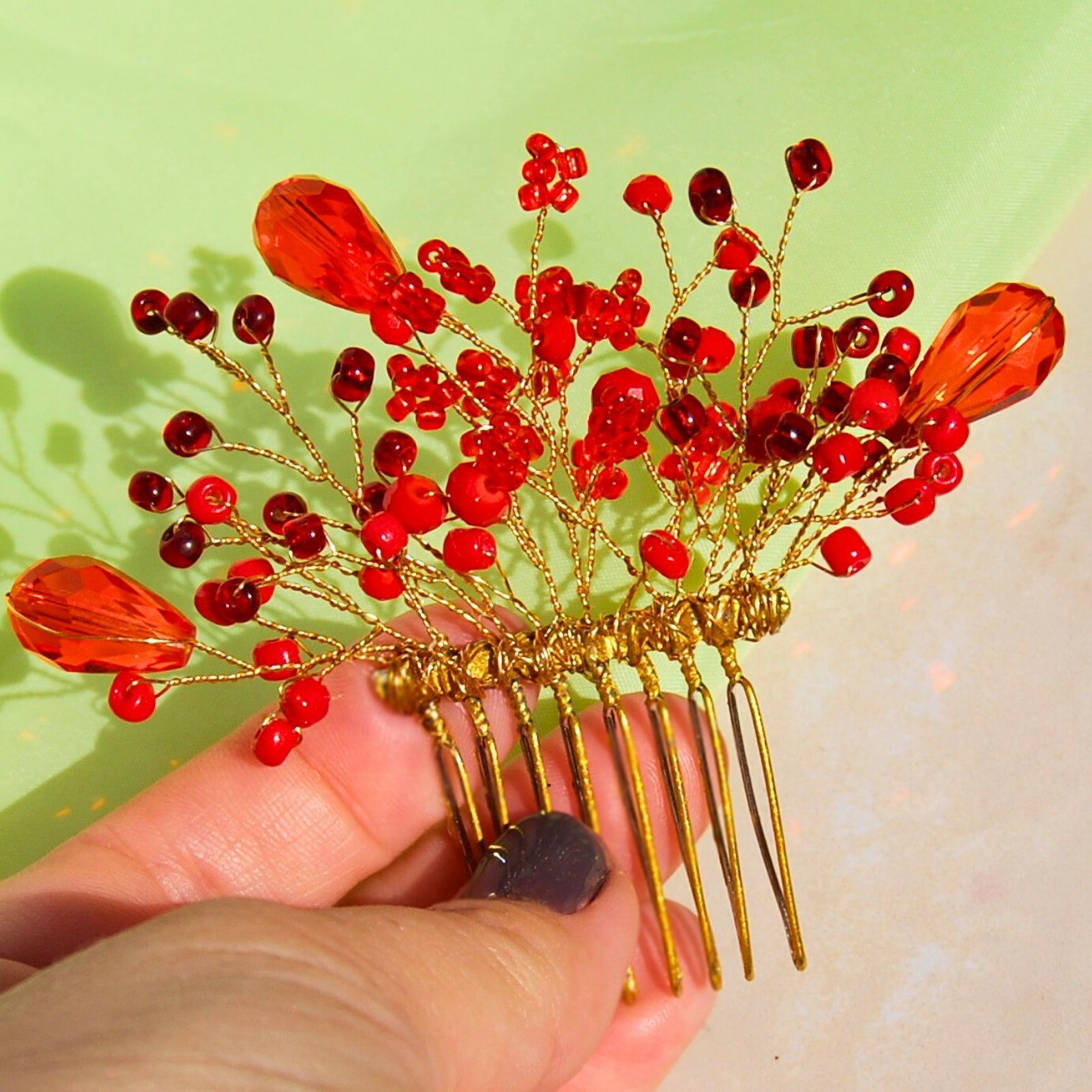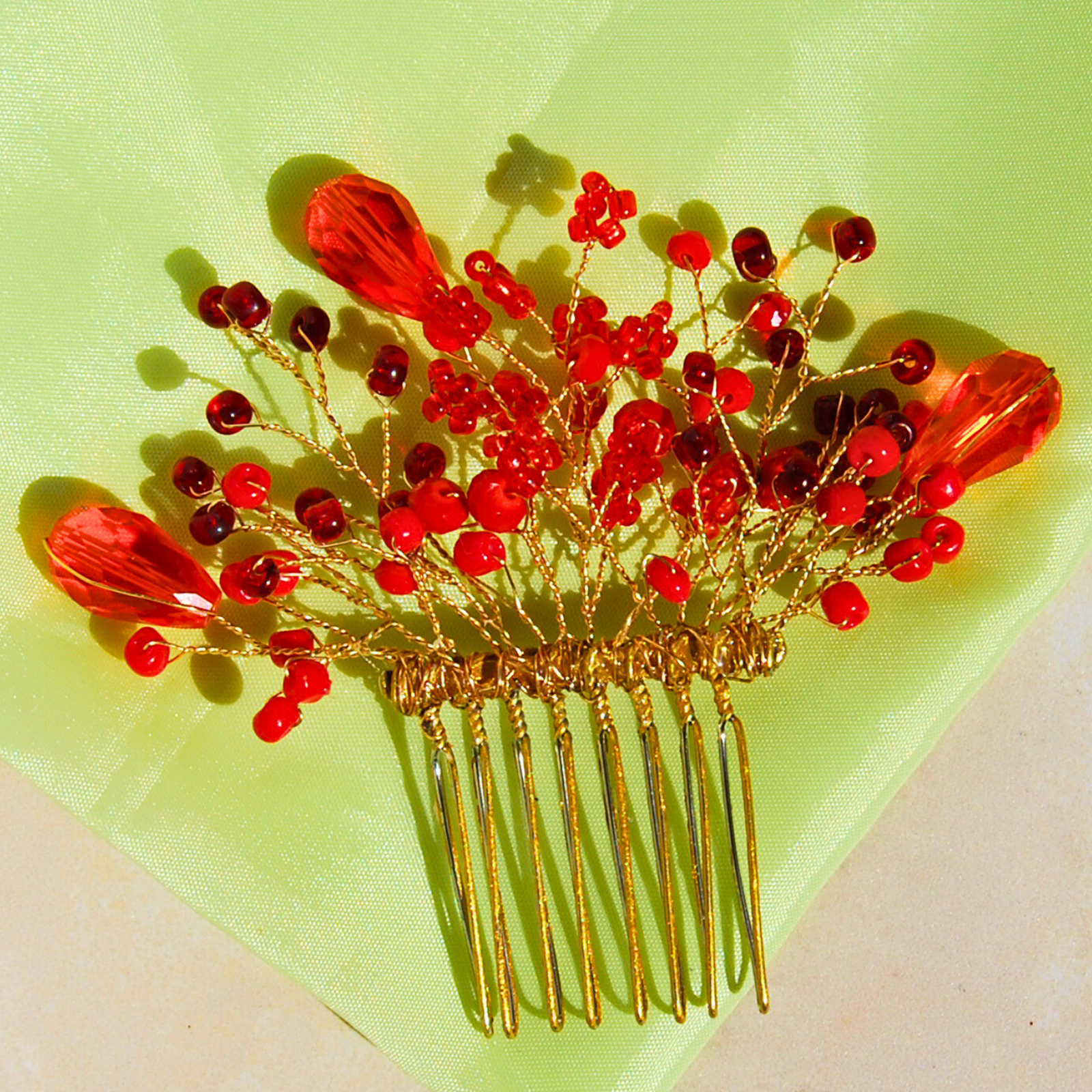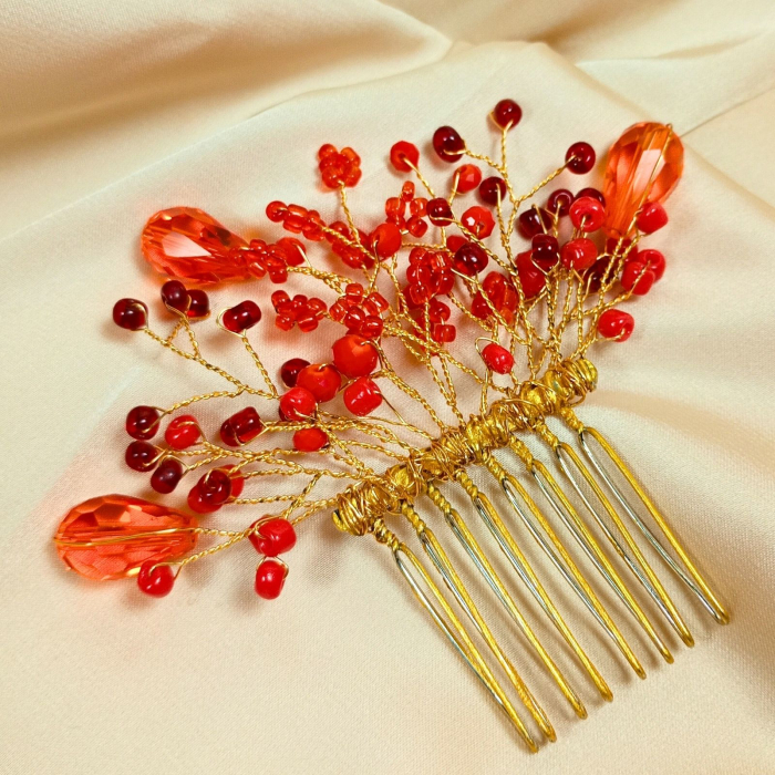 Accesoriul este lucrat manual pe bază de pieptăn metalic auriu, cu lungime de aproximativ 3 cm, peste care sunt țesute ramuri subțiri din sârmă gilt. Pe acestea sunt prinse cristale de sticlă roșii în formă de picătură și mărgele rotunde roșii, care creează un efect bogat de buchet stilizat. Dimensiunile modelului sunt de aproximativ 4,8 × 9,3 cm, suficient de generoase pentru a deveni punctul central al coafurii, fără a fi greu sau incomod.