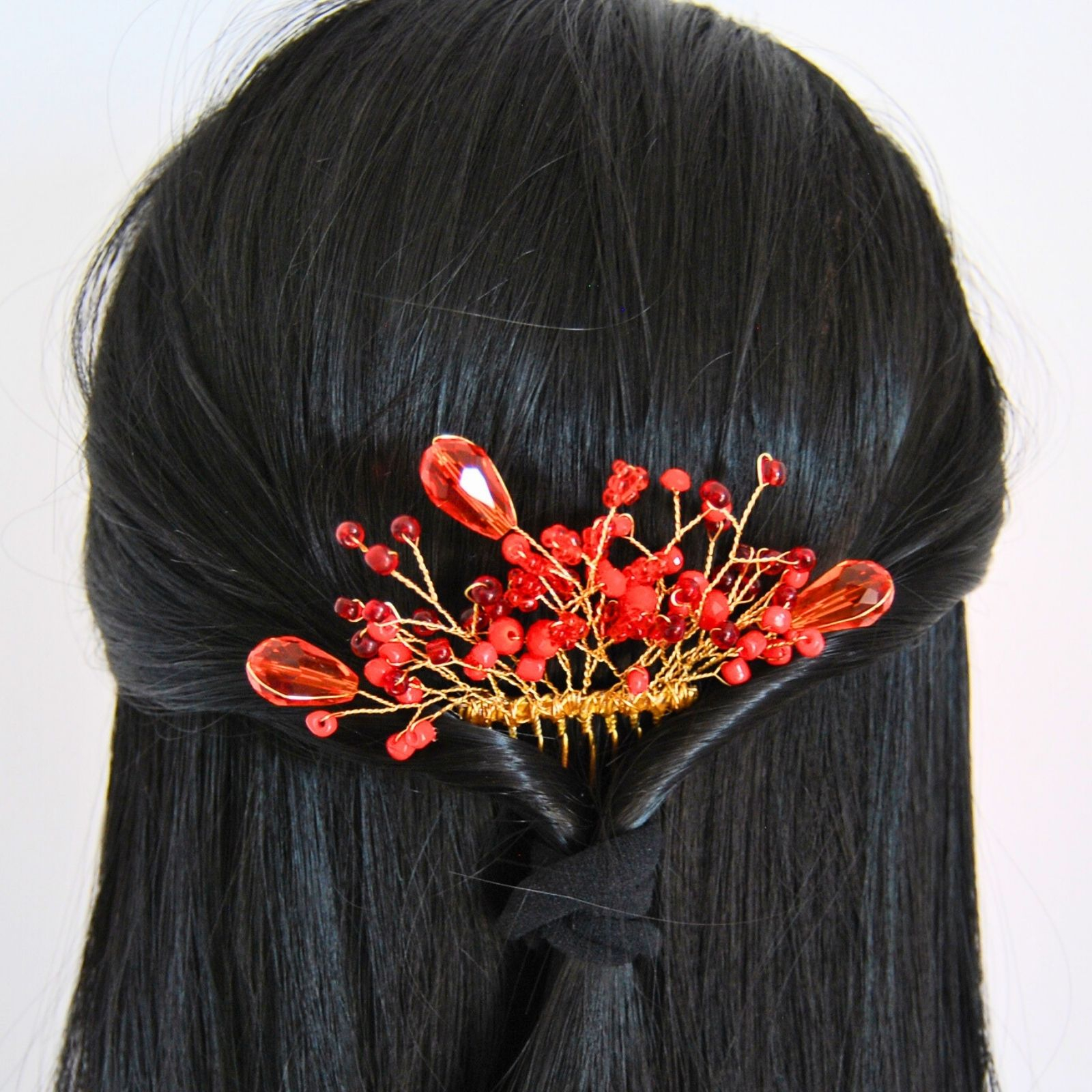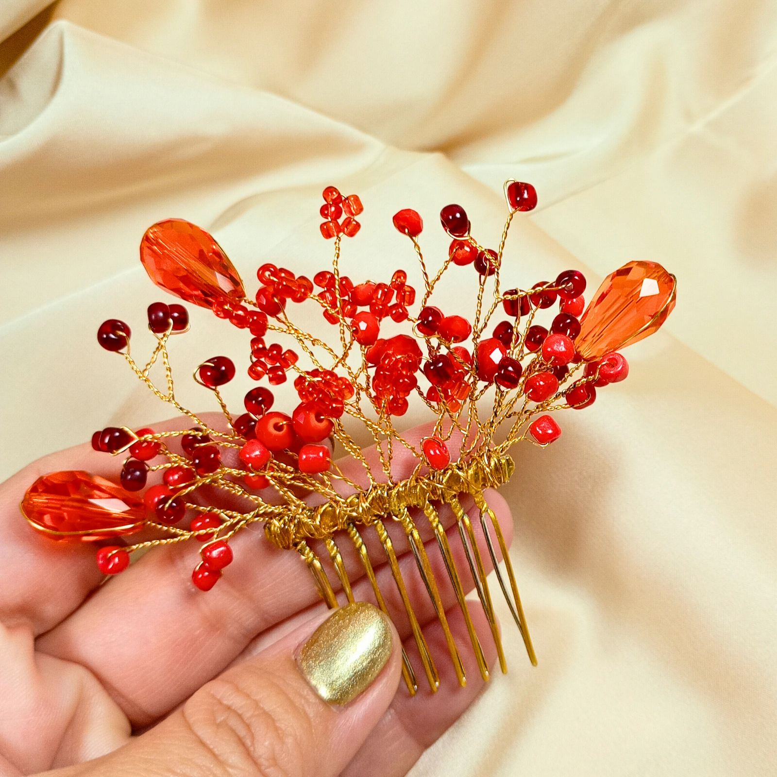 Structura flexibilă a sârmei permite modelarea delicată a ramurilor direct în păr, astfel încât accesoriul să urmeze linia cocului sau a coafurii half‑up. Contrastul dintre auriu și roșu face ca pieptănul să fie ideal pentru ținute de seară, evenimente festive, tematici romantice sau chiar ținute de inspirație tradițională în care roșul joacă rolul principal.