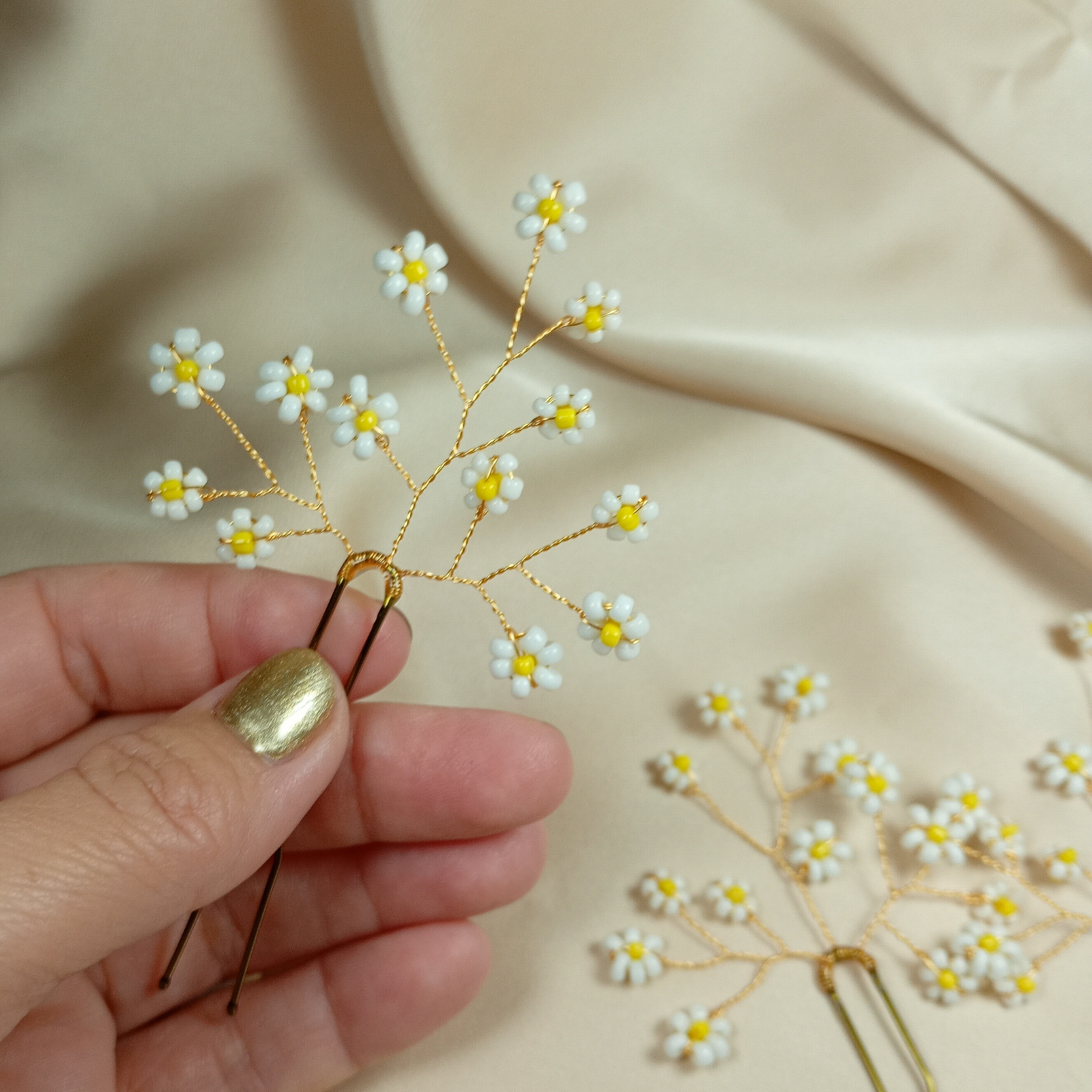 Setul include 4 ace de păr decorate cu flori de tip margaretă, realizate petală cu petală din mărgele de sticlă albe cu mijloc galben, răsucite pe sârmă gilt cu finisaj cald, auriu. Ramurile florale au aproximativ 4,3 × 6,6 cm, iar fiecare piesă este modelată ușor diferit, astfel încât coafura să arate natural, ca un buchețel de flori presărate în păr.