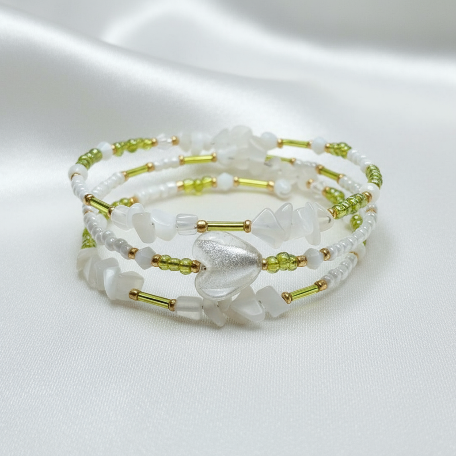 Brățară elegantă, lucrată manual pe sârmă cu memorie, care își păstrează forma spiralată și se așază perfect pe încheietură. Creată dintr-o combinație rafinată de mărgele de sticlă de 2 mm și 3 mm, mărgele tubulare, cristale biconice, piatră semiprețioasă Ochi de pisică alb și o inimă din sticlă de Murano, fiecare detaliu adaugă strălucire și echilibru natural.