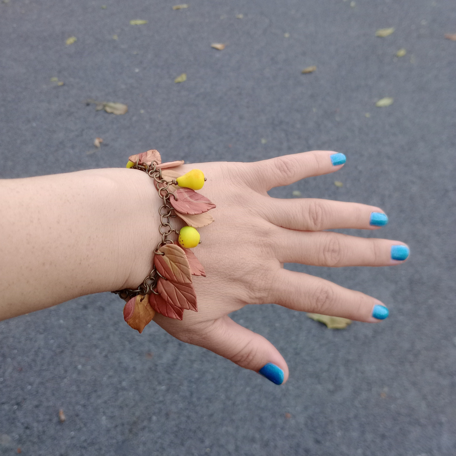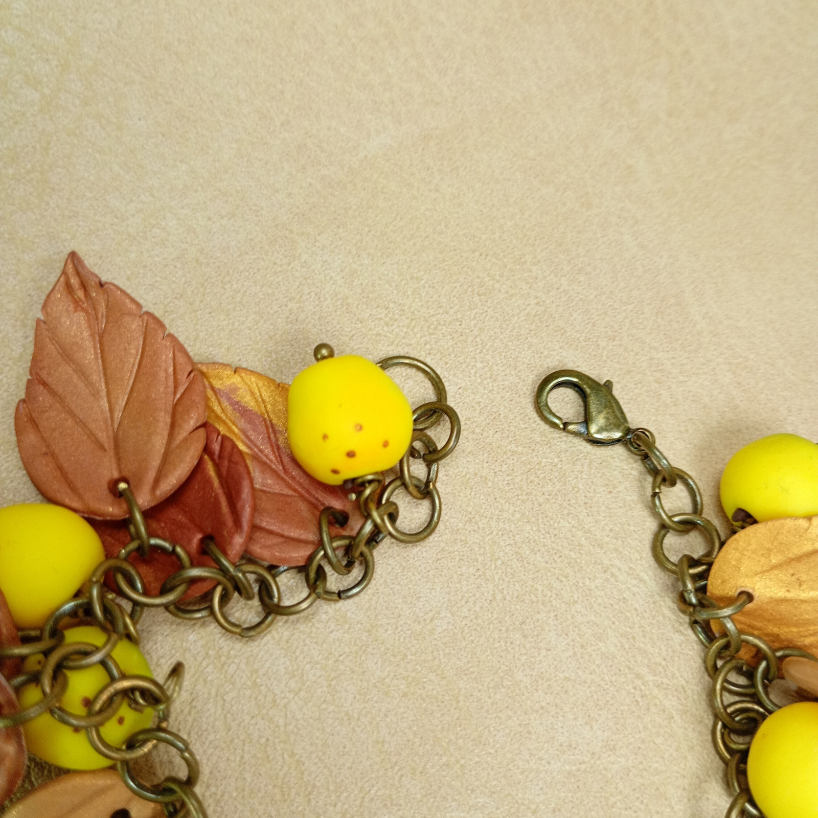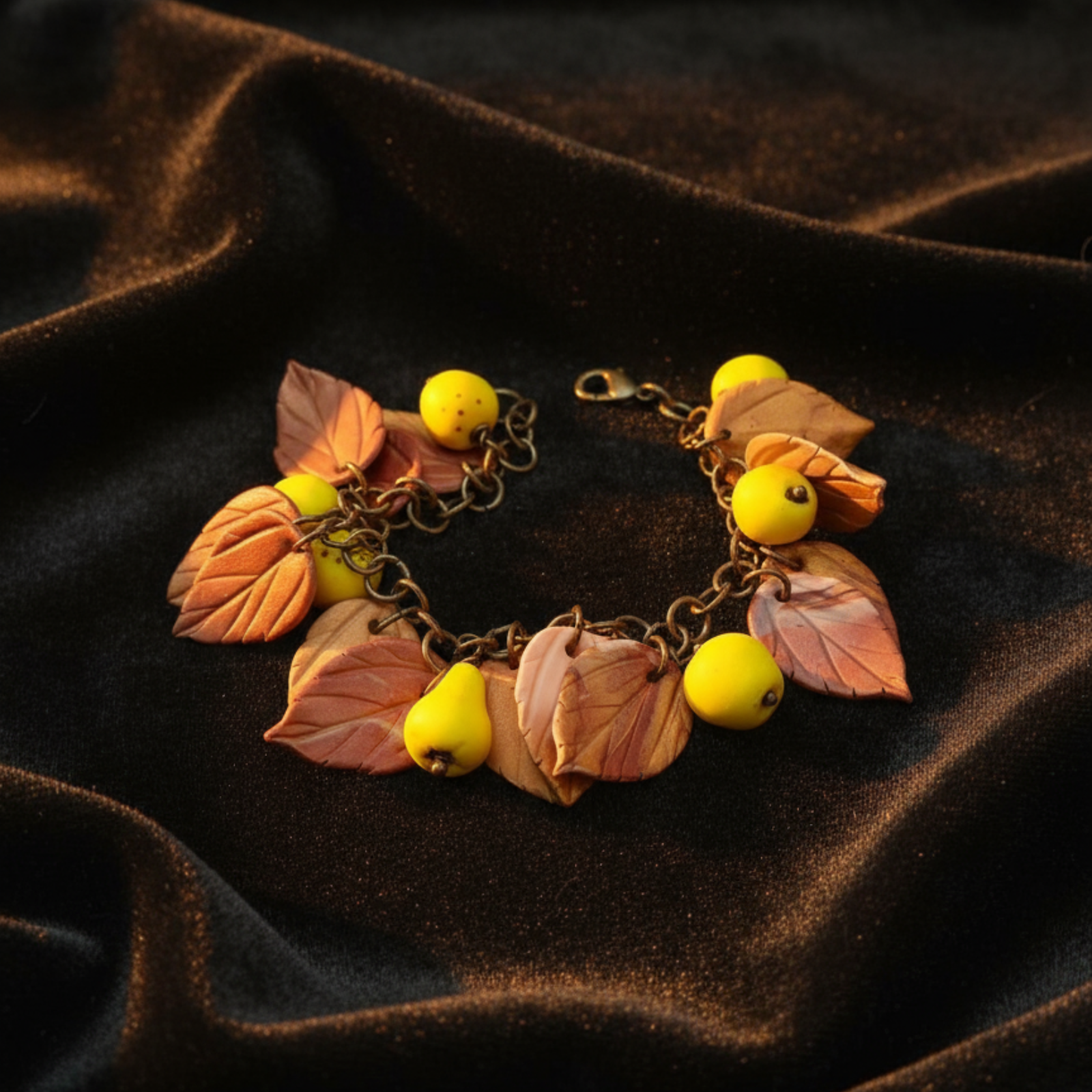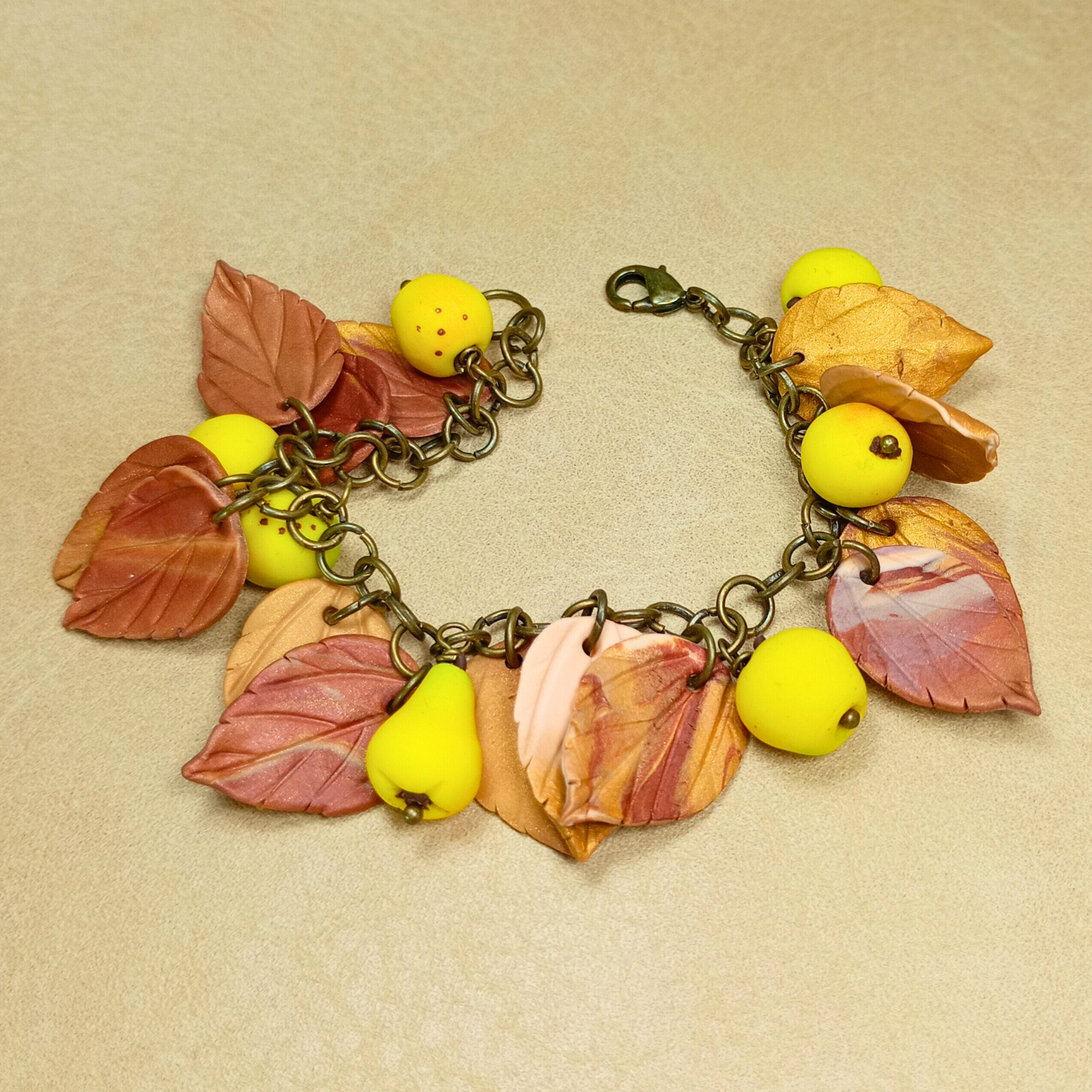 Fiecare element decorativ, frunză și fruct stilizat, este modelat manual din argilă polimerică, conferind fiecărei brățări un aspect unic și original.