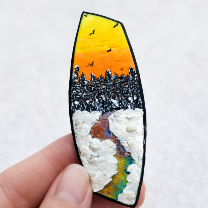 Broșele din această categorie sunt create manual, din argilă polimerică și alte materiale atent alese, pentru a deveni mici opere de artă purtabile. Fiecare piesă spune o poveste – de la scene romantice și peisaje de sezon, până la compoziții abstracte – și este gândită să fie purtată cu plăcere, fără să fie incomodă.​