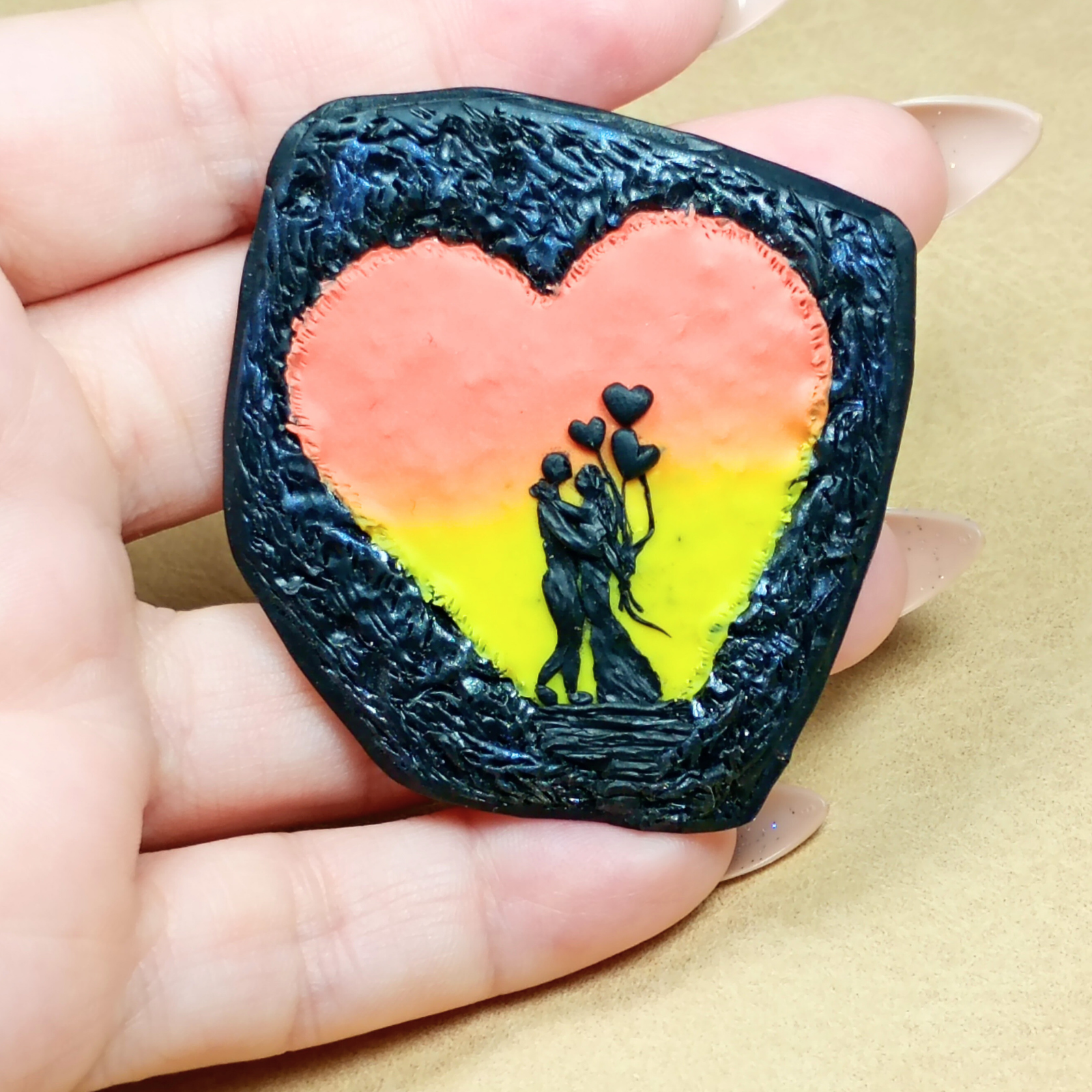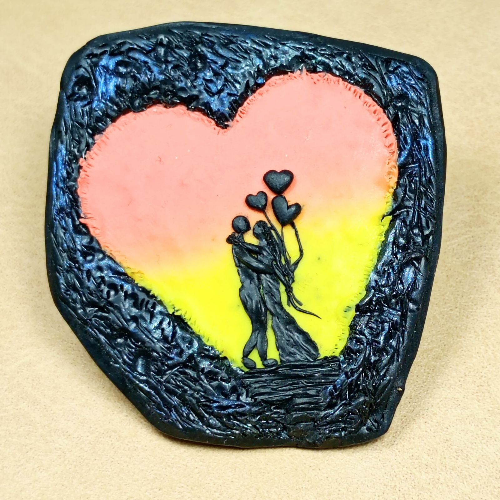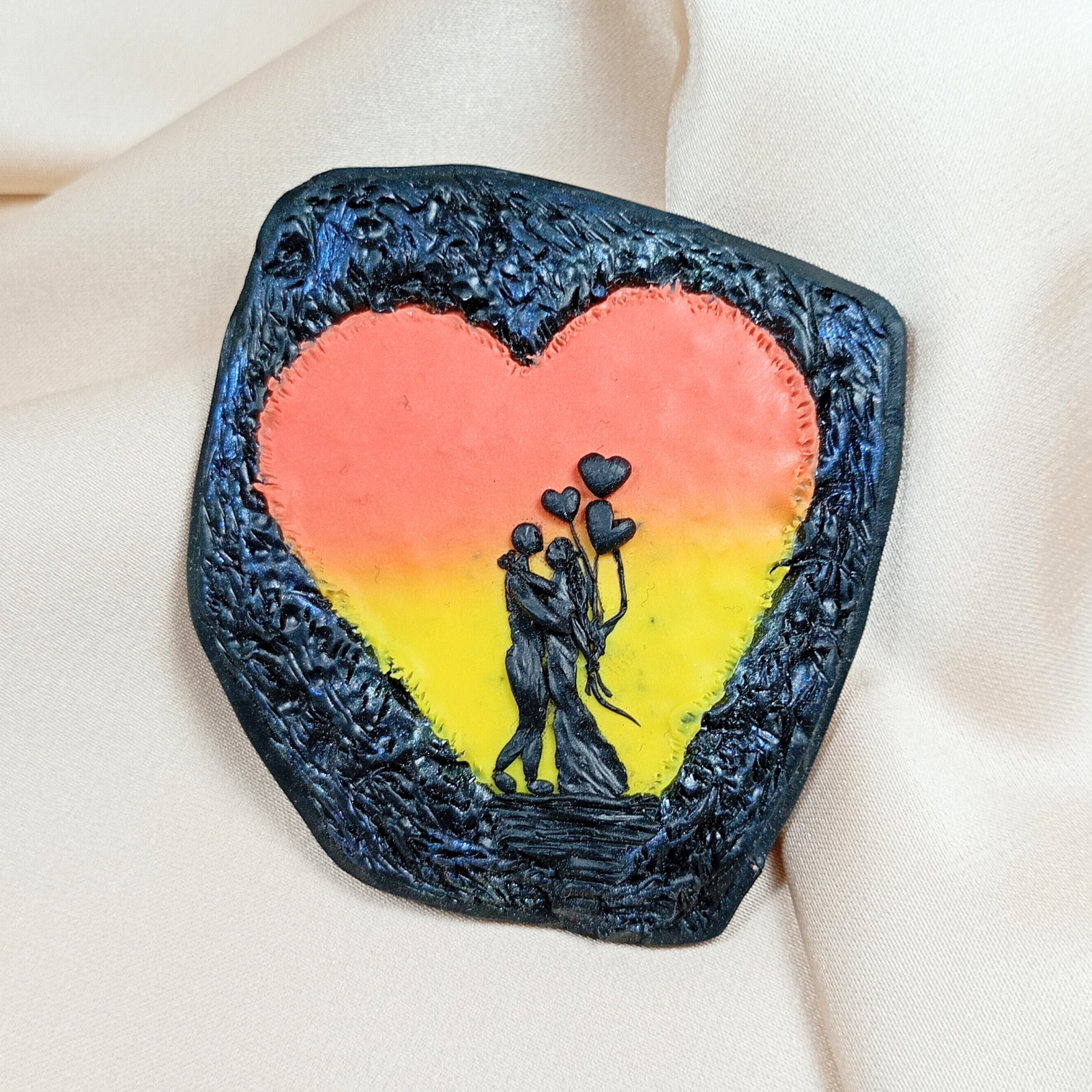 Broșa este realizată manual din argilă polimerică colorată cu pigmenți, cu siluetă de cuplu stilizată în relief.