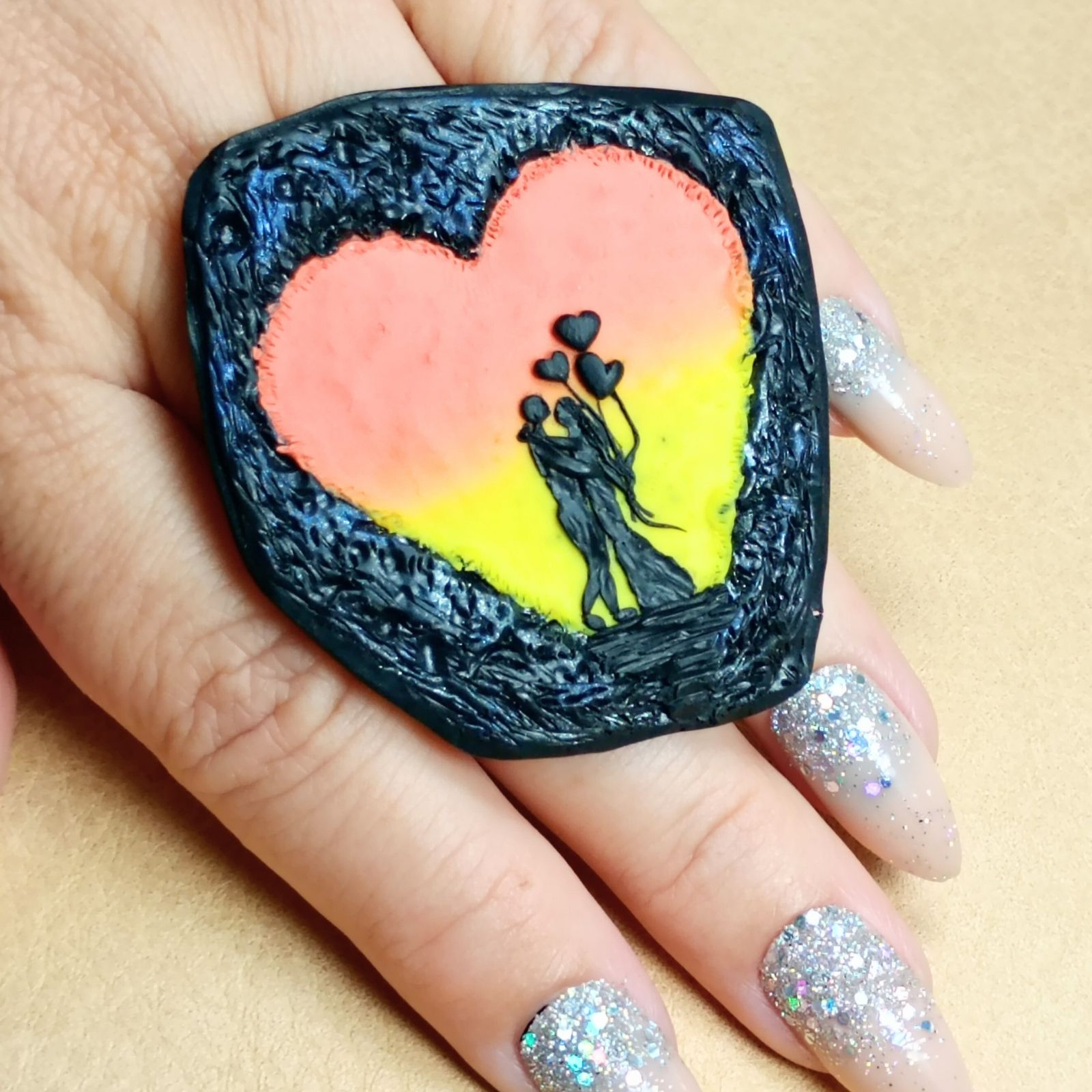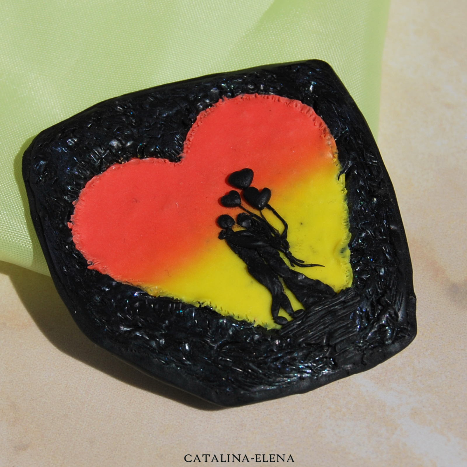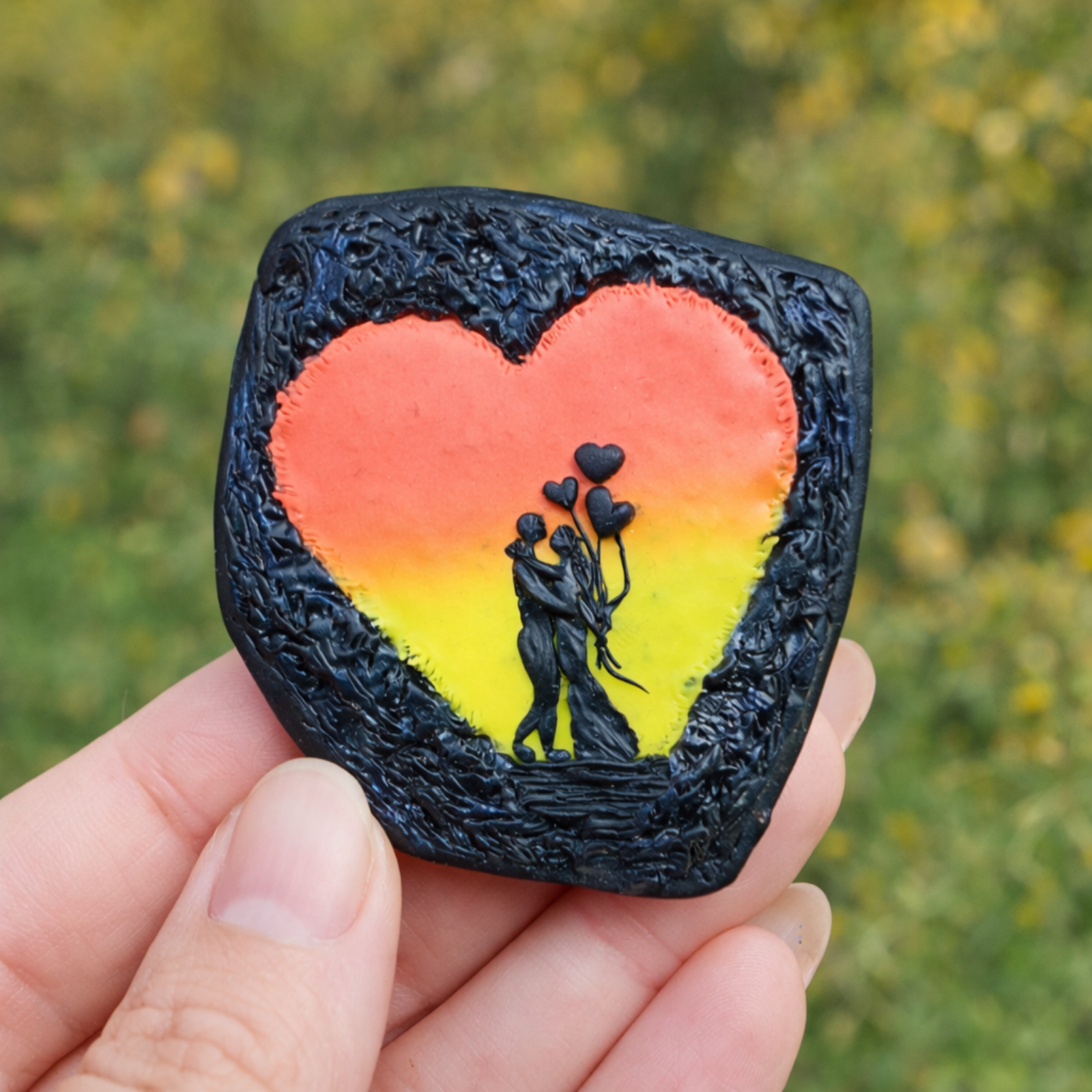 Broșa este realizată manual din argilă polimerică colorată cu pigmenți, cu siluetă de cuplu stilizată în relief.