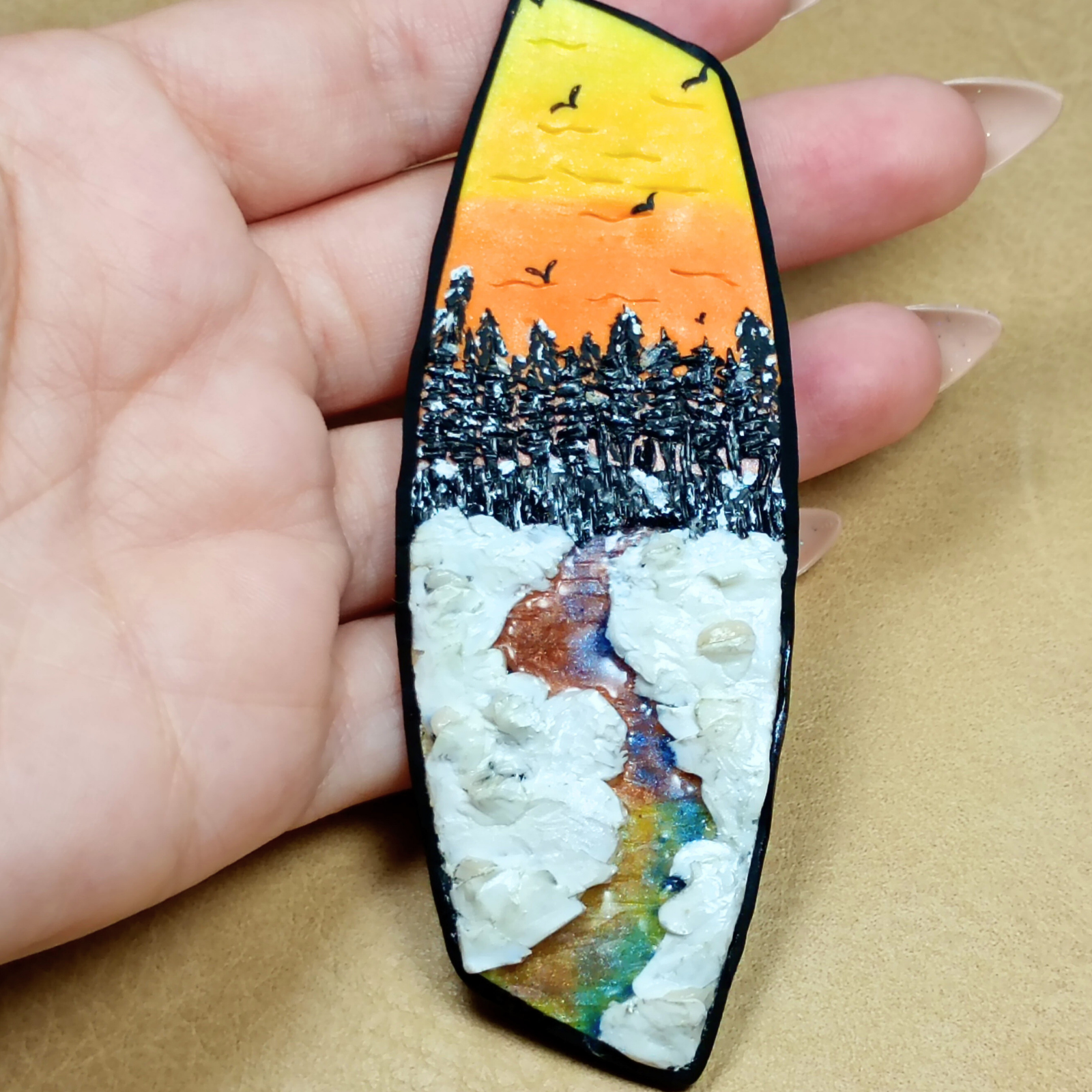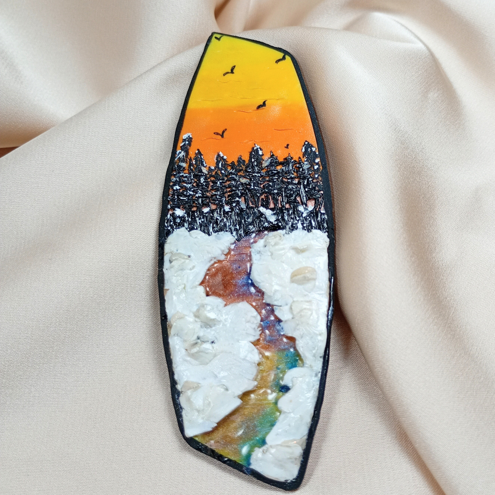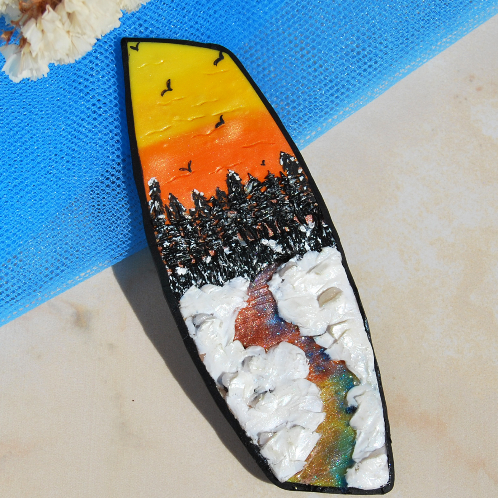 Broșa este realizată manual din argilă polimerică, completată cu rășină și pigmenți pentru efectul de peisaj și luciu.