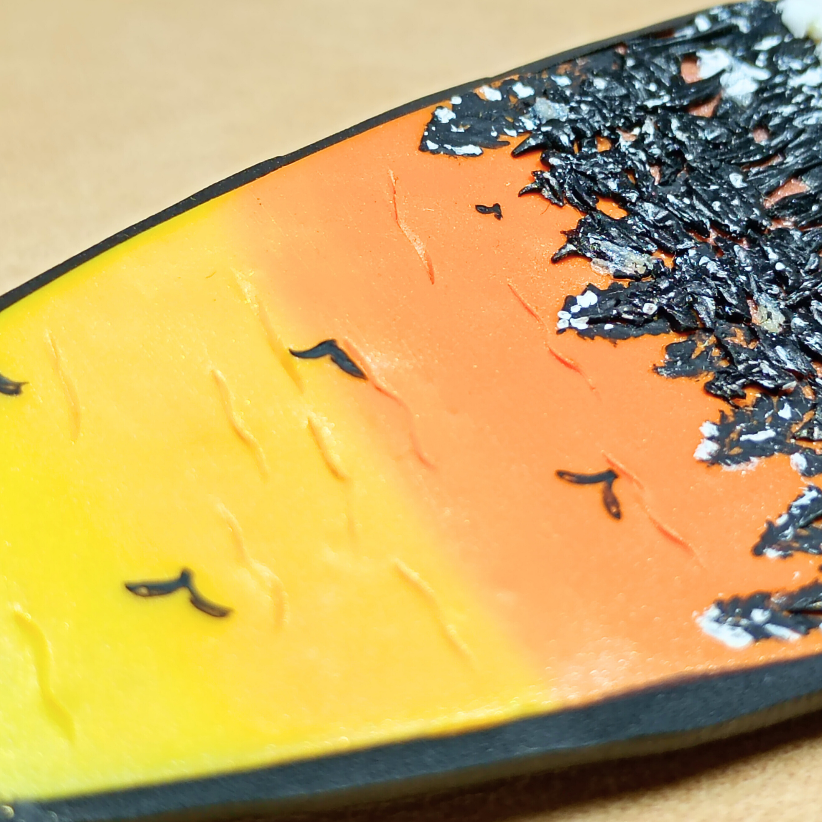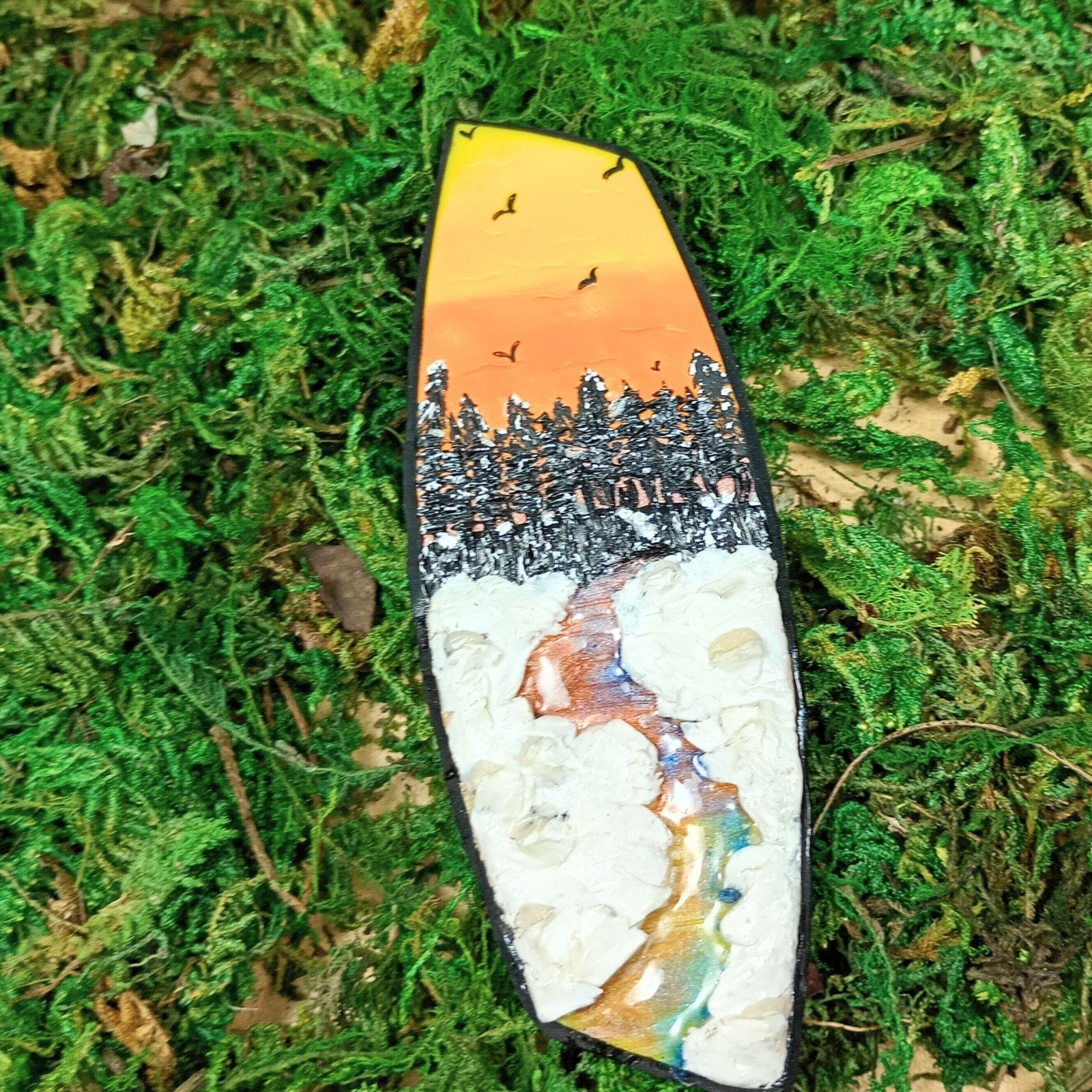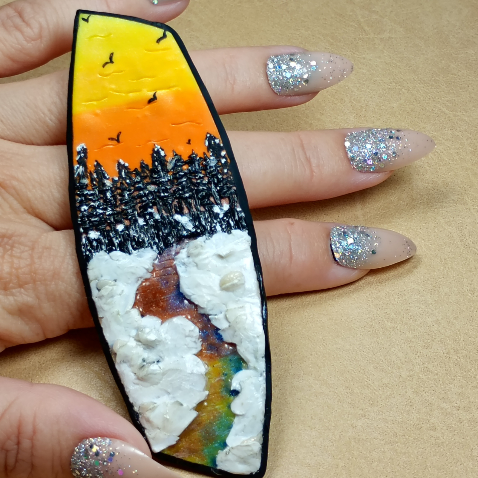 Broșa este realizată manual din argilă polimerică, completată cu rășină și pigmenți pentru efectul de peisaj și luciu.