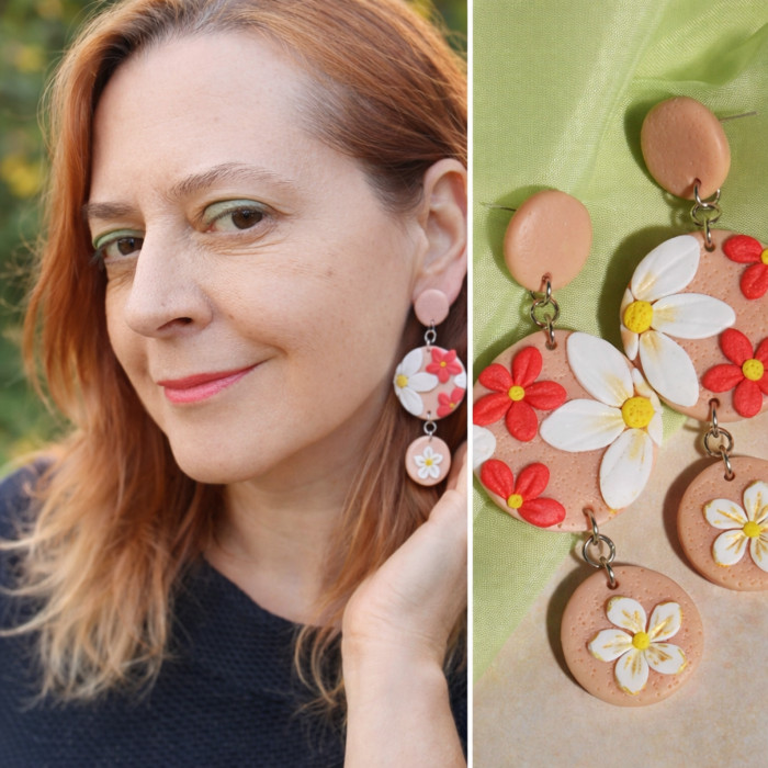 Cerceii lungi din argilă polimerică cu flori albe și corai aduc pe lobul urechii un mic tablou de primăvară, plin de culoare și optimism. Fiecare element este modelat manual: baza într-o nuanță caldă de nude-piersică, apoi florile albe cu mijloc galben și florile corai sunt așezate în relief, petală cu petală, pentru un efect 3D jucăuș. Designul este compus din trei cercuri legate între ele, cu piesa de sus rotundă simplă, un medalion central decorat cu flori mari și un disc inferior cu floare albă delicată, ceea ce creează un joc plăcut de mișcare la fiecare pas. Dimensiunile de 7,6 cm lungime și 3 cm lățime, la doar 5 g/cercel, îi fac vizibili, dar surprinzător de ușori și confortabili la purtare.