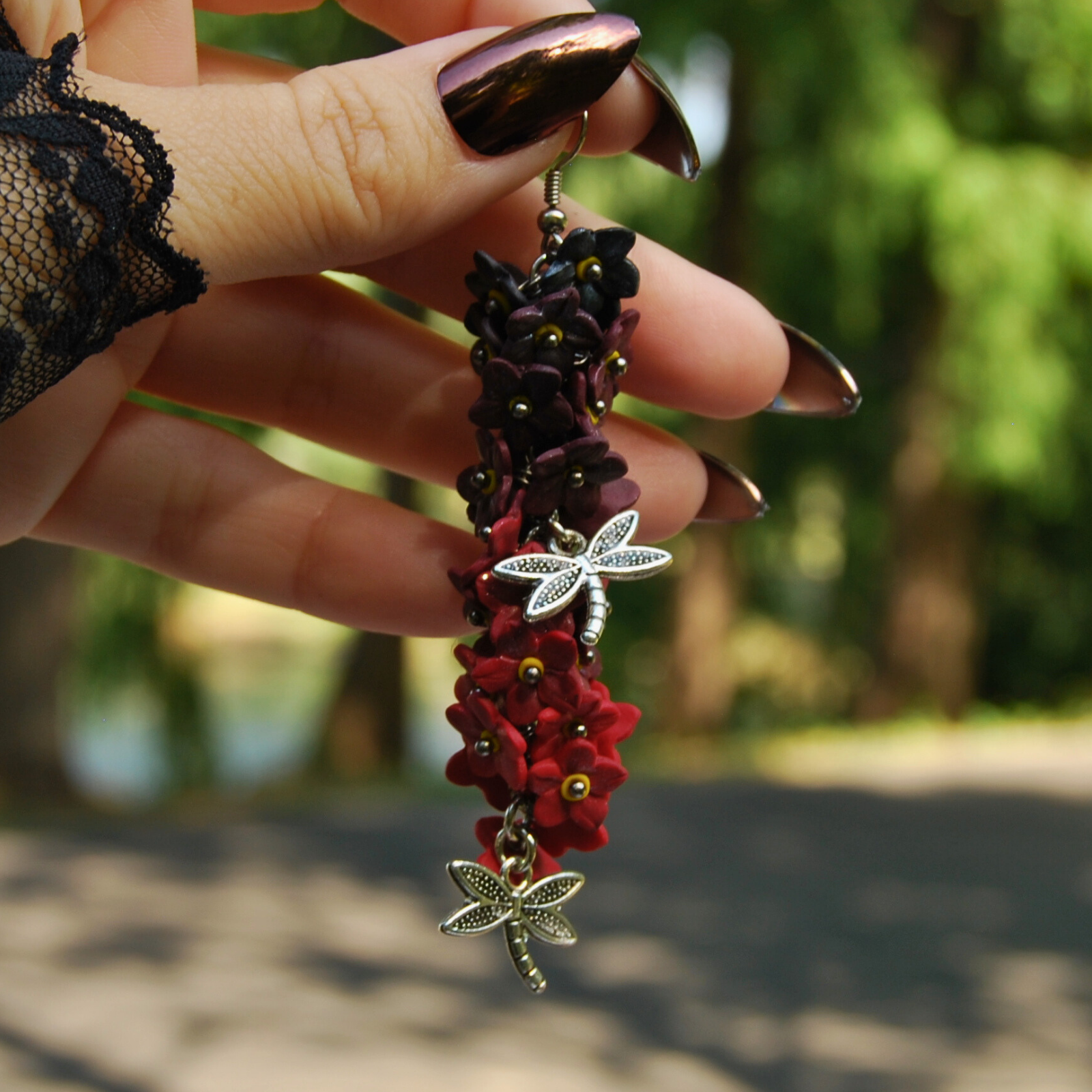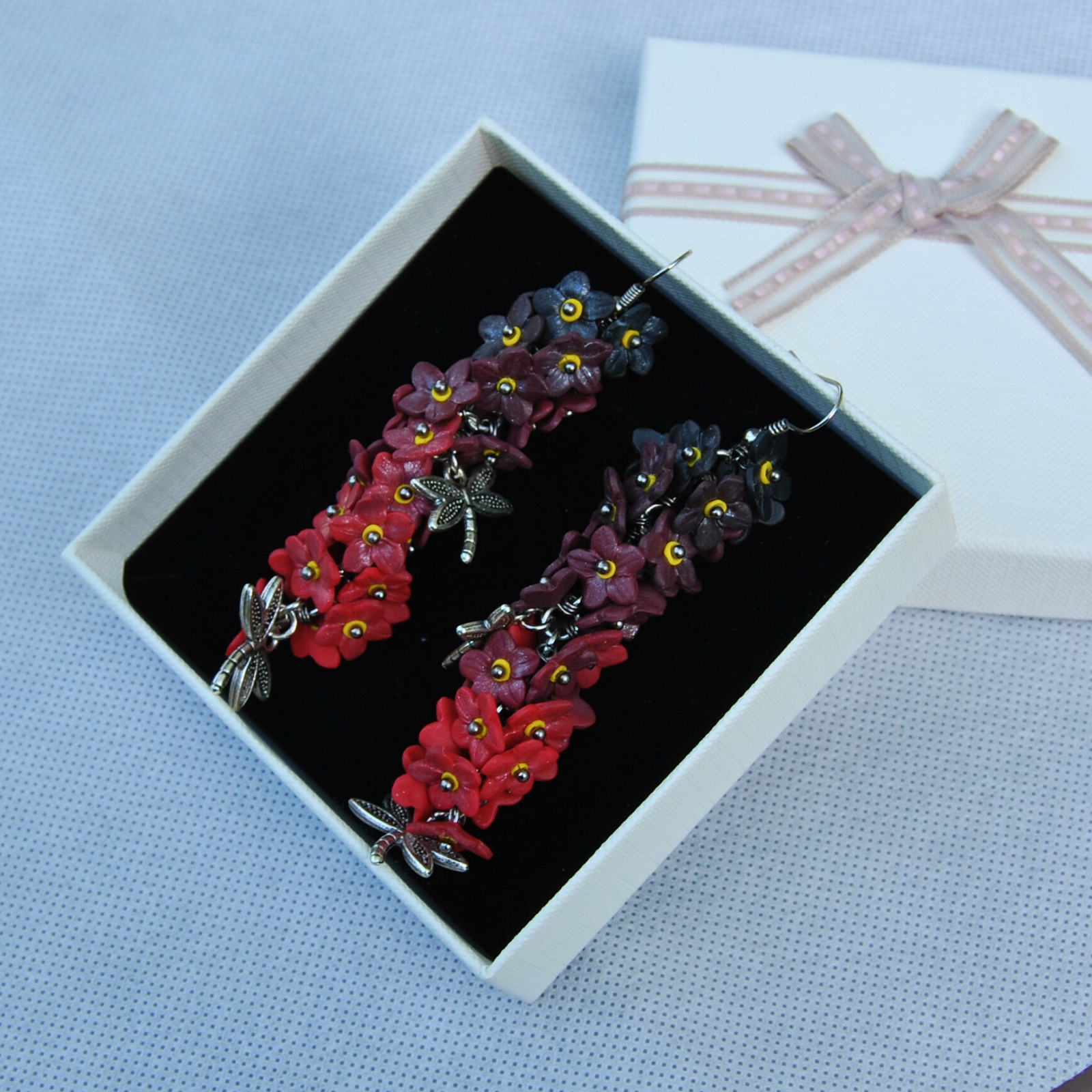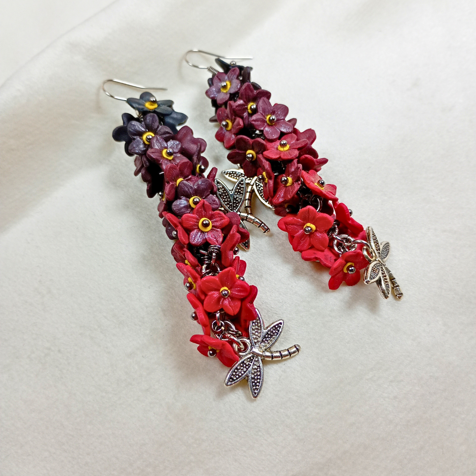 Flori din argilă polimerică și fluturi din aliaj metalic, fiecare piesă fiind lucrată manual.