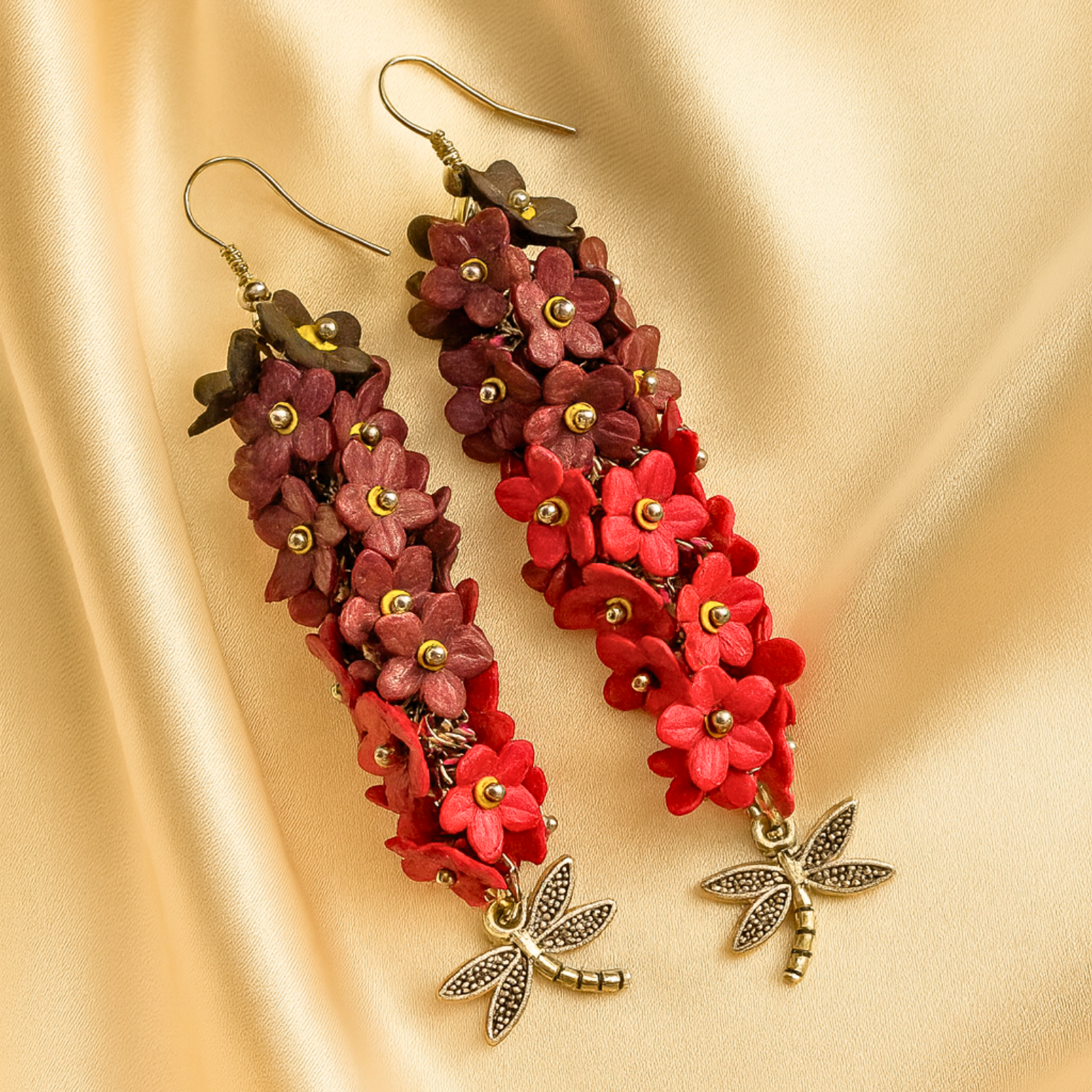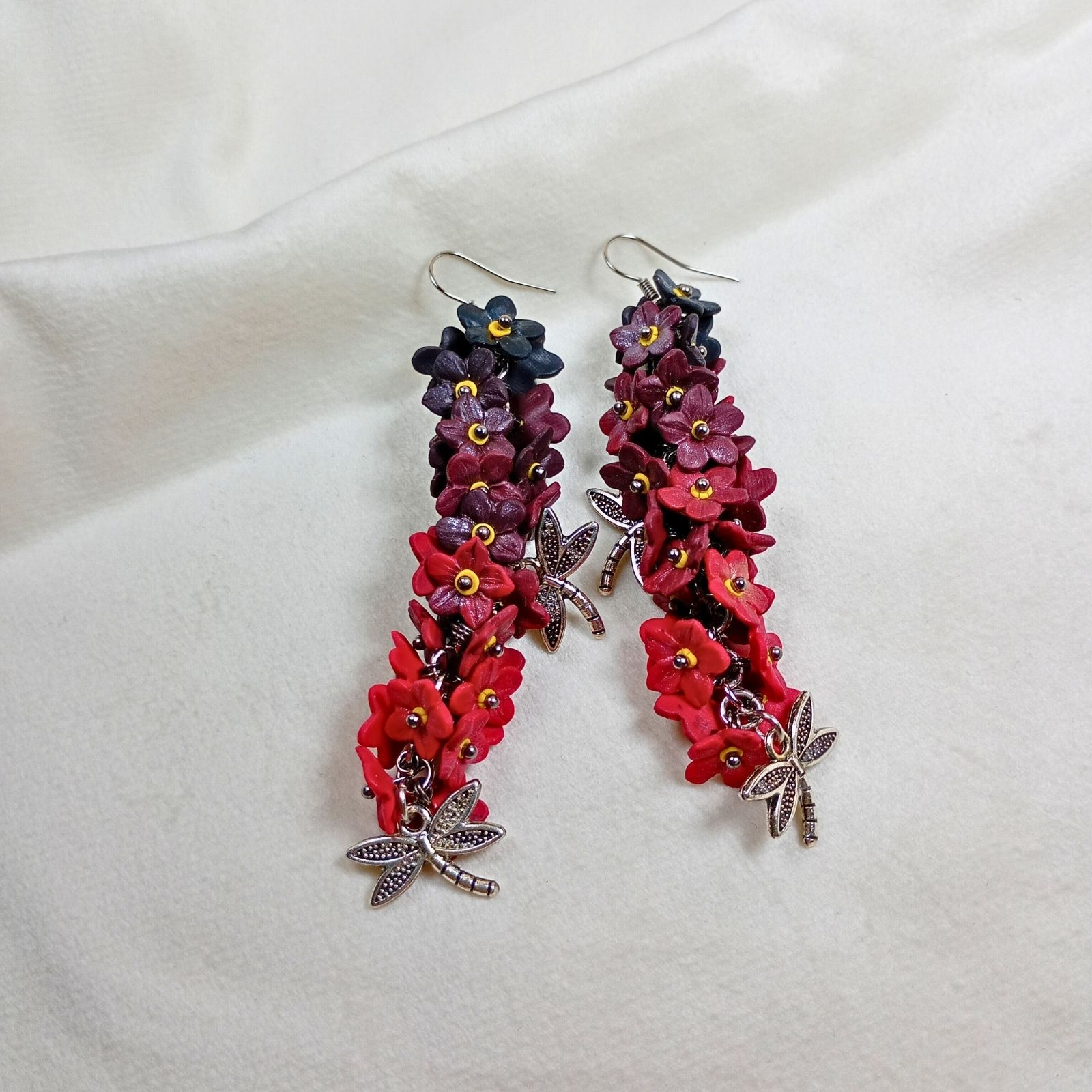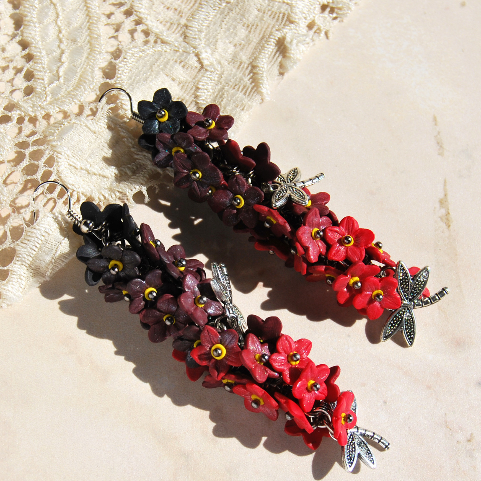 Flori din argilă polimerică și fluturi din aliaj metalic, fiecare piesă fiind lucrată manual.