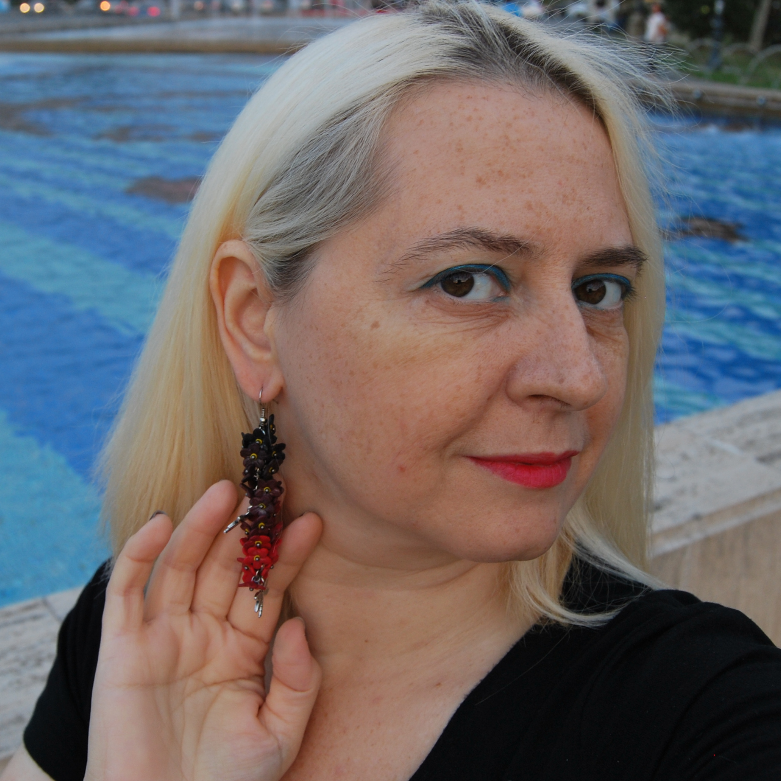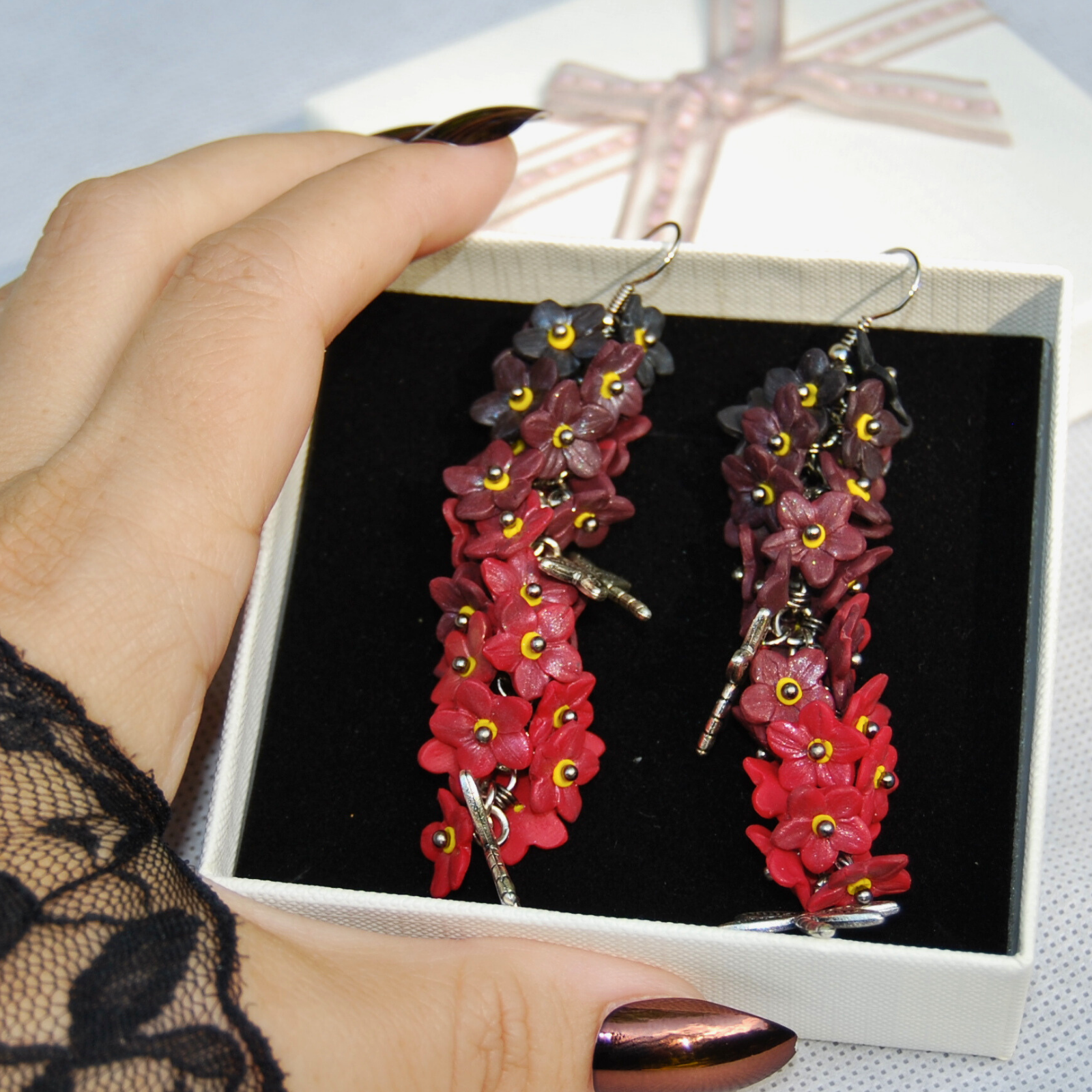 Culori ideale de haine: negru, alb, tonuri neutre — astfel cerceii ies în evidență. Dar arată superb și cu roșu sau bordo, în armonie cu nuanţele florilor.