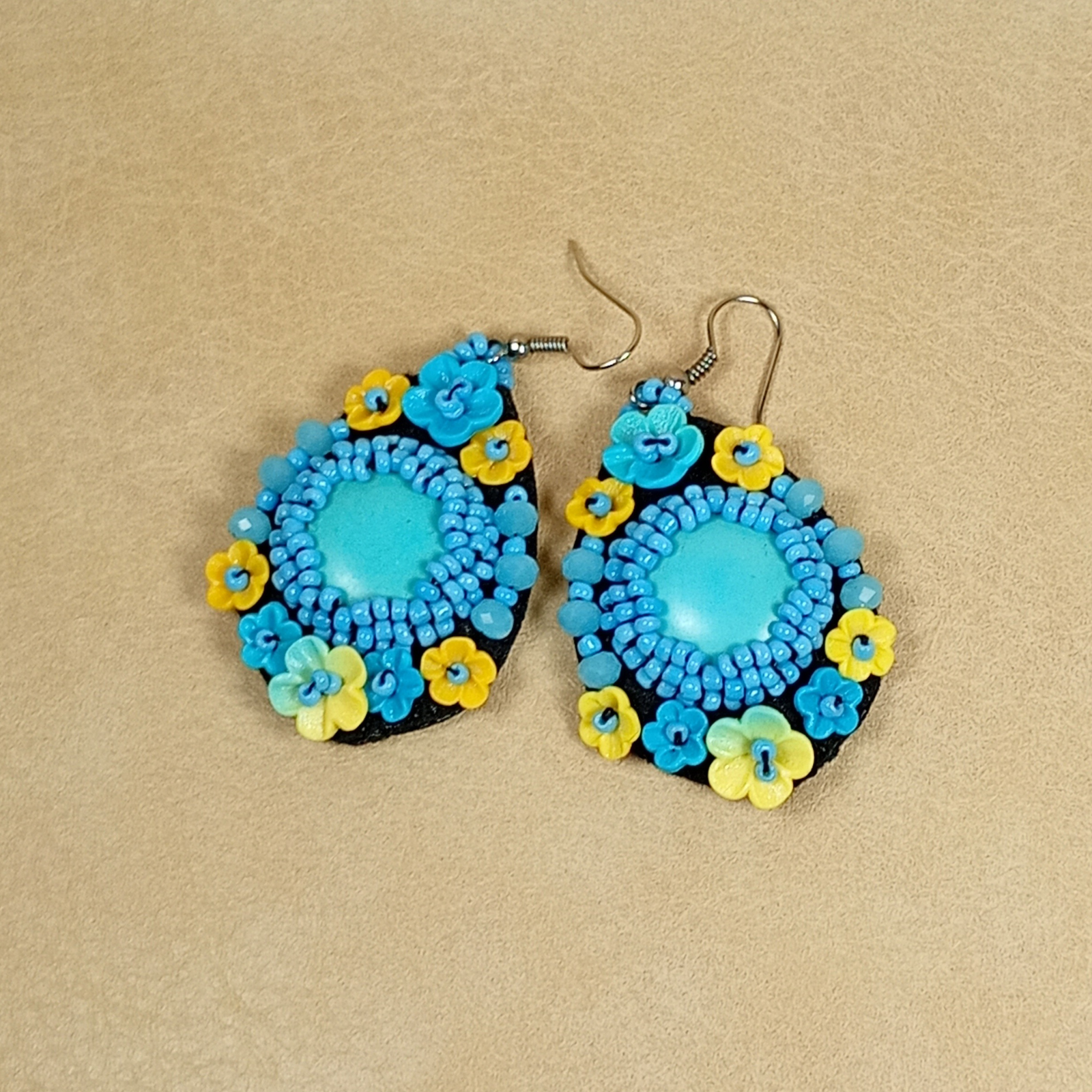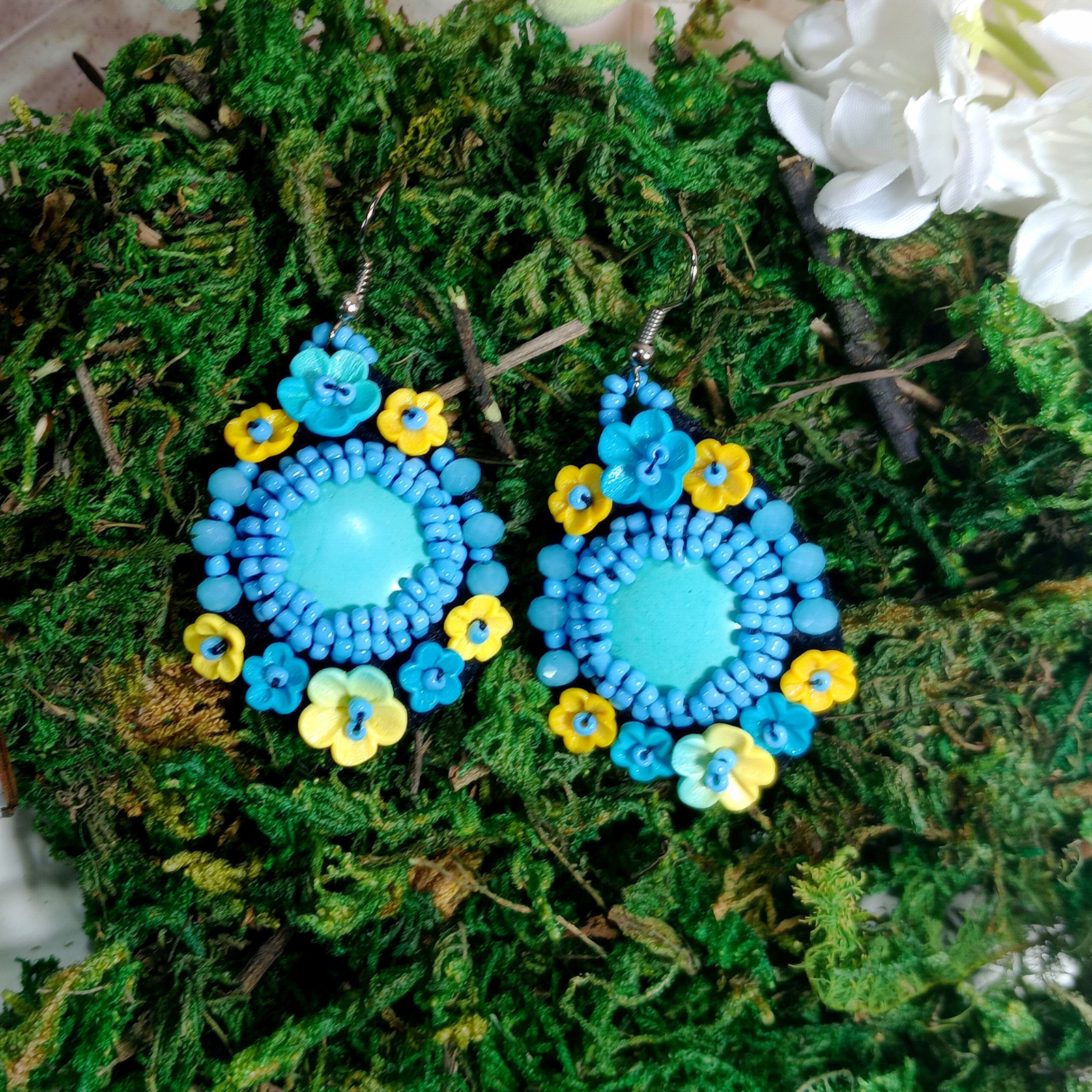 Cercei handmade cu piatră turcoaz și flori modelate manual din argilă polimerică, cu spate din lână pentru confort. Un design boho chic, plin de culoare, ideal pentru a-ți exprima stilul unic sau pentru a fi oferit cadou.