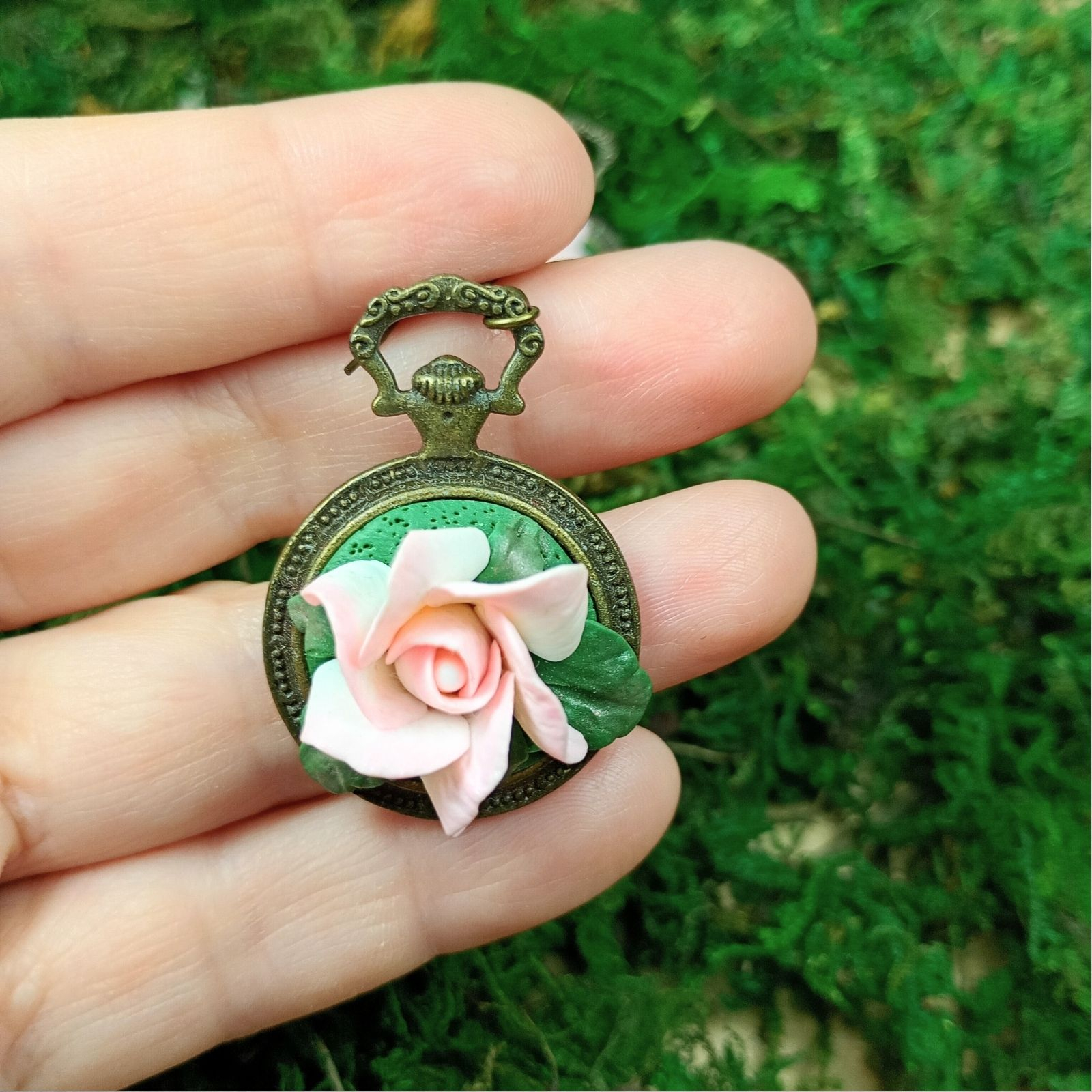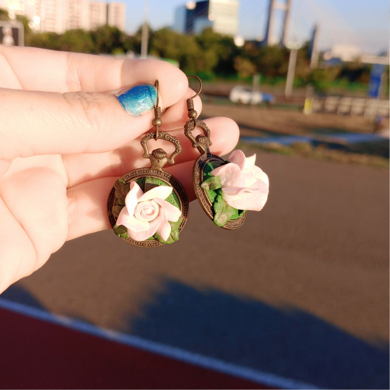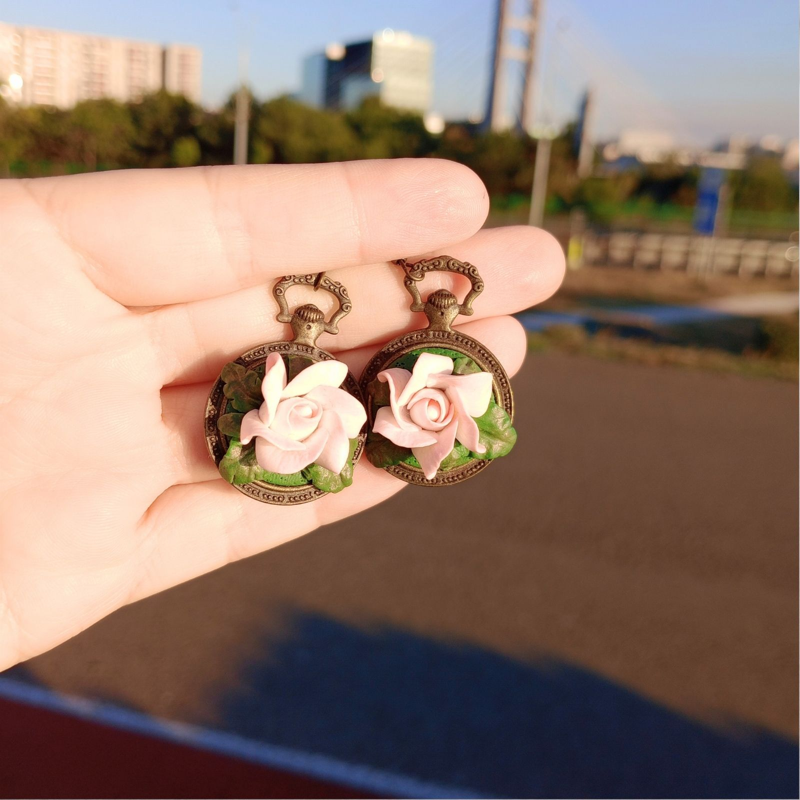 Cerceii vintage cu trandafiri roz spun o poveste romantică: trandafirii din argilă polimerică, modelați manual petală cu petală, par a înflori pe baza din bronz cu aspect antichizat, bogat decorată. Dimensiunile de 5,1 x 2,7 cm și greutatea de 10 g/cercel îi transformă într-o piesă statement, cu prezență vizuală puternică, care completează perfect ținute elegante sau romantice. Baza bronz cu detalii florale și verdele frunzelor scot în evidență rozul delicat al trandafirilor, creând un contrast cald, ușor vintage, ideal pentru iubitoarele de bijuterii cu aer de epocă.
