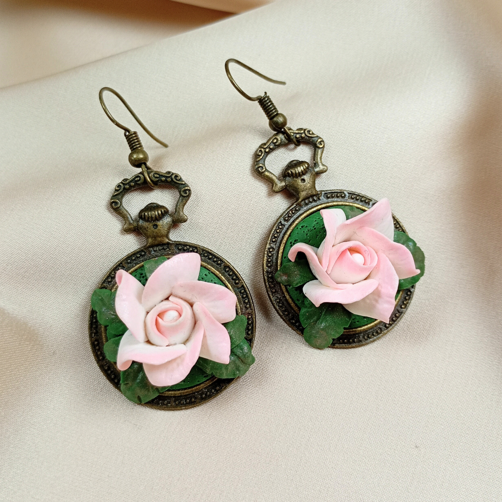 Cerceii sunt realizați manual din argilă polimerică modelată sub formă de trandafir roz, montată pe o bază metalică din bronz cu aspect vintage și tortițe asortate