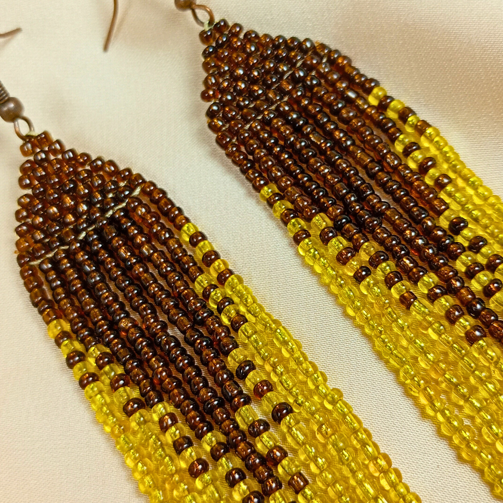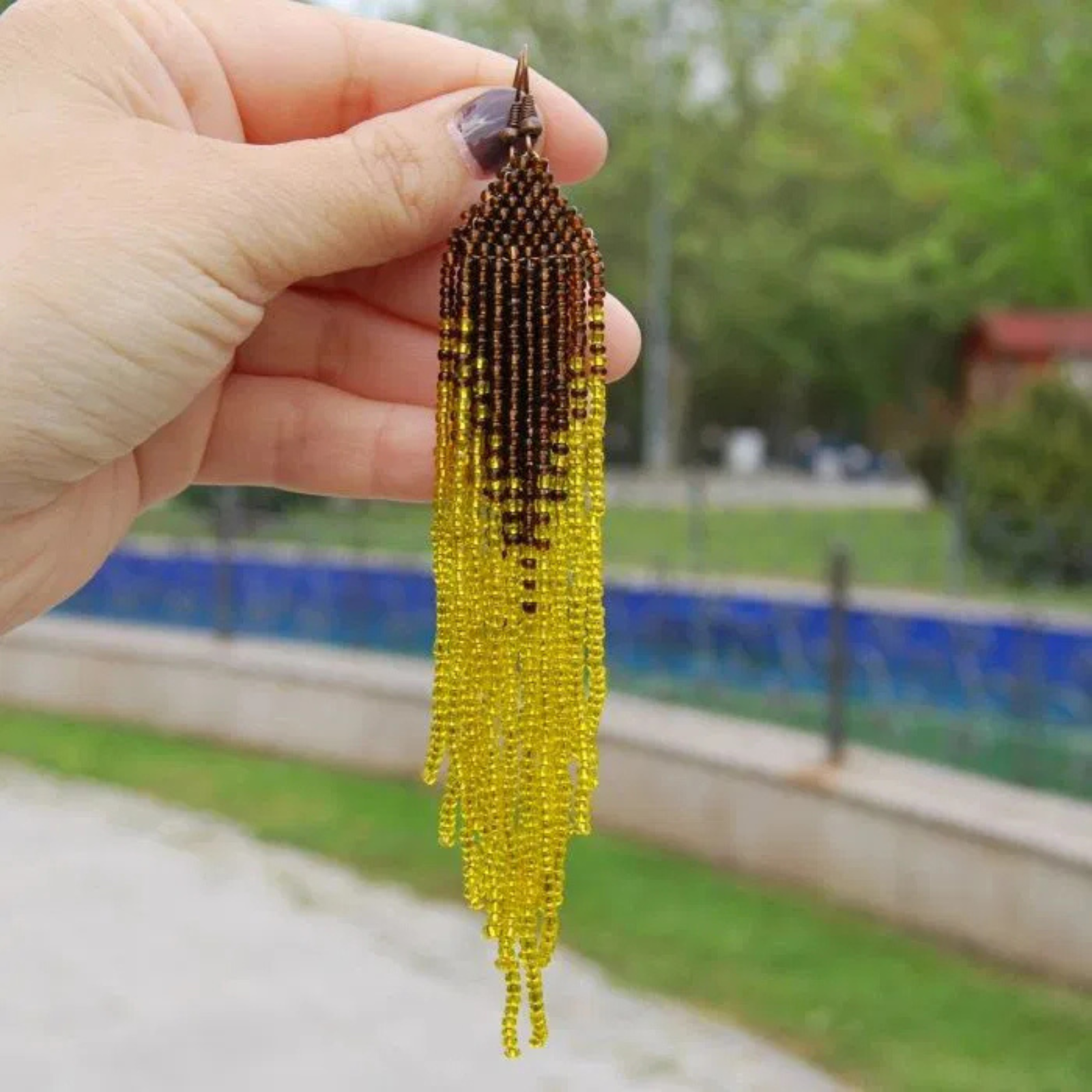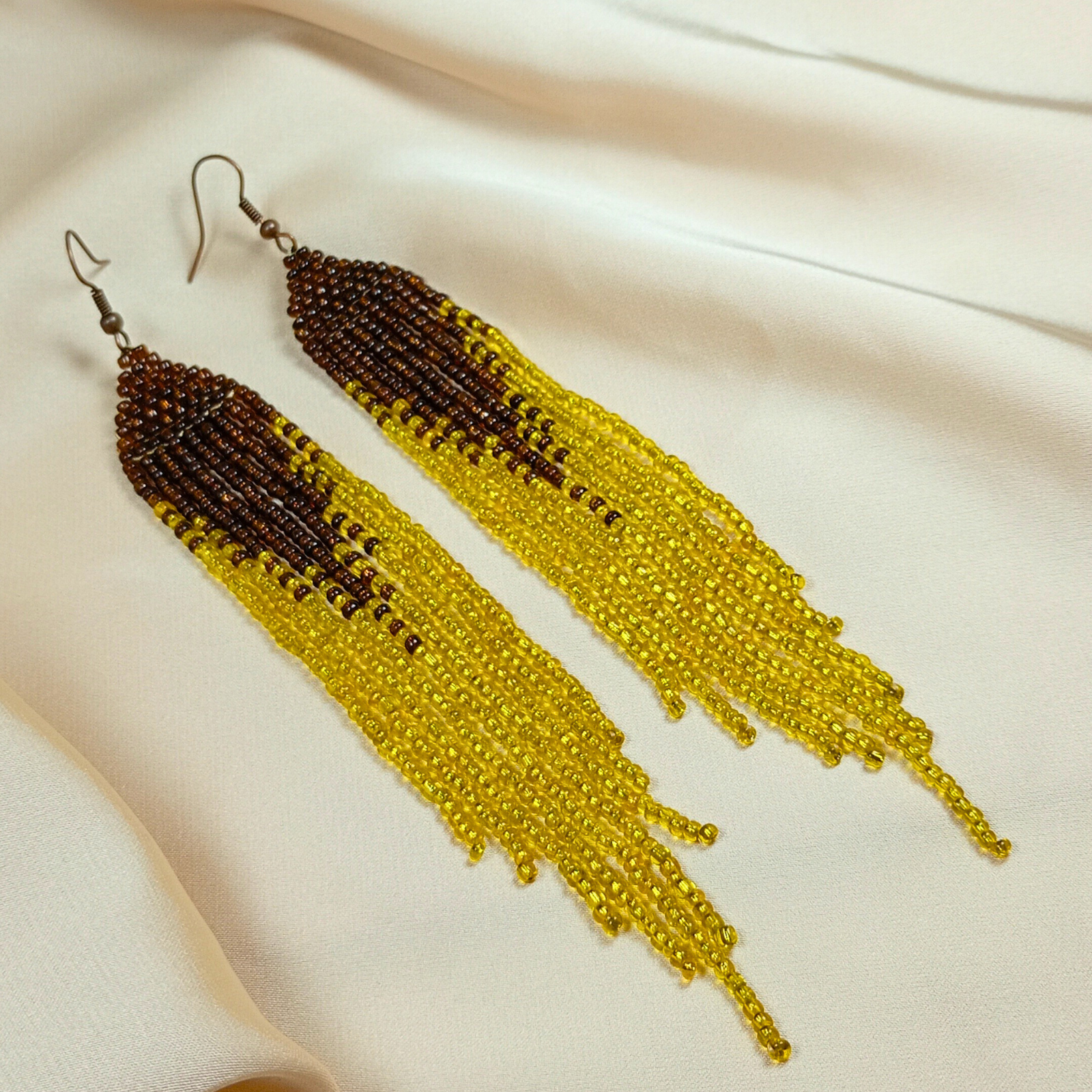 Adaugă un strop de culoare și eleganță ținutelor tale cu acești cercei lungi, confecționați manual din mărgele galbene și maro de sticlă. Designul lor fluid și vibrant adaugă o notă sofisticată oricărei ținute, fiind ideali pentru evenimente speciale sau pentru a evidenția o apariție de zi cu zi.