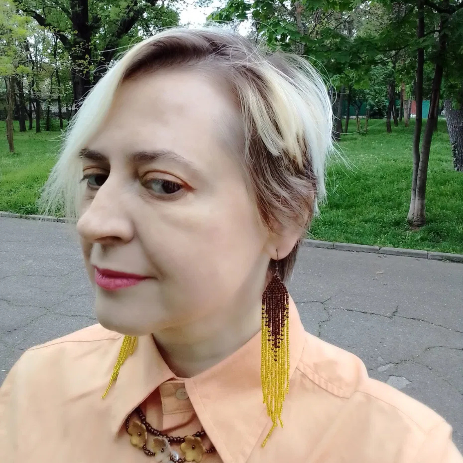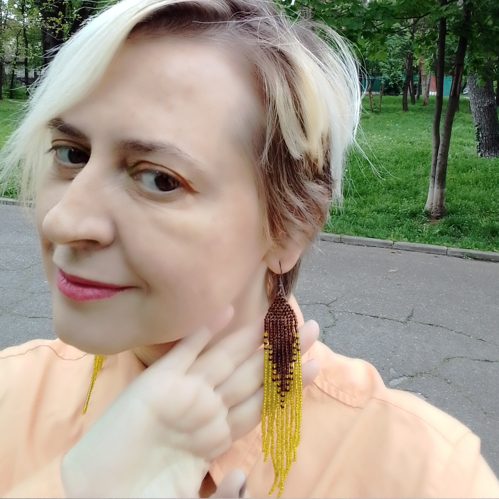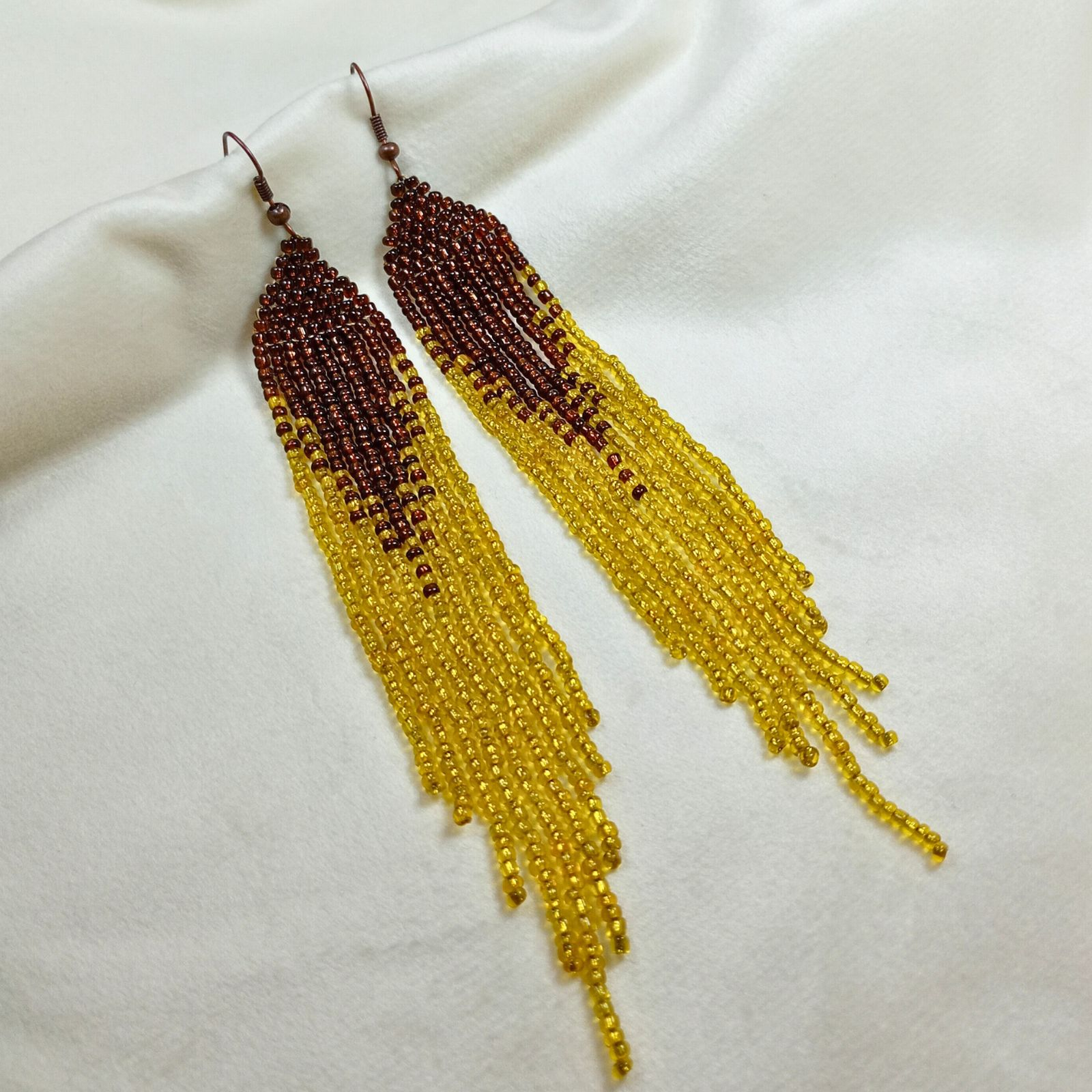 Adaugă un strop de culoare și eleganță ținutelor tale cu acești cercei lungi, confecționați manual din mărgele galbene și maro de sticlă. Designul lor fluid și vibrant adaugă o notă sofisticată oricărei ținute, fiind ideali pentru evenimente speciale sau pentru a evidenția o apariție de zi cu zi.