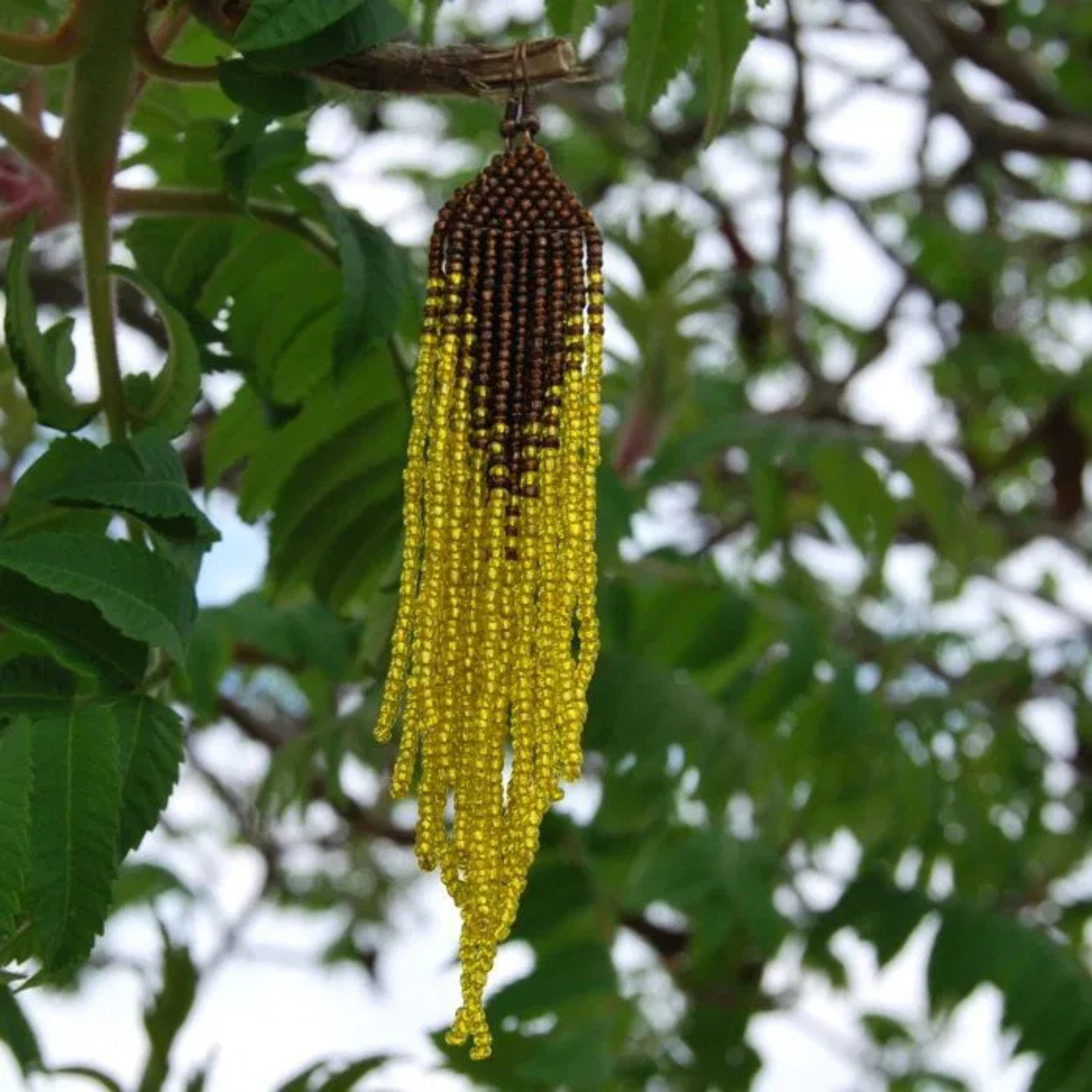 Sunt realizați din mărgele de sticlă galbene și maro, cusute manual, cu tortiță metalică.