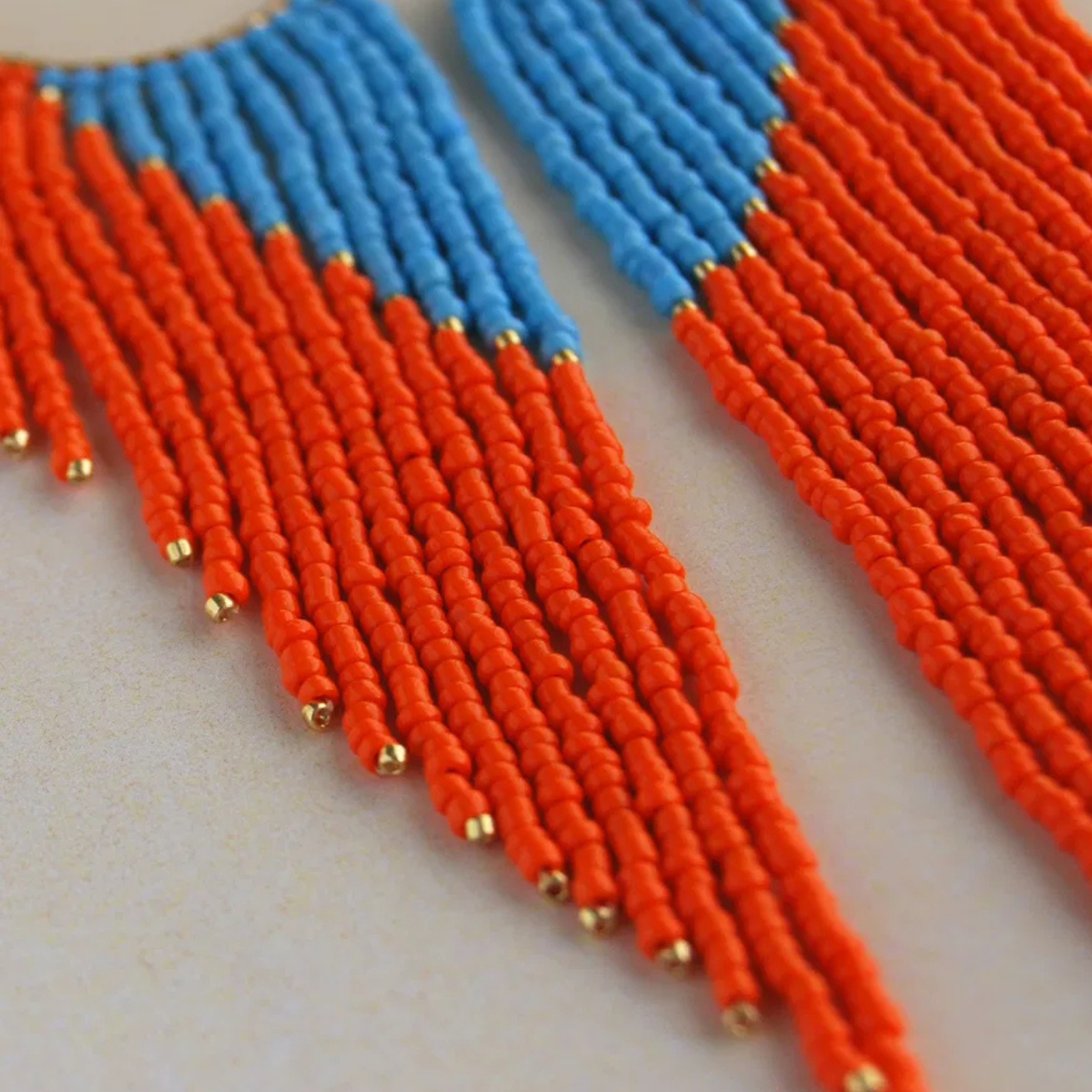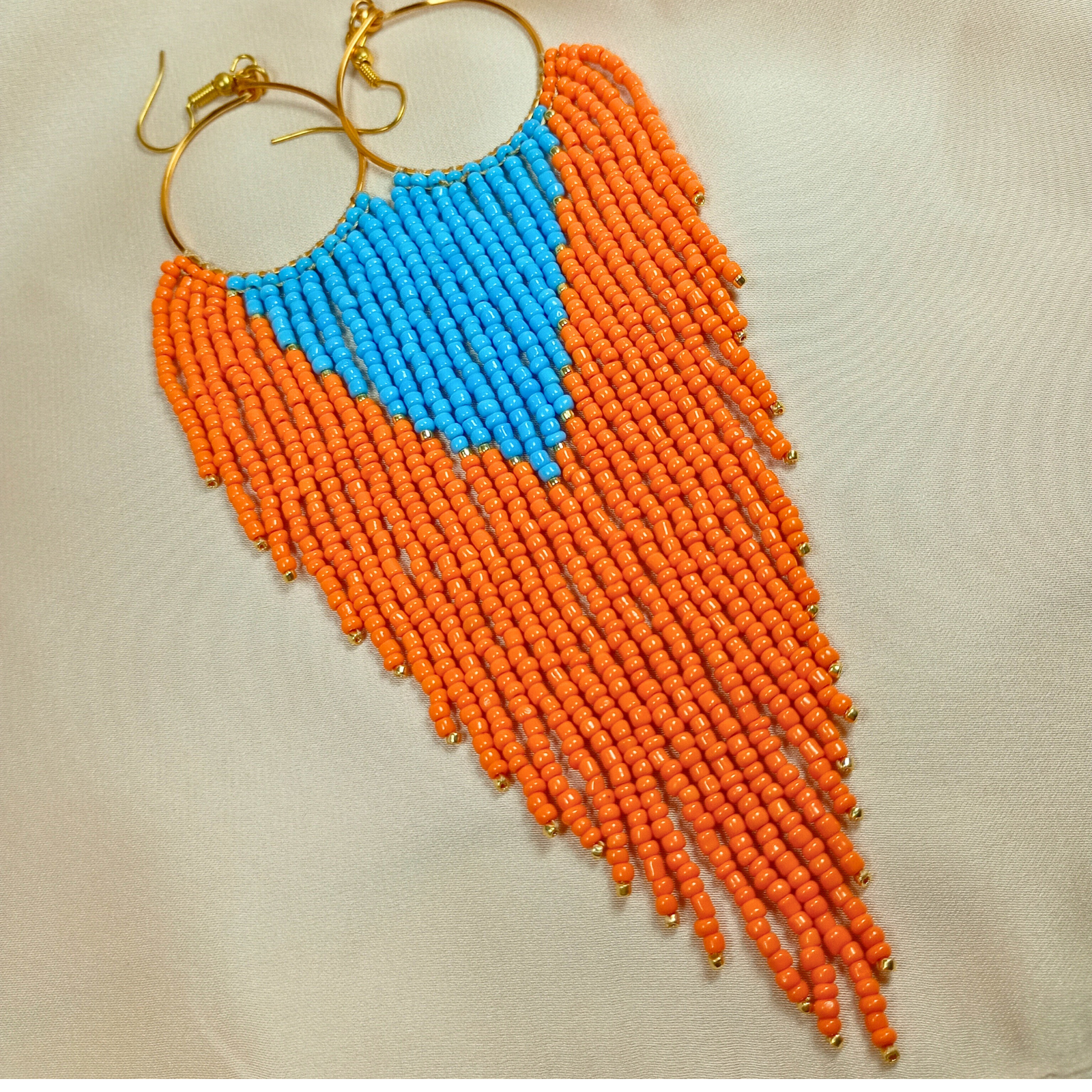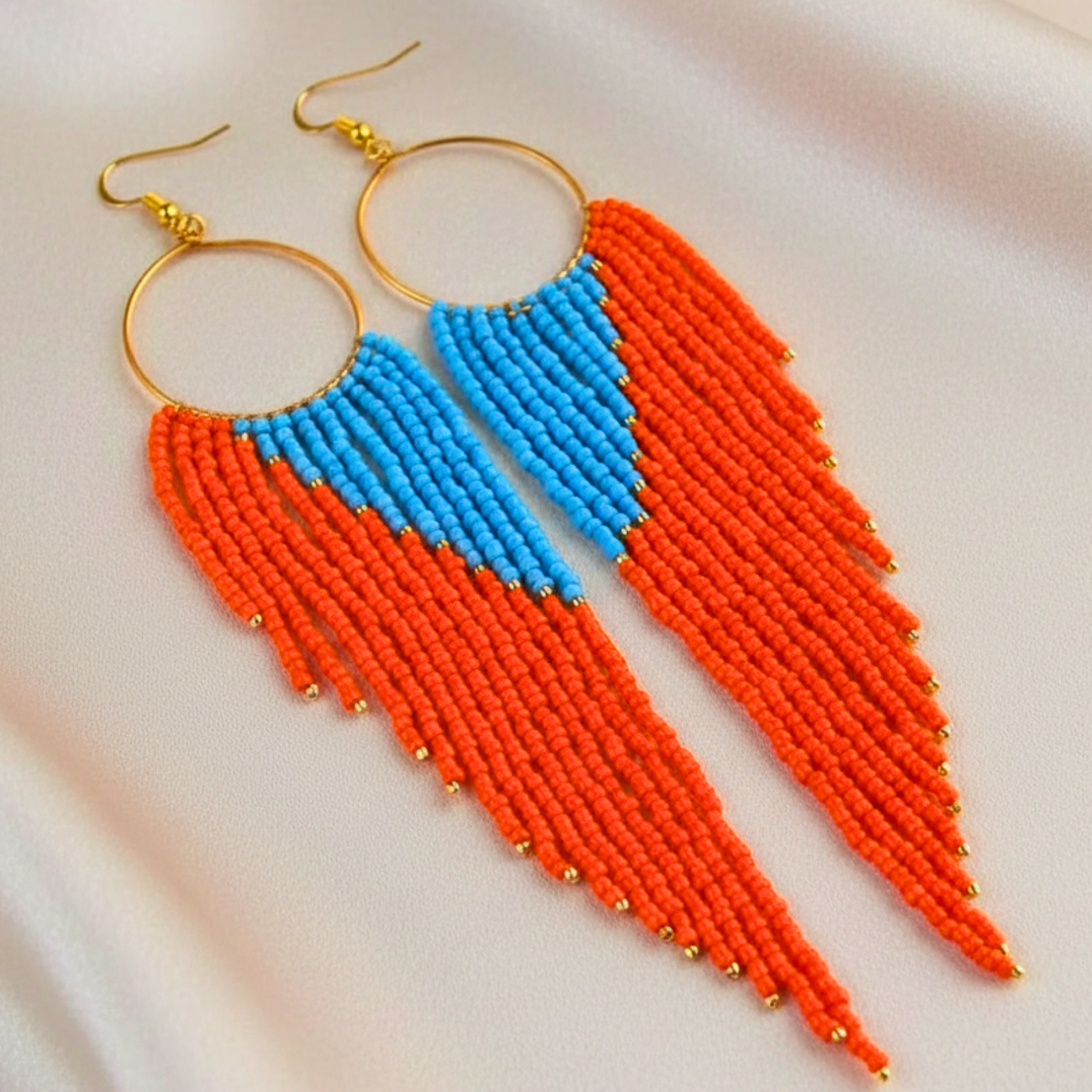 Cerceii sunt lucrati manual pe baza de cerc din sarma gilt aurie, care sustine o tesatura densa de margele de sticla portocalii si bleu, dispuse in V pentru a alungi linia gatului. Franjurii portocalii, accentuati de triunghiul central bleu, se misca fluid la fiecare pas si aduc un plus de energie oricarei tinute. Lungimea impresionanta de aproximativ 16,2 cm si greutatea de circa 9 g pe cercel ii transforma intr-o piesa statement, ideala pentru persoanele care iubesc culorile intense si accesoriile de impact.