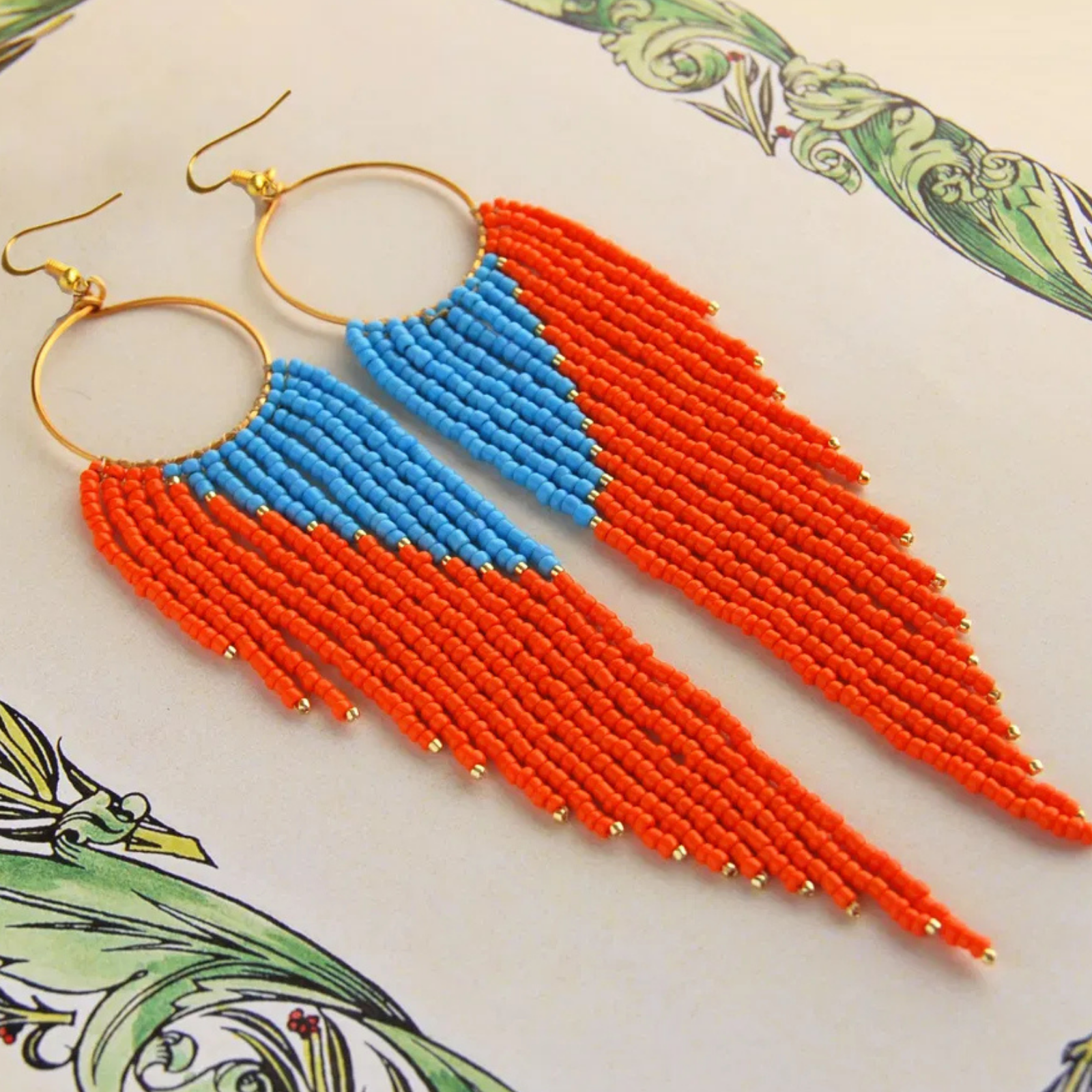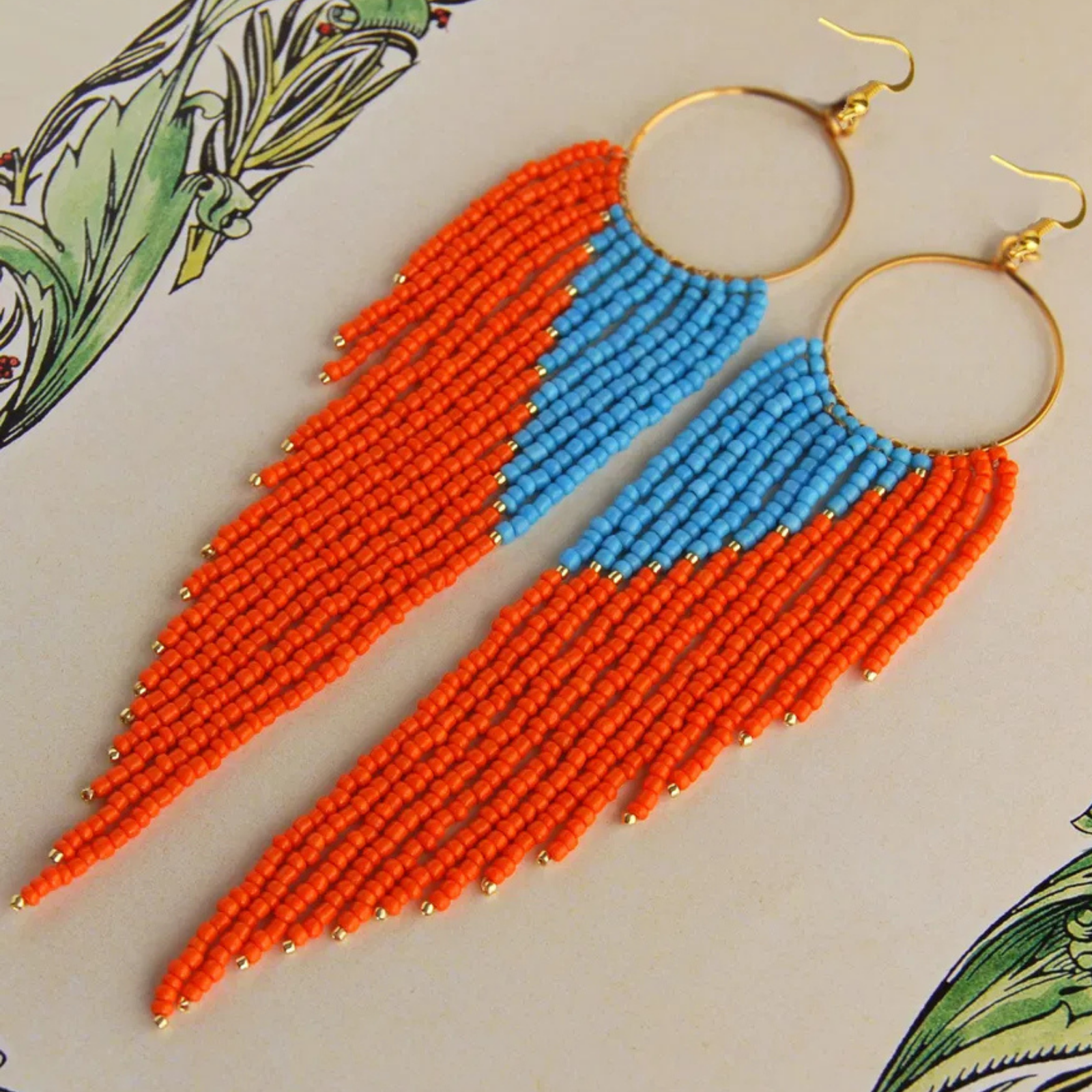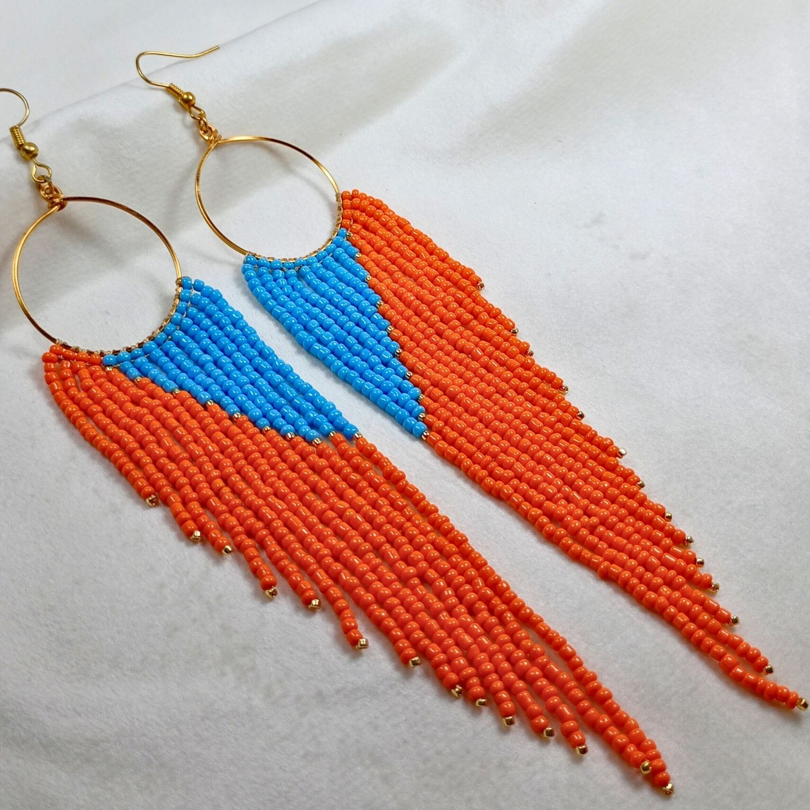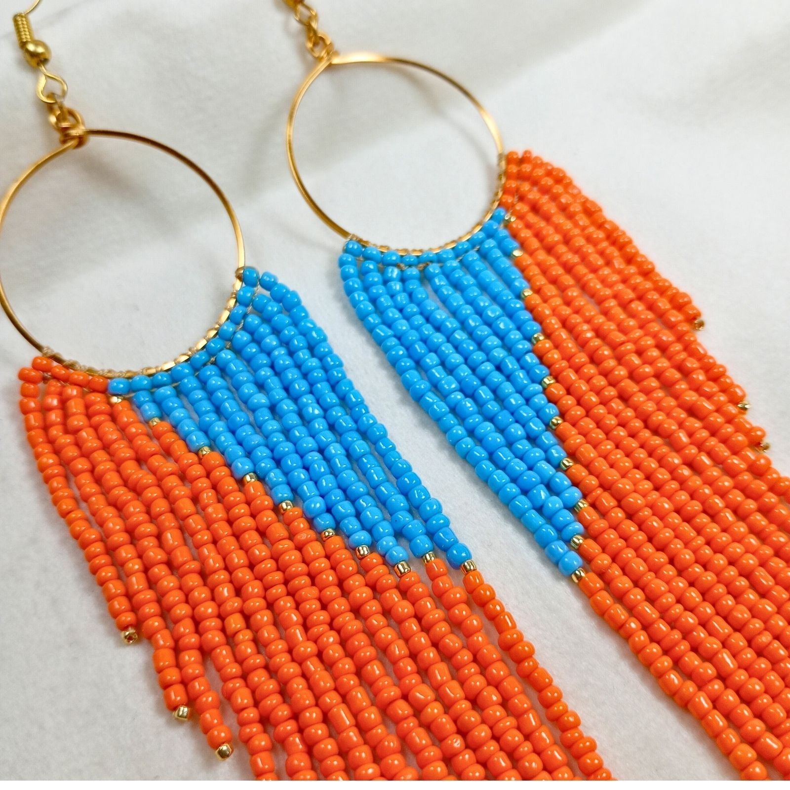 Cerceii sunt lucrati manual pe baza de cerc din sarma gilt aurie, care sustine o tesatura densa de margele de sticla portocalii si bleu, dispuse in V pentru a alungi linia gatului. Franjurii portocalii, accentuati de triunghiul central bleu, se misca fluid la fiecare pas si aduc un plus de energie oricarei tinute. Lungimea impresionanta de aproximativ 16,2 cm si greutatea de circa 9 g pe cercel ii transforma intr-o piesa statement, ideala pentru persoanele care iubesc culorile intense si accesoriile de impact.