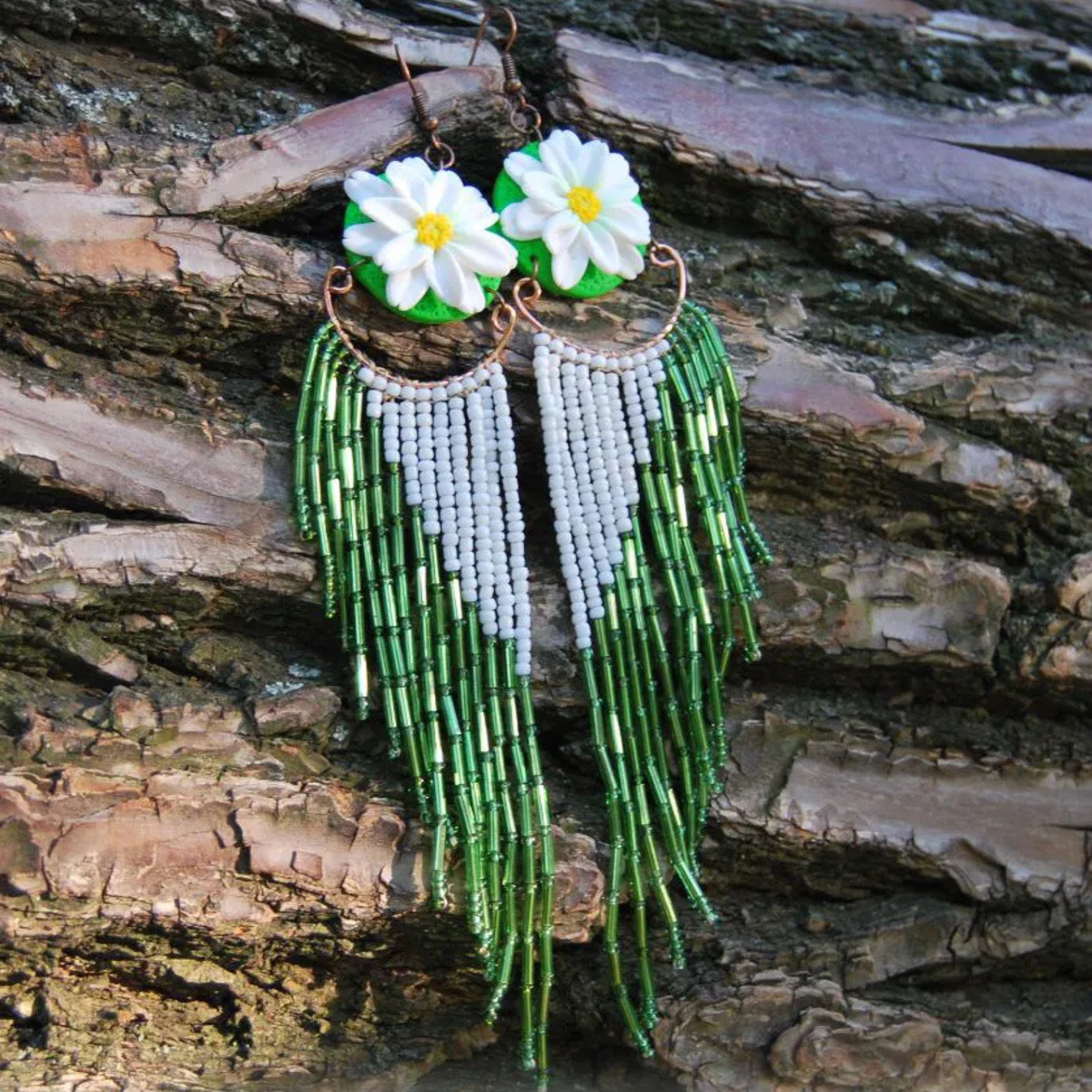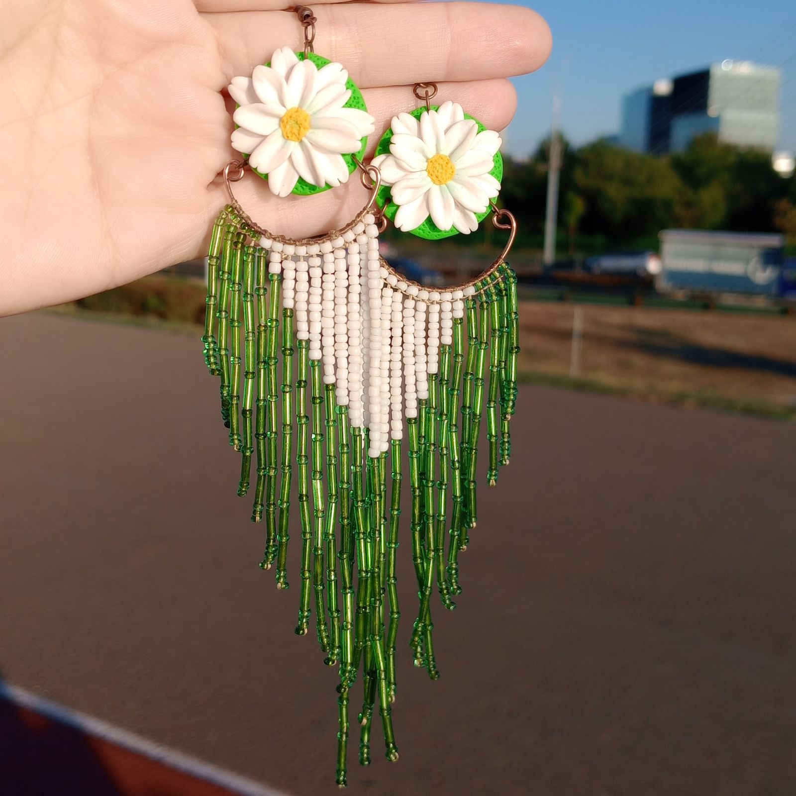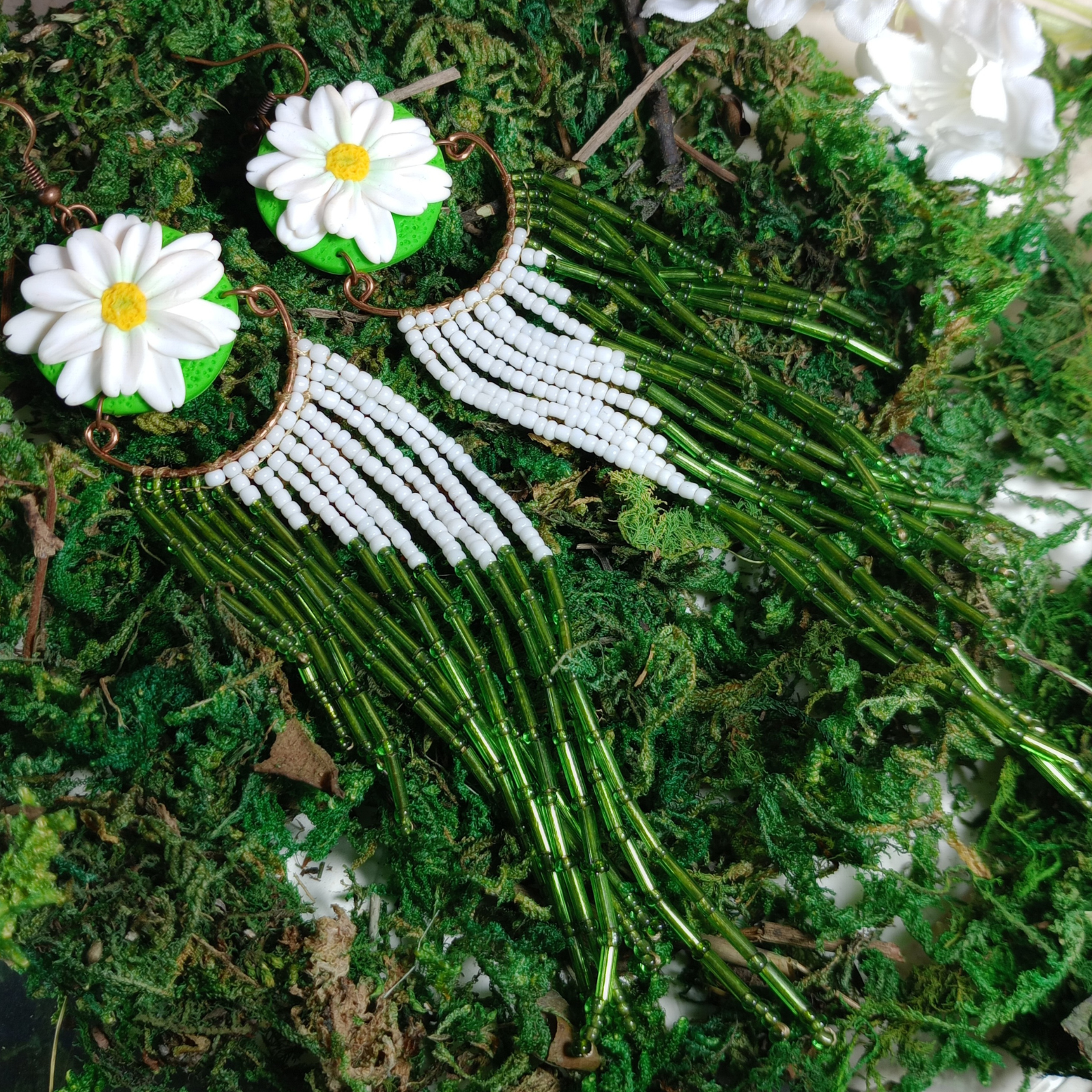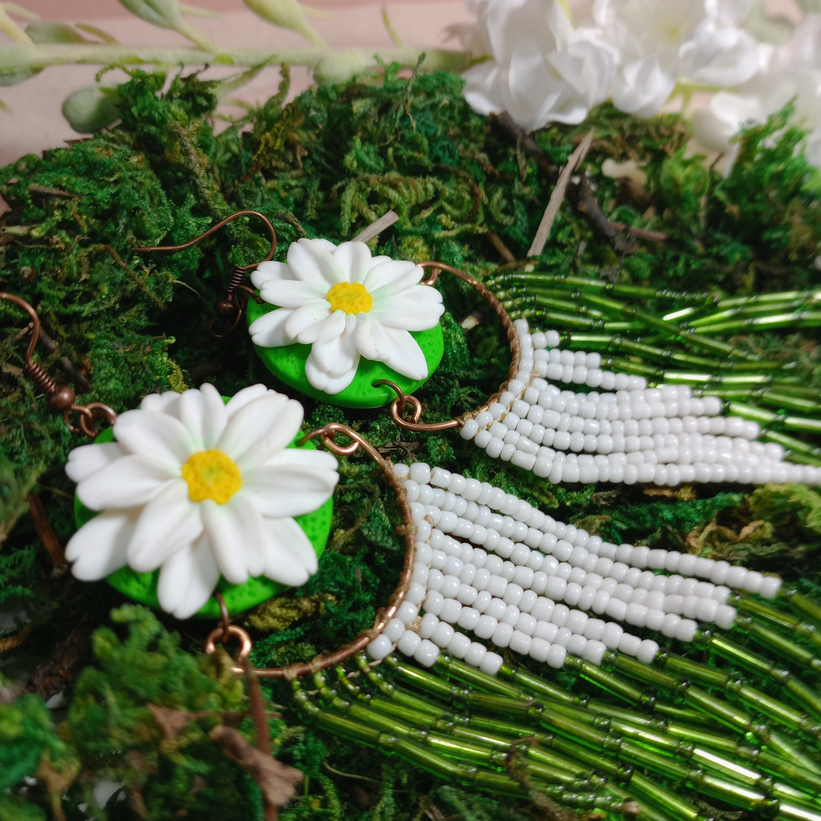 Eleganți, feminini și spectaculoși, acești cercei lungi cu margarete sunt creați manual cu migală, pentru a aduce un strop de natură și rafinament în garderoba ta. Designul vertical, cu flori albe, atrage imediat privirile și conferă un efect de alungire elegantă a gâtului.