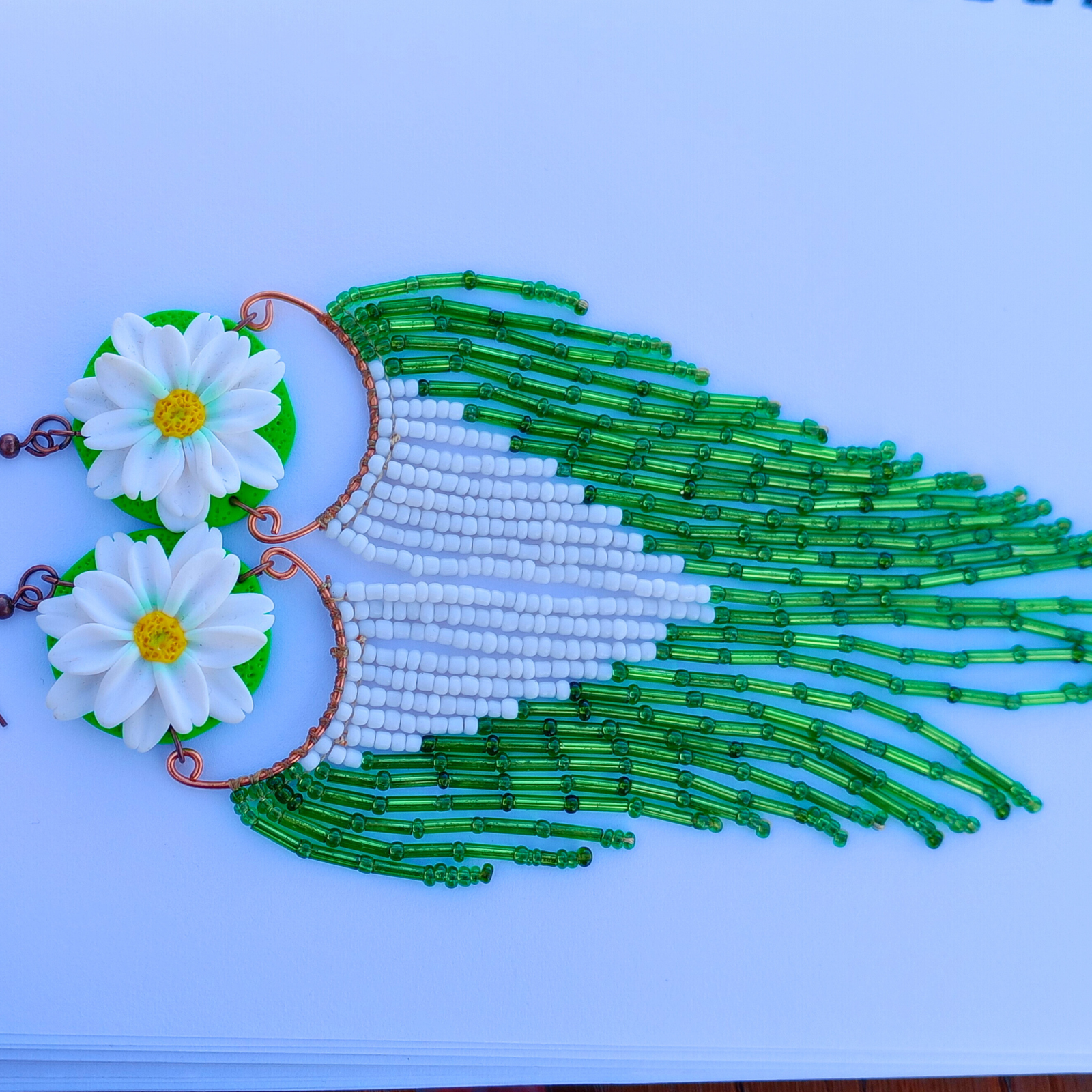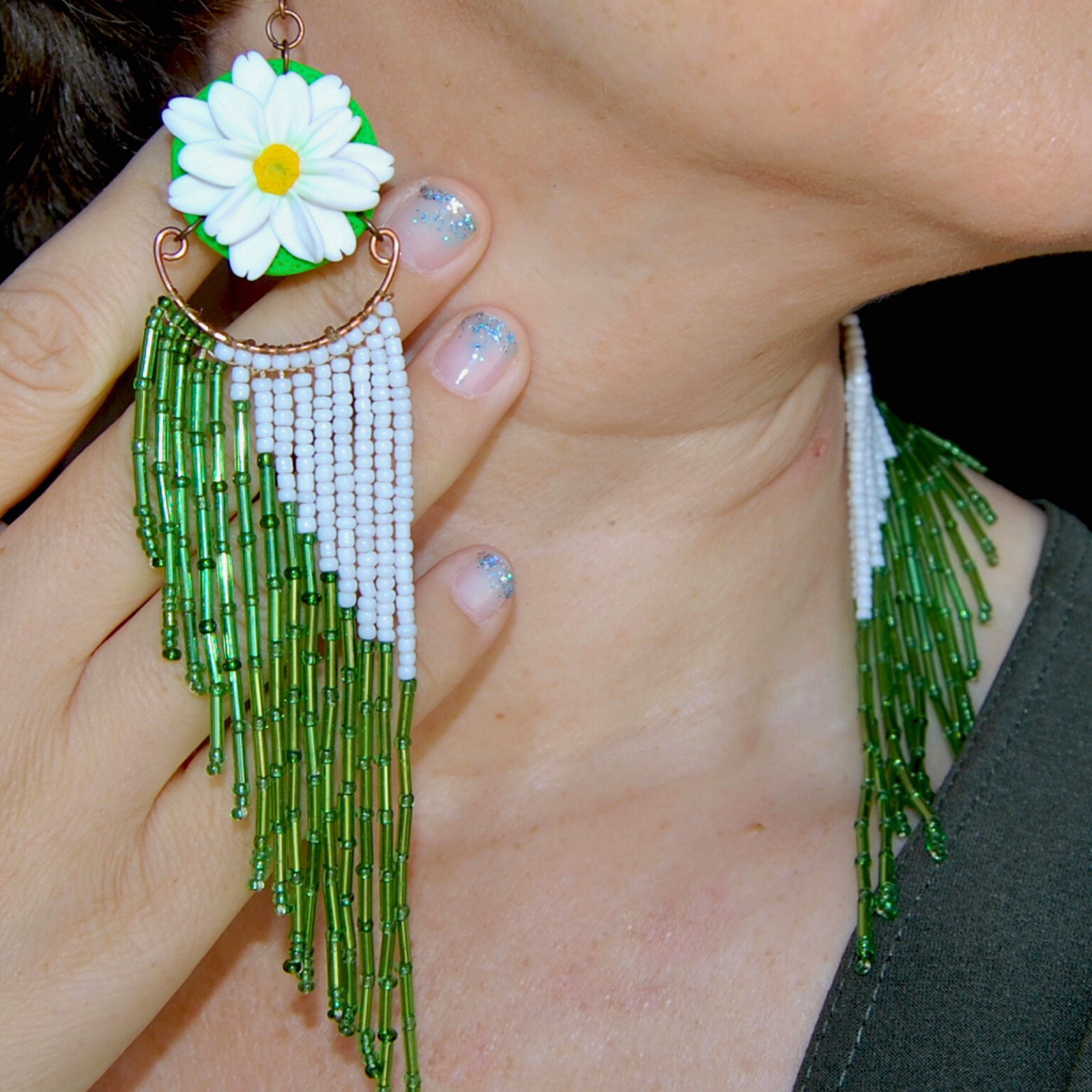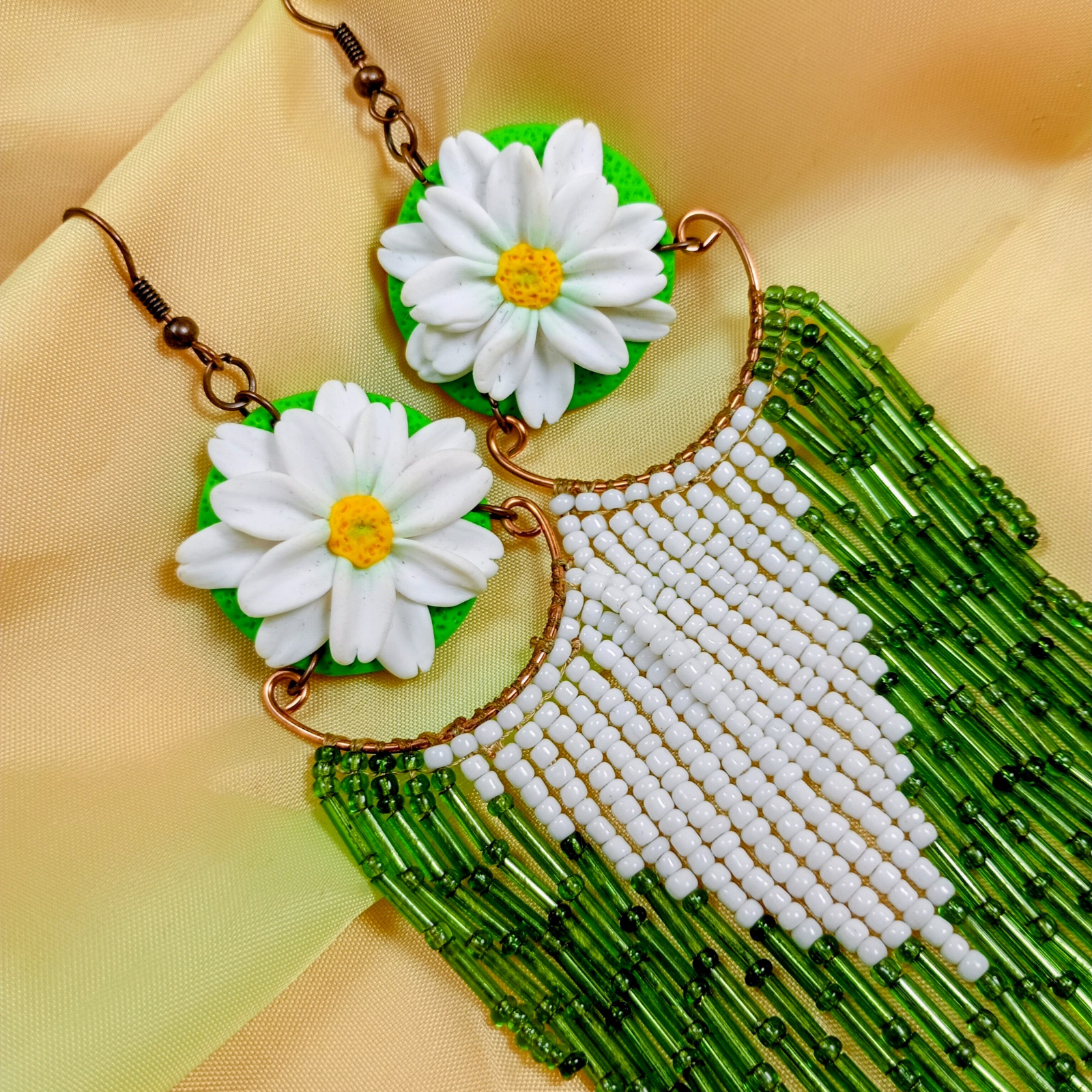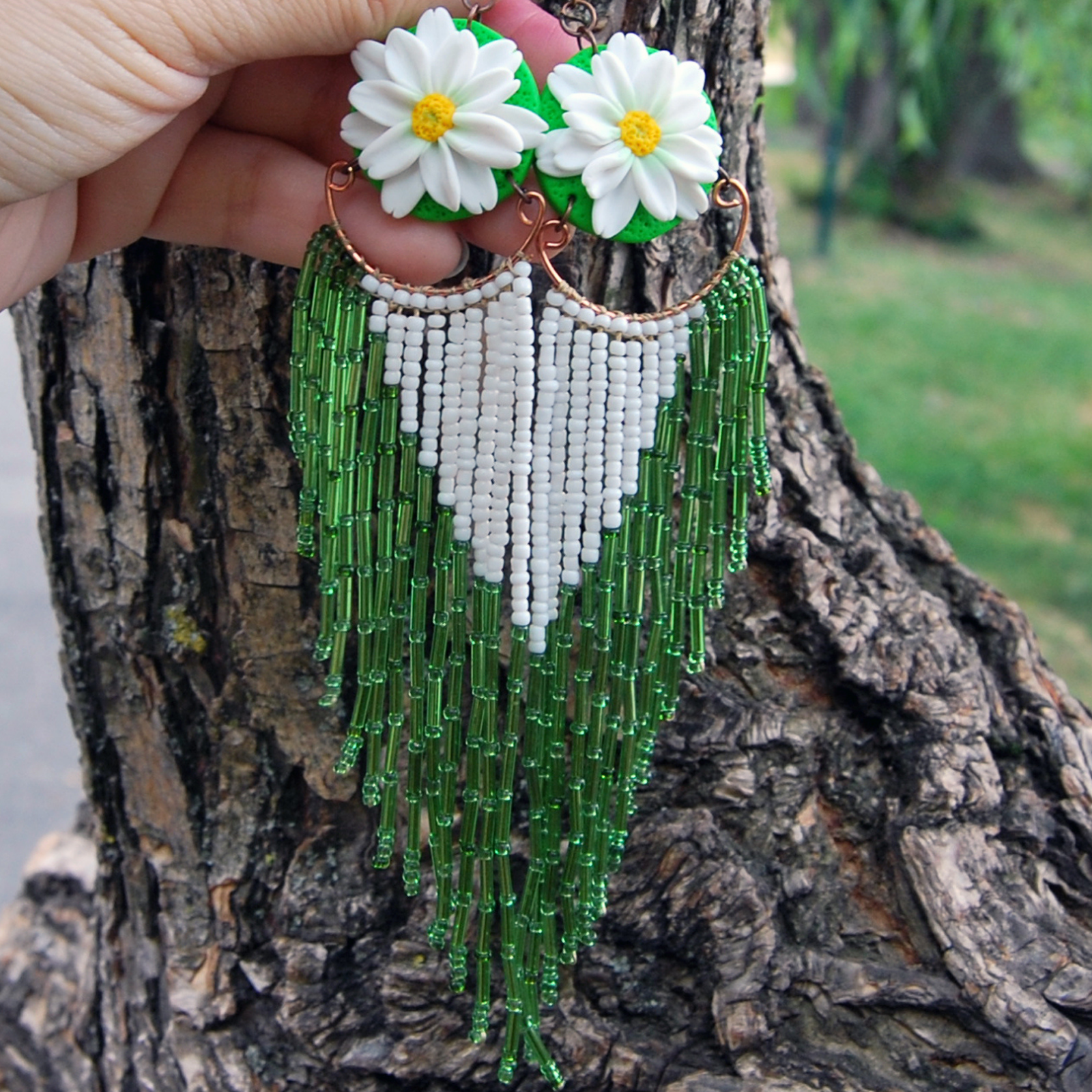 Eleganți, feminini și spectaculoși, acești cercei lungi cu margarete sunt creați manual cu migală, pentru a aduce un strop de natură și rafinament în garderoba ta. Designul vertical, cu flori albe, atrage imediat privirile și conferă un efect de alungire elegantă a gâtului.