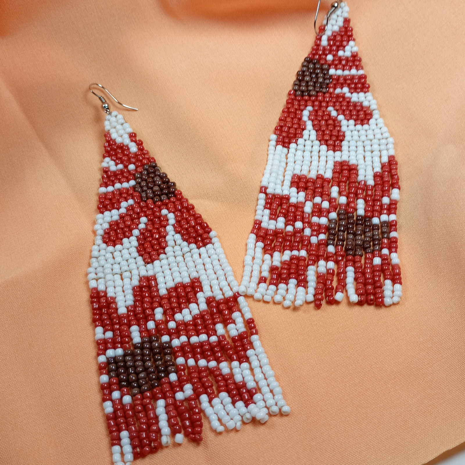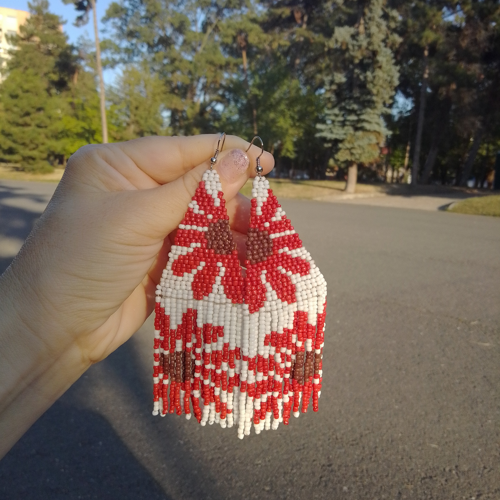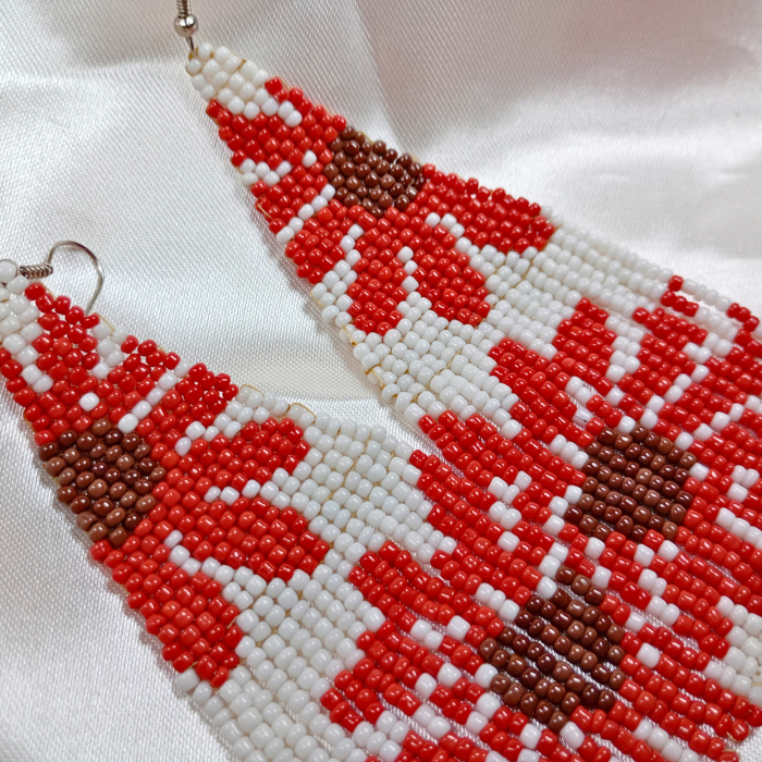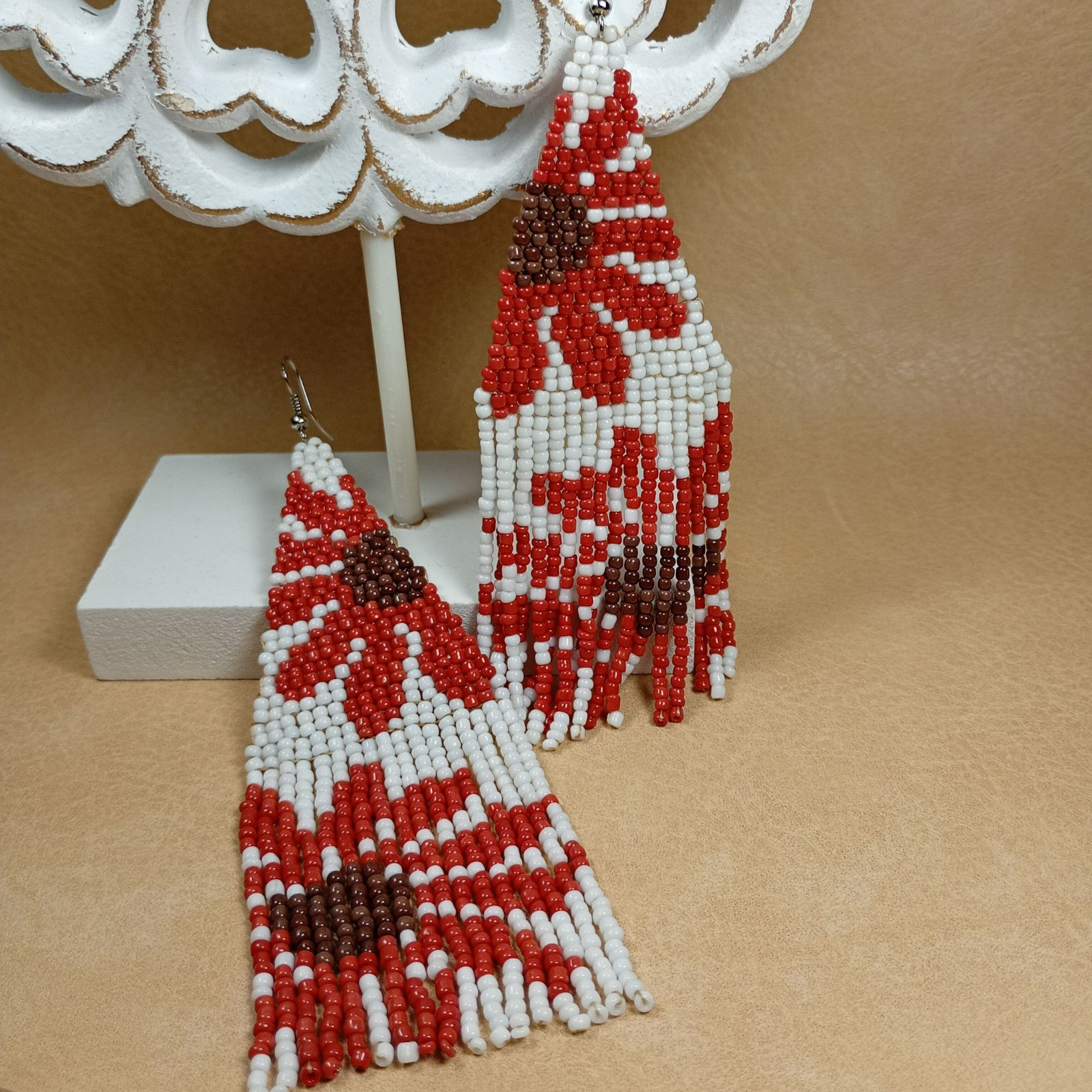 Adaugă un strop de personalitate ținutelor tale cu acești cercei lungi realizați manual din mărgele de sticlă, cu un design floral elegant în nuanțe de roșu intens, alb și maro cald. Fiecare pereche este creată cu migală prin tehnica tradițională de cusut mărgele, rezultând un accesoriu ușor de purtat, dar extrem de spectaculos.