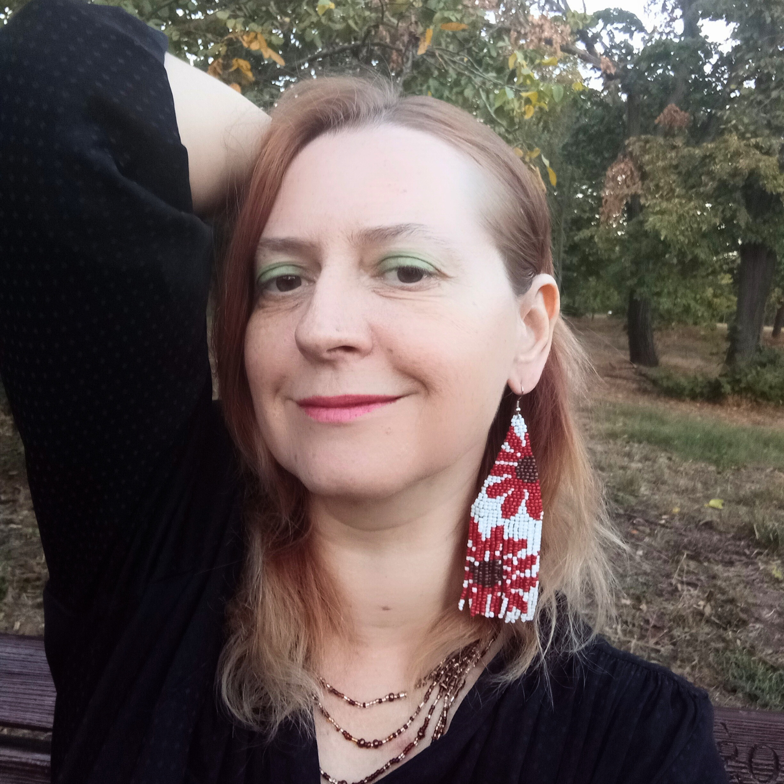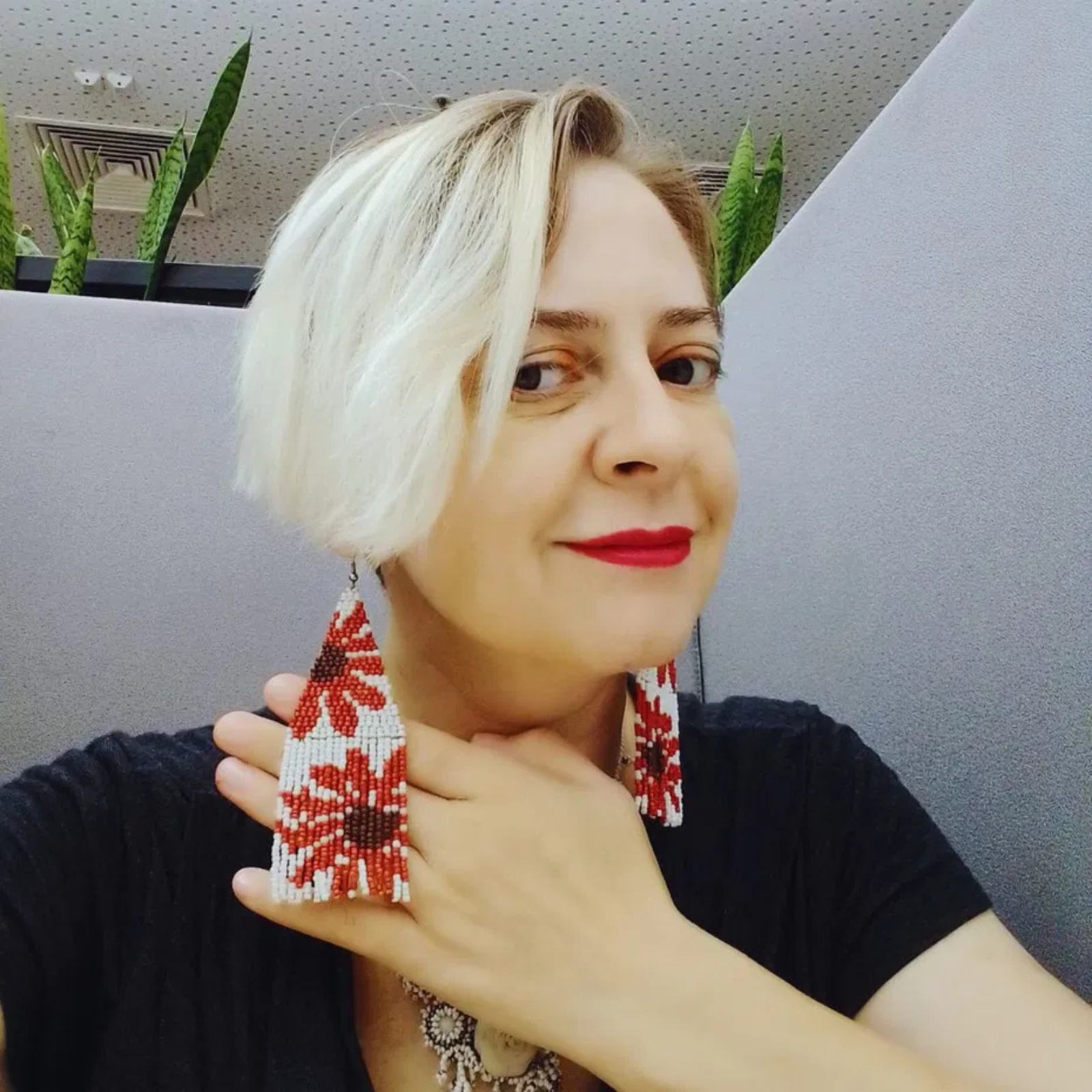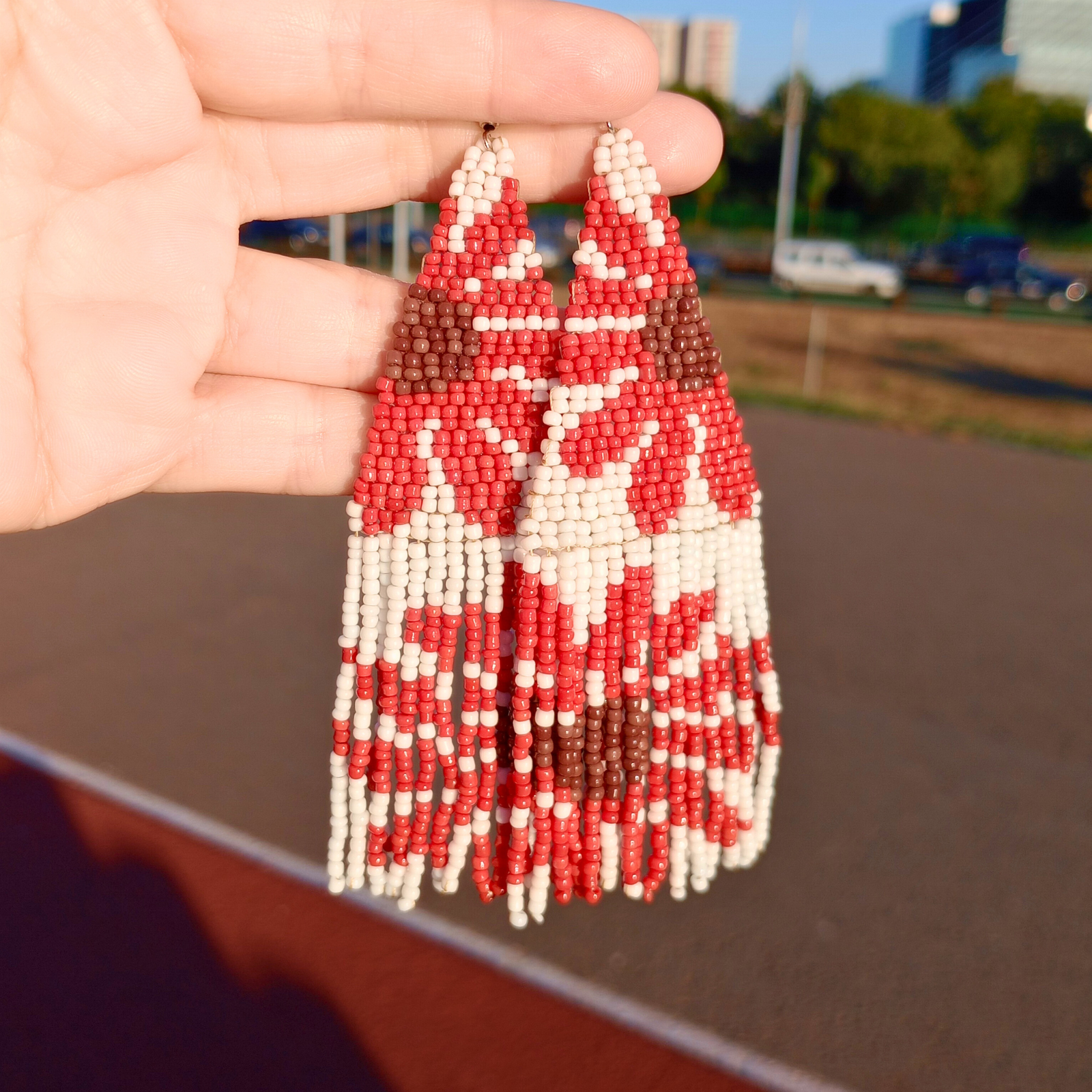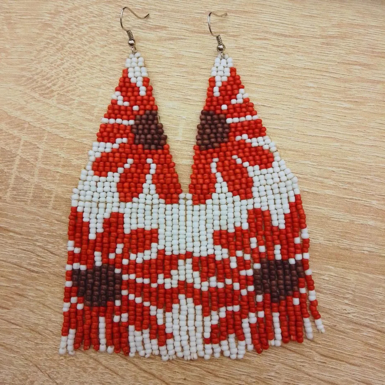 Adaugă un strop de personalitate ținutelor tale cu acești cercei lungi realizați manual din mărgele de sticlă, cu un design floral elegant în nuanțe de roșu intens, alb și maro cald. Fiecare pereche este creată cu migală prin tehnica tradițională de cusut mărgele, rezultând un accesoriu ușor de purtat, dar extrem de spectaculos.