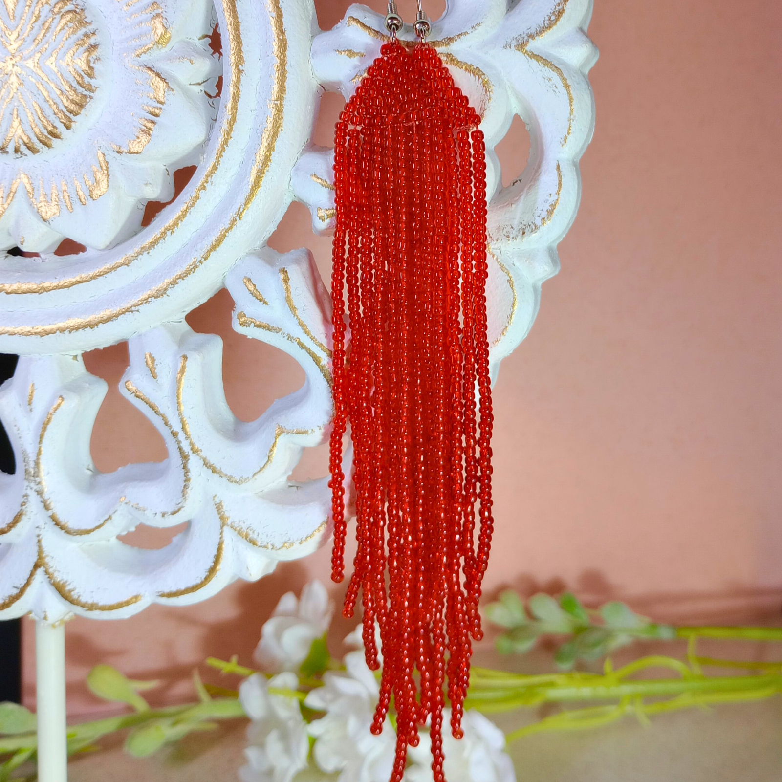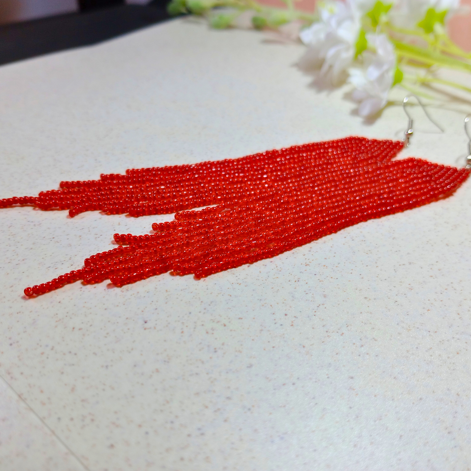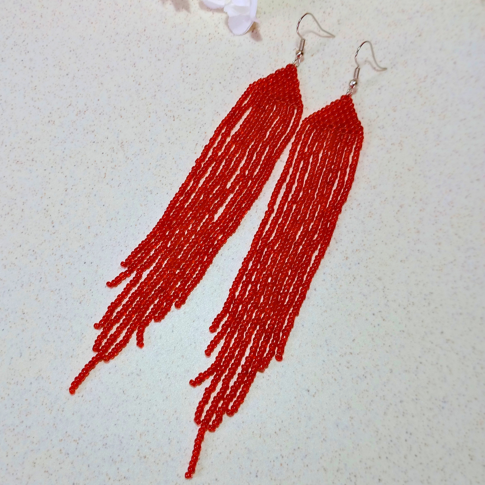 Sunt realizați manual din mărgele de sticlă roșii, cu tortiță metalică pentru prindere sigură.