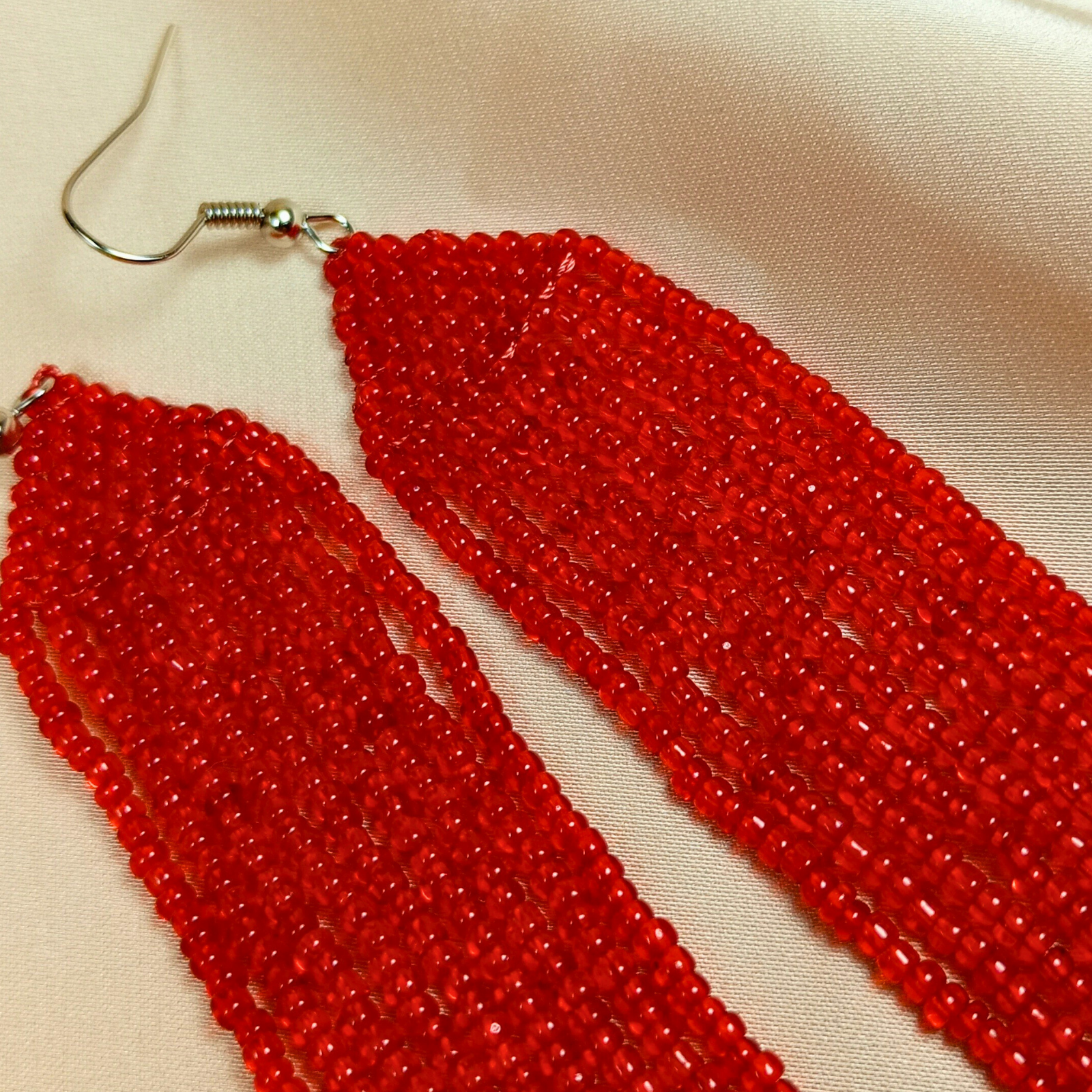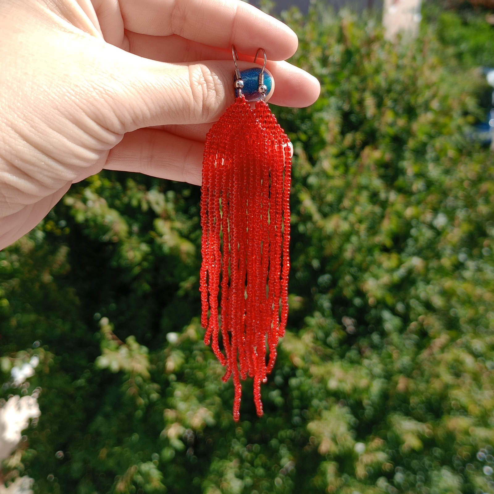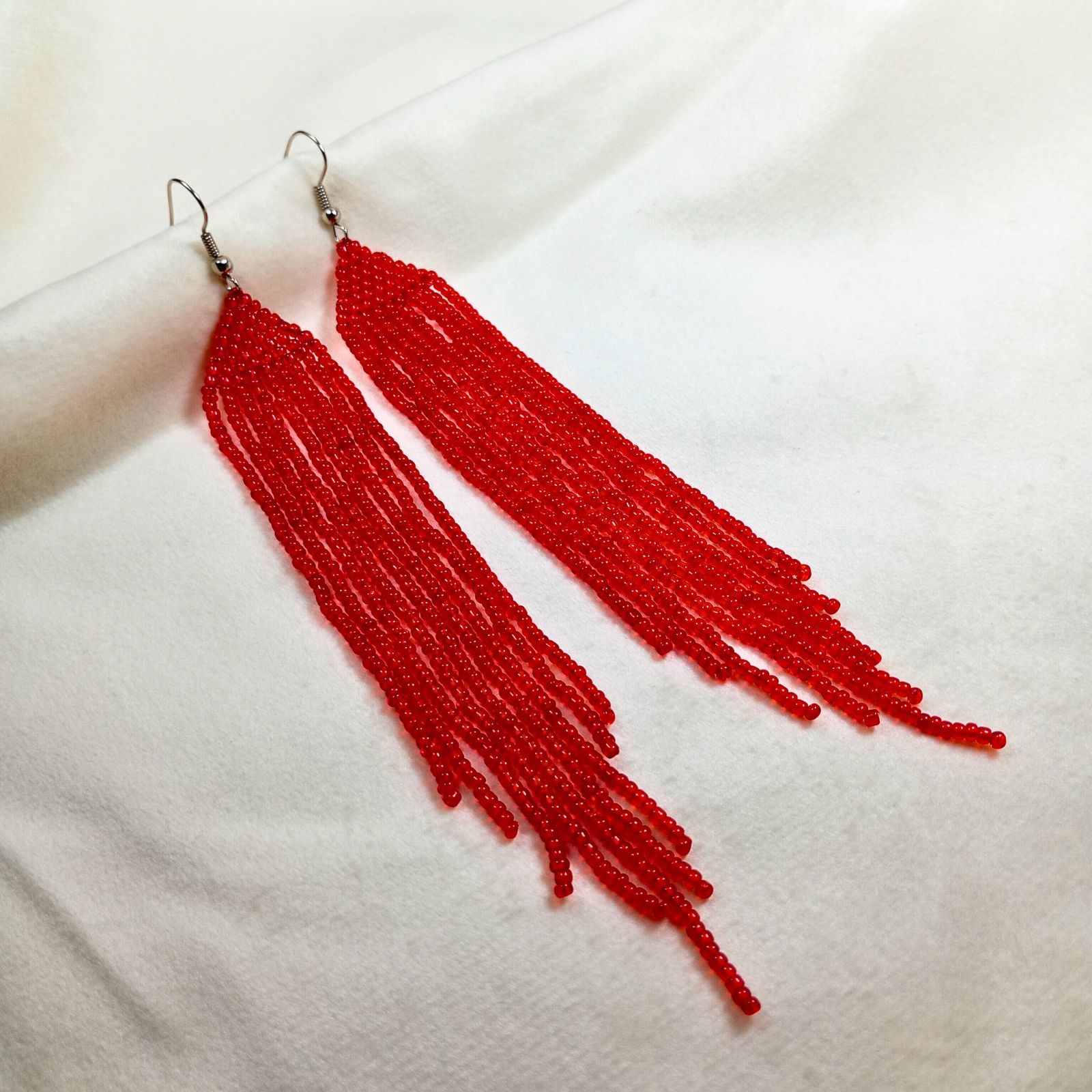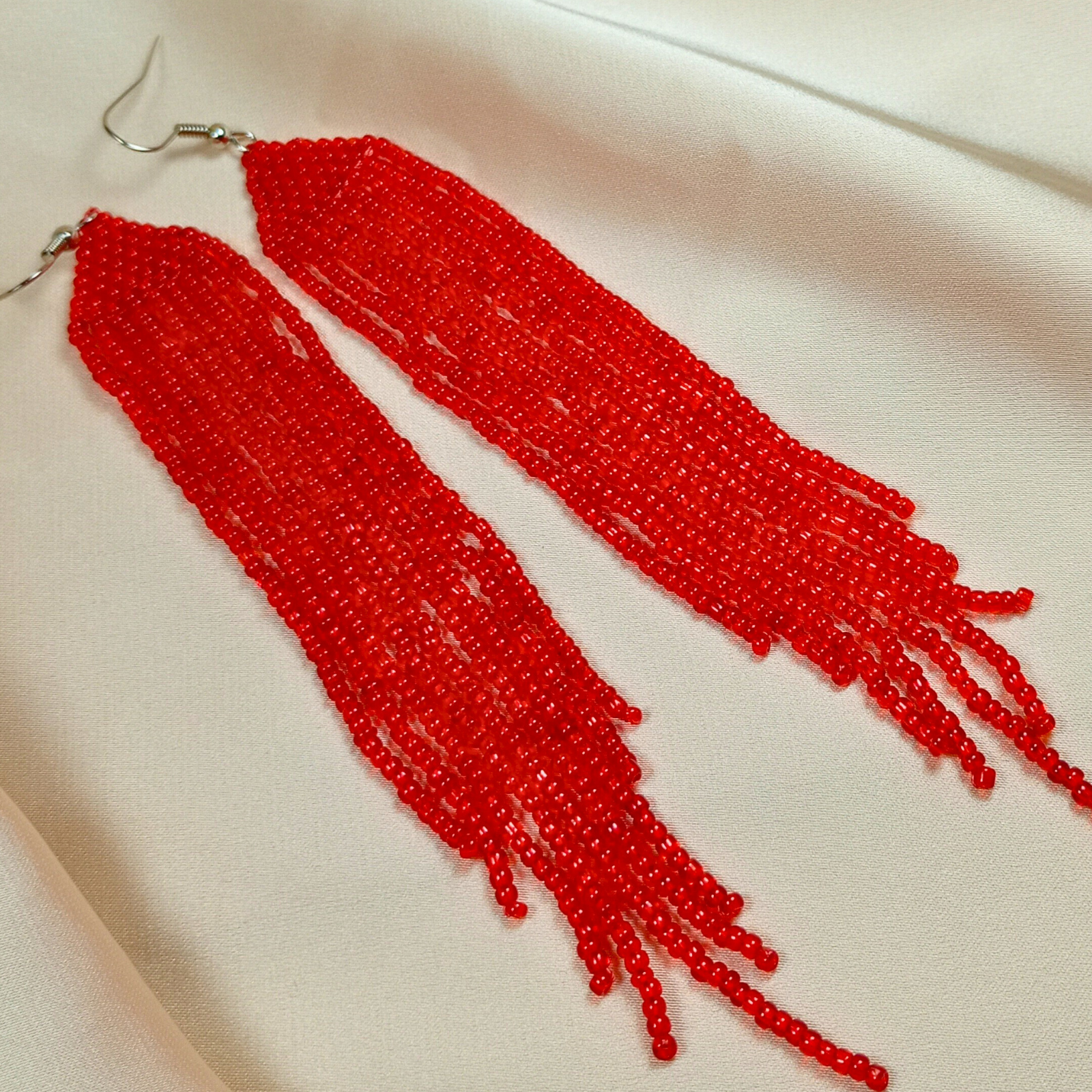 Sunt realizați manual din mărgele de sticlă roșii, cu tortiță metalică pentru prindere sigură.