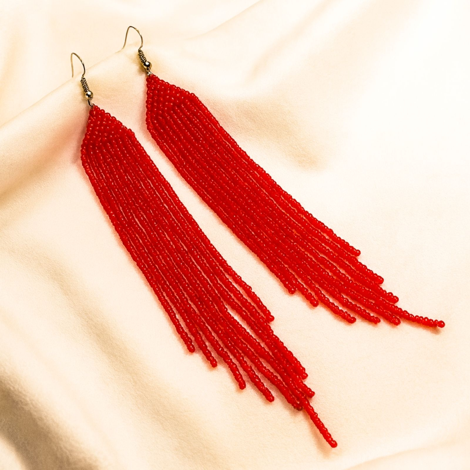 Adaugă un strop de culoare și eleganță ținutelor tale cu acești cercei lungi, confecționați manual din mărgele roșii de sticlă. Designul lor fluid și vibrant adaugă o notă sofisticată oricărei ținute, fiind ideali pentru evenimente speciale sau pentru a evidenția o apariție de zi cu zi.