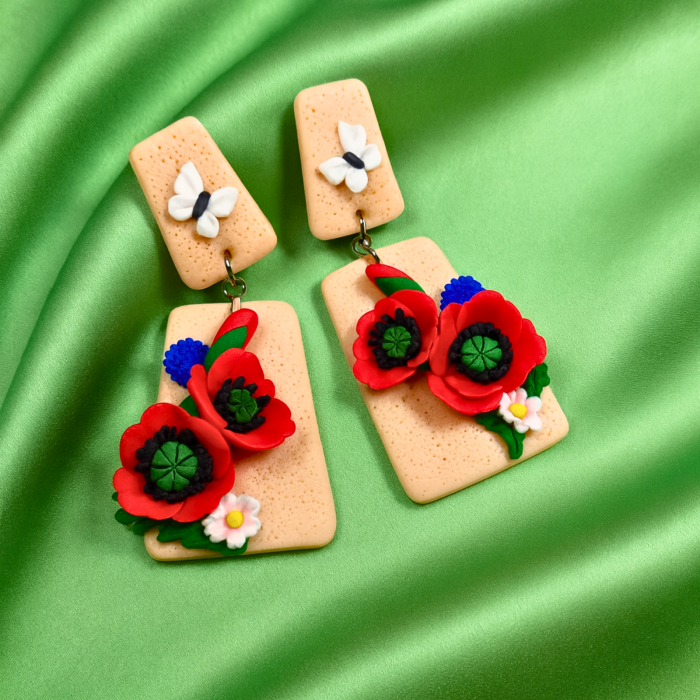 Modele cu viorea mov, maci roșii, ruscute de primăvară, anemone de pădure, margarete cu buburuze sau luminite de seară roz – toate modelate manual din argilă polimerică.