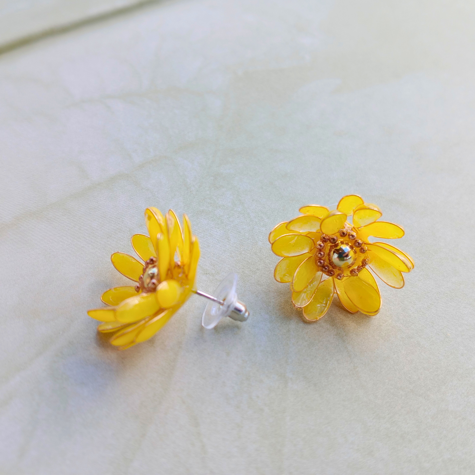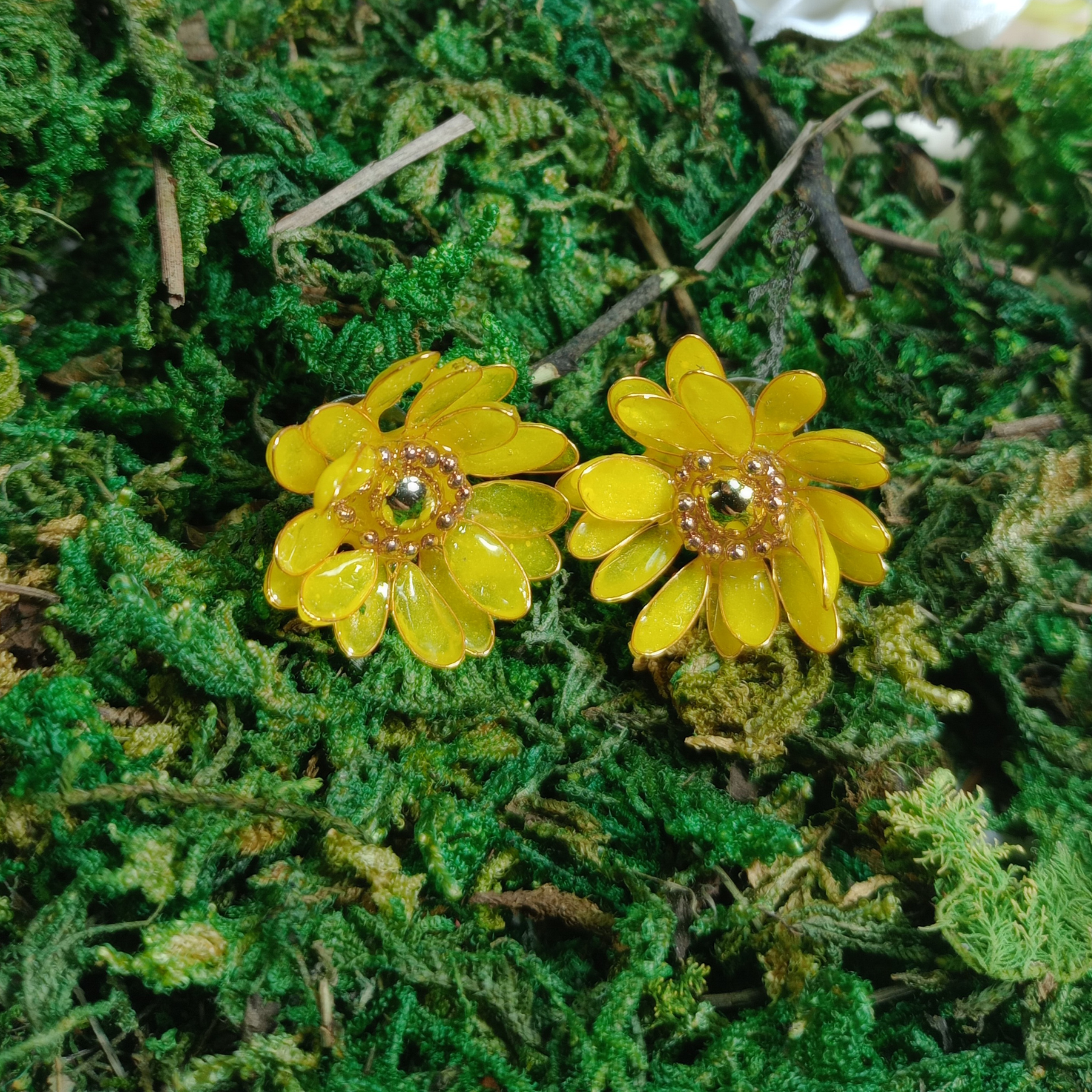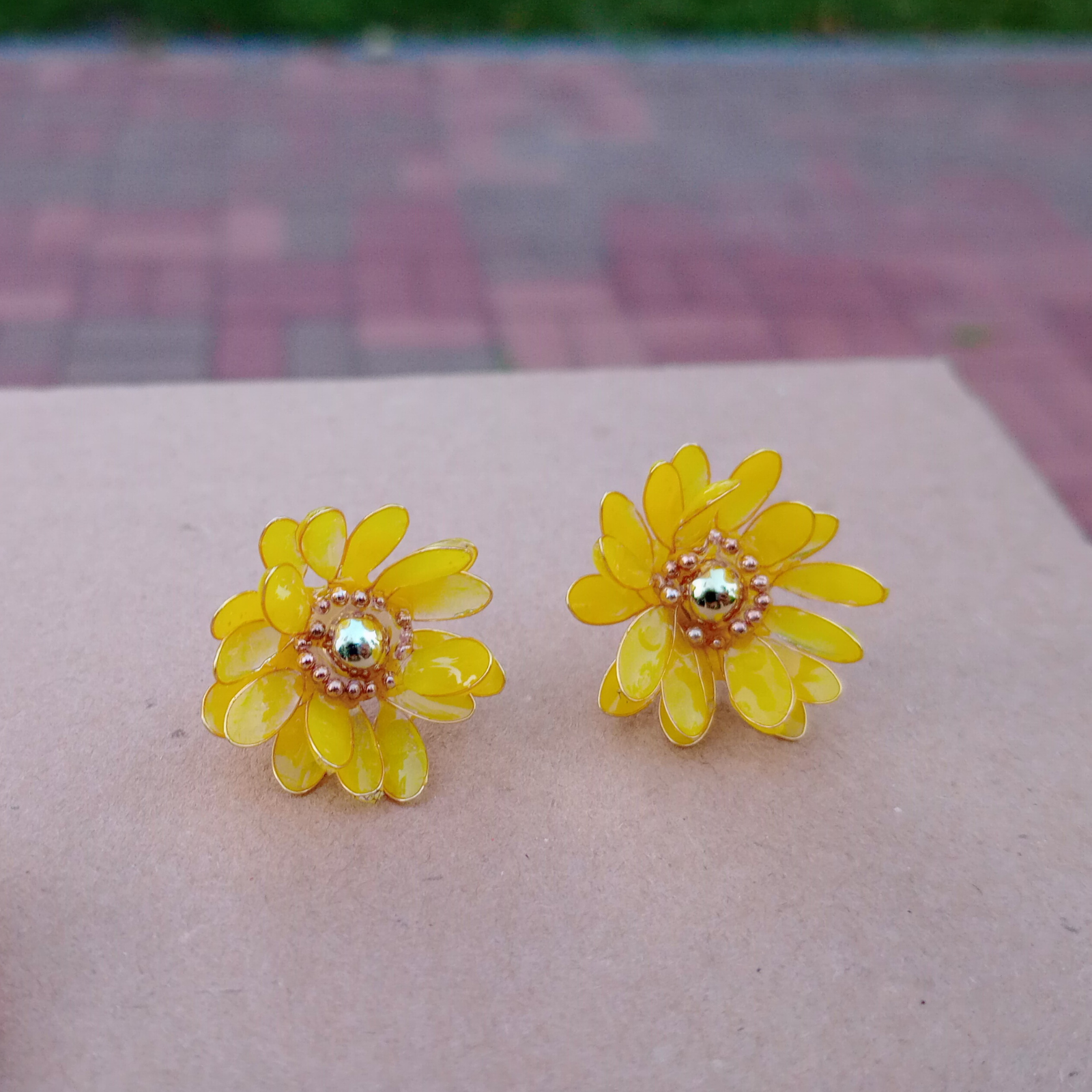 Cercei șurub Floarea-Soarelui – bijuterie handmade cu rășină și sârmă aurie, model discret, colorat și durabil, perfect pentru purtat zilnic sau ocazii speciale.