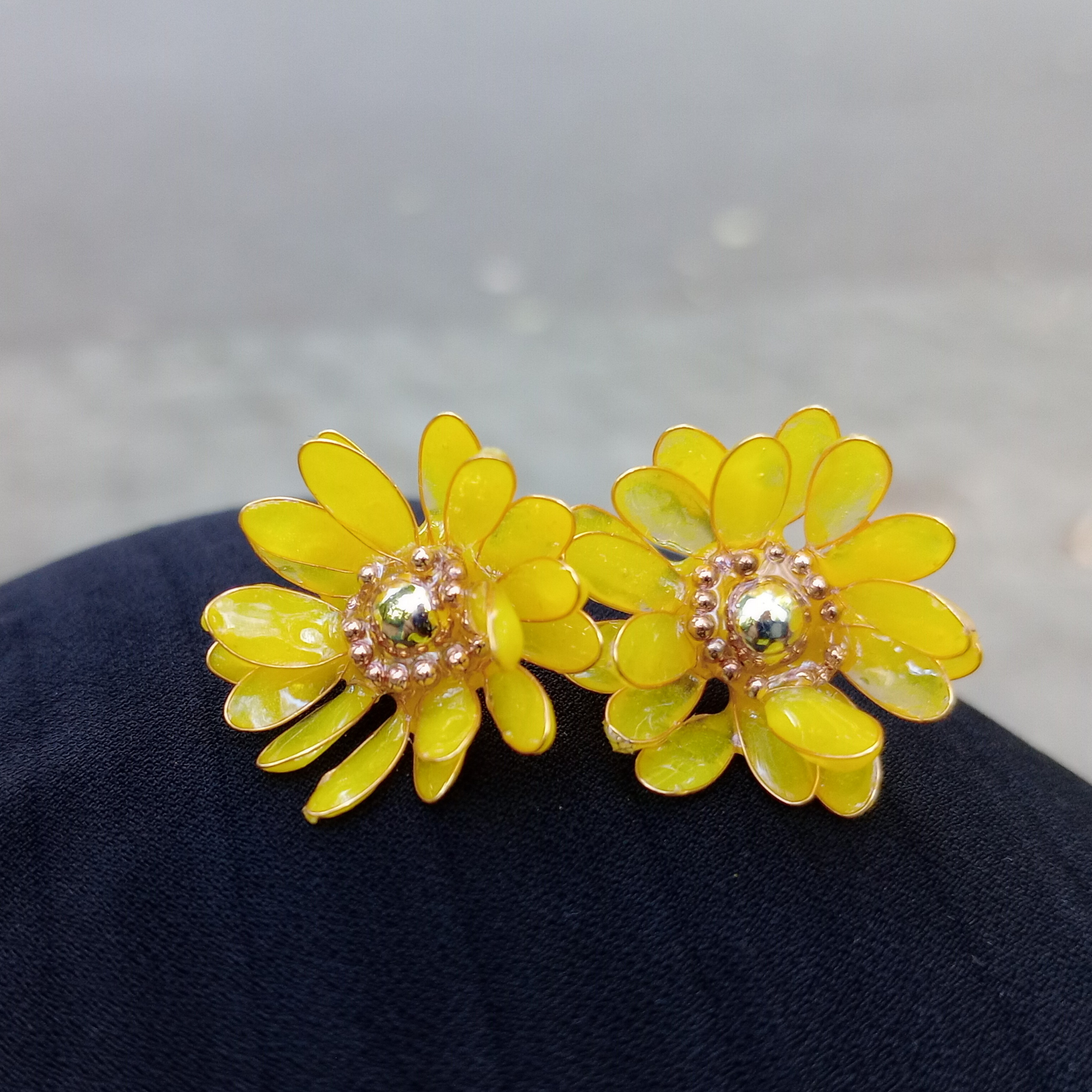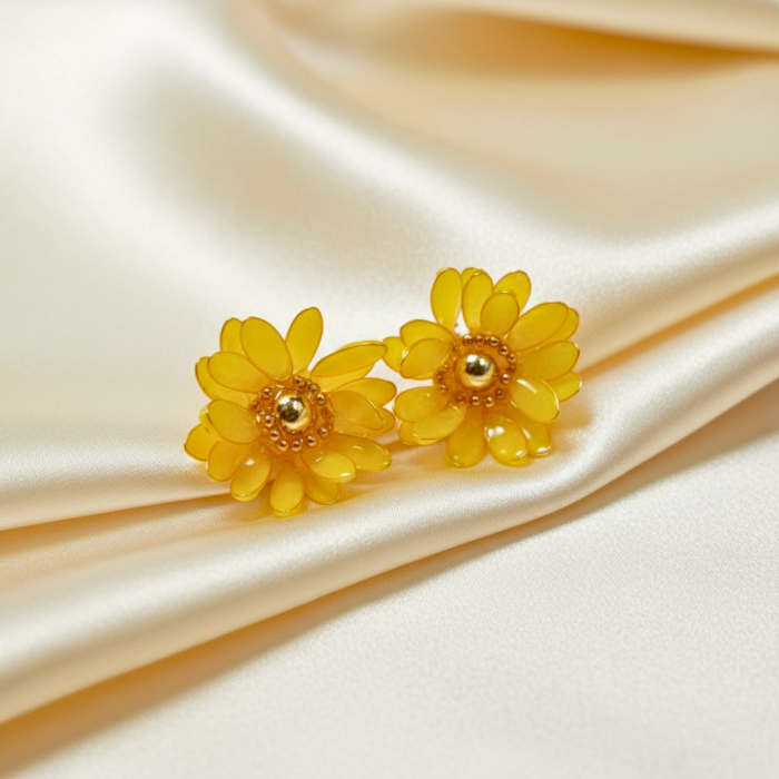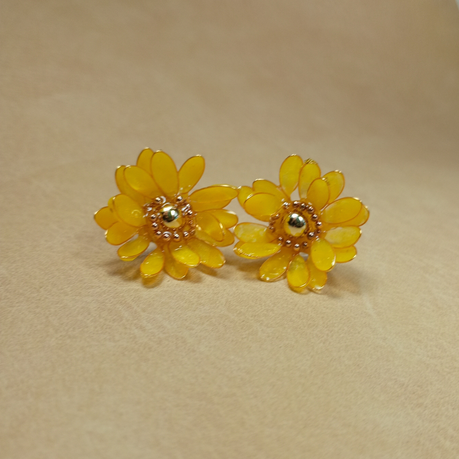 Cercei șurub Floarea-Soarelui – bijuterie handmade cu rășină și sârmă aurie, model discret, colorat și durabil, perfect pentru purtat zilnic sau ocazii speciale.