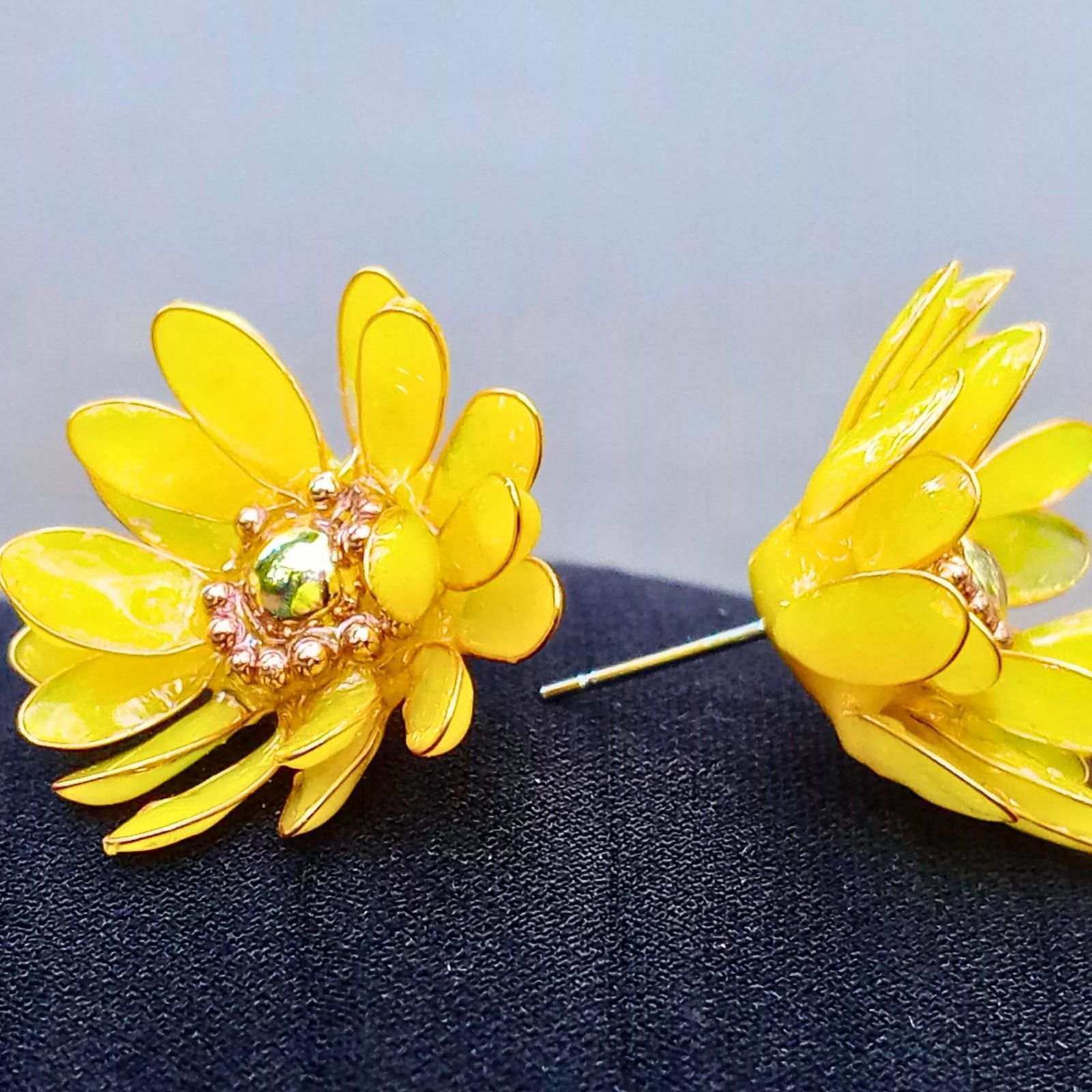 • Design: cercei tip șurub, model „floarea-soarelui”, fiecare petală fiind fixată manual pentru detalii și simetrie. Forma este ergonomic proiectată – tortița/șurubul este poziționat astfel încât să nu deranjeze și să fie confortabil pe ureche.