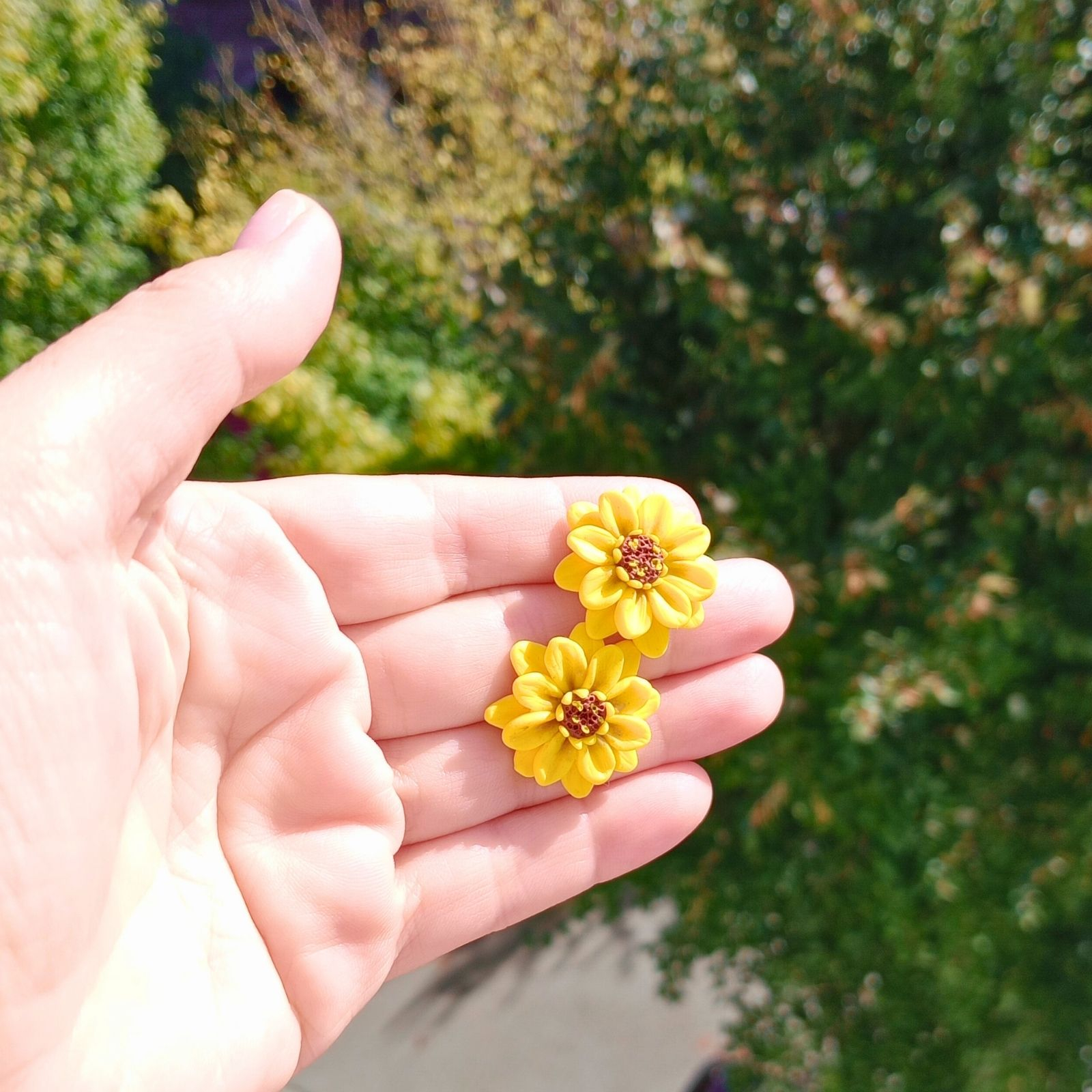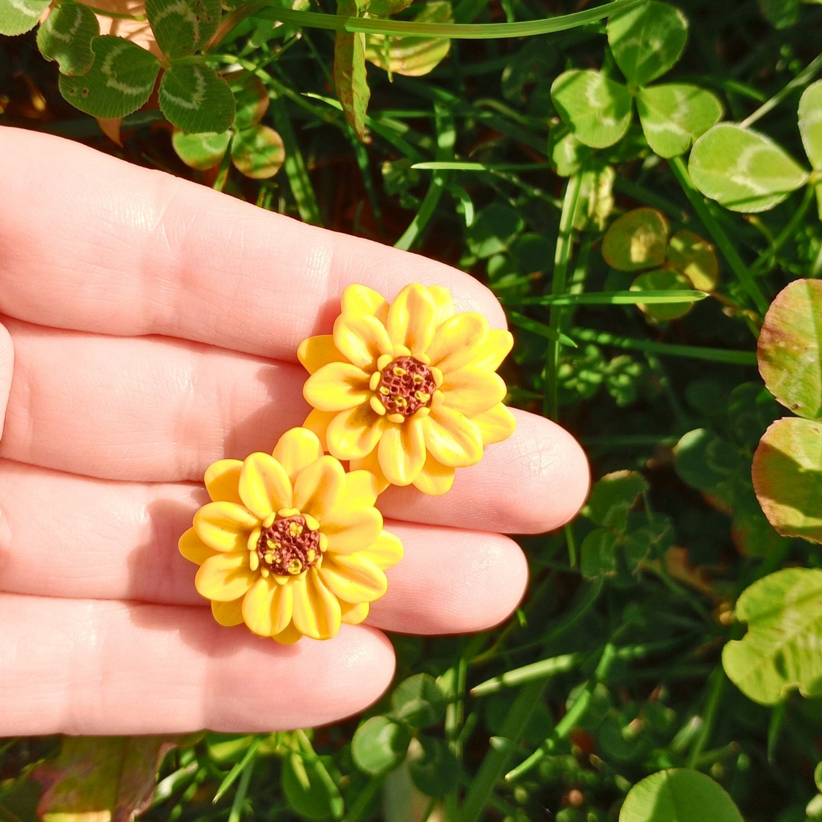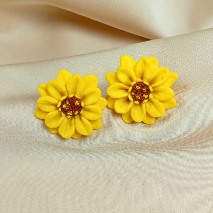 Cerceii tip șurub cu floare galbenă sunt modelați manual din argilă polimerică, petală cu petală, pentru a reda bucuria unei mici margarete scăldate în soare. Discul central, texturat în nuanțe de cărămiziu și galben, creează un contrast cald cu petalele galbene luminoase, oferind un efect 3D delicat pe lobul urechii. Diametrul de 2,6 cm și greutatea de doar 2 g/cercel îi fac extrem de ușori și confortabili, ideali pentru a fi purtați întreaga zi fără senzație de greutate.