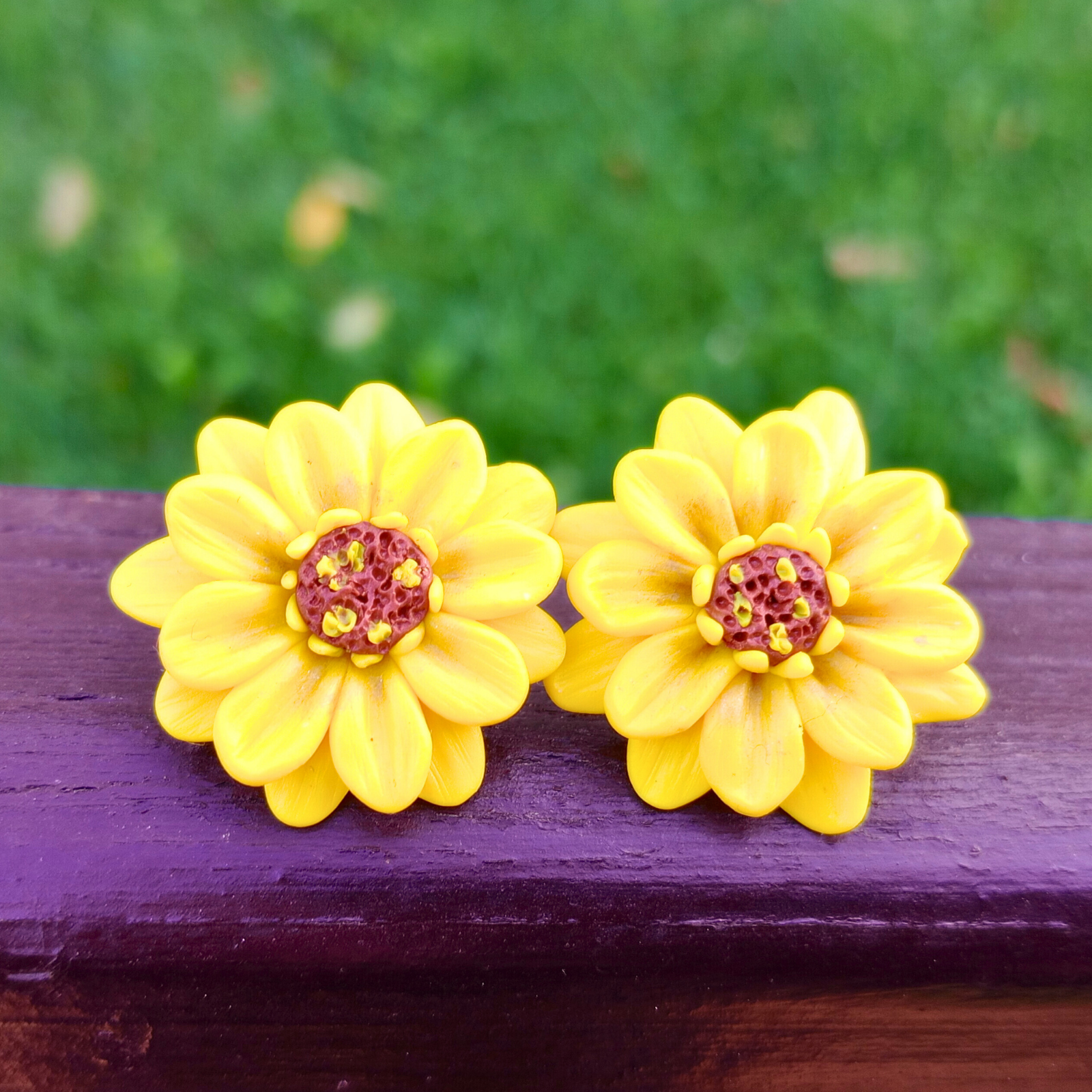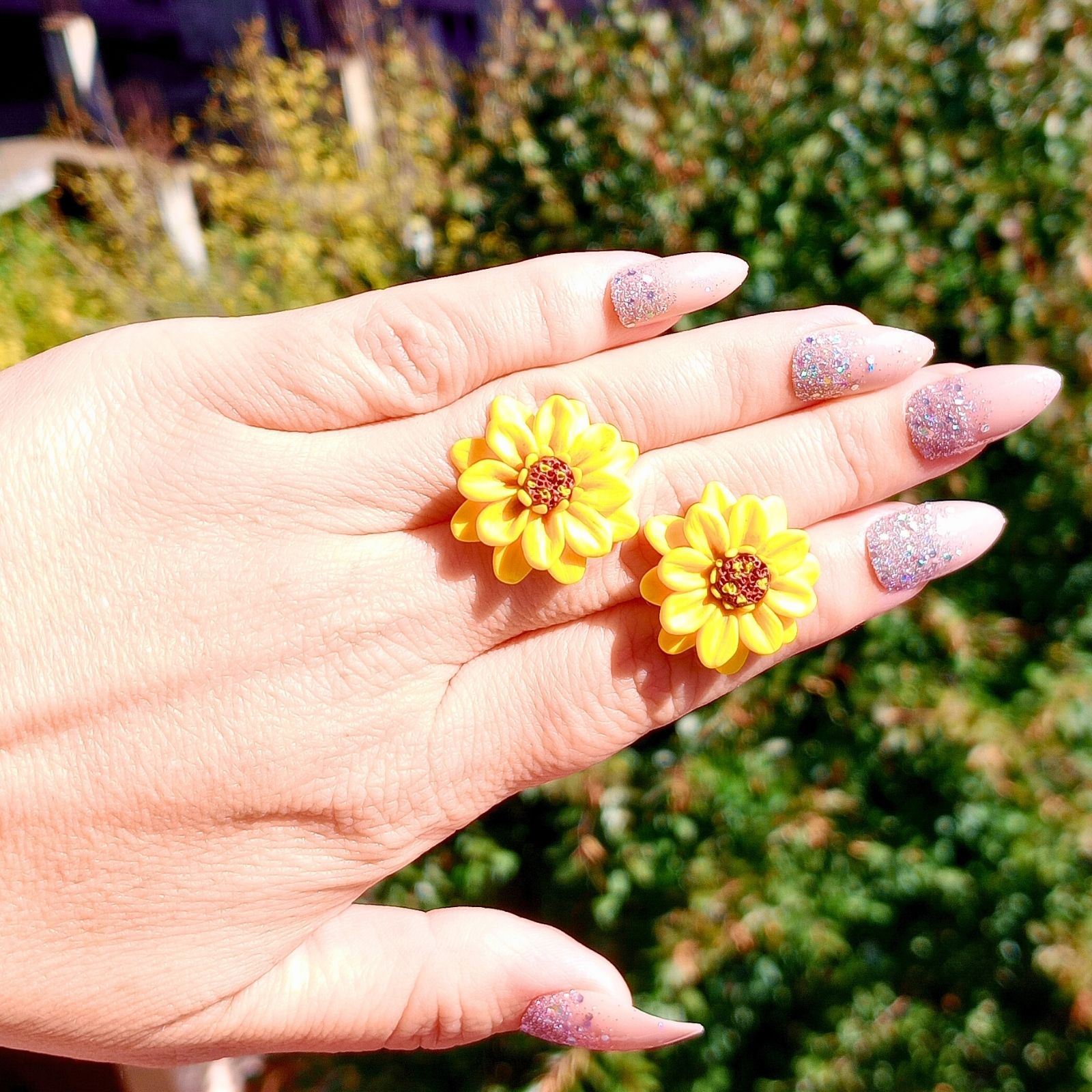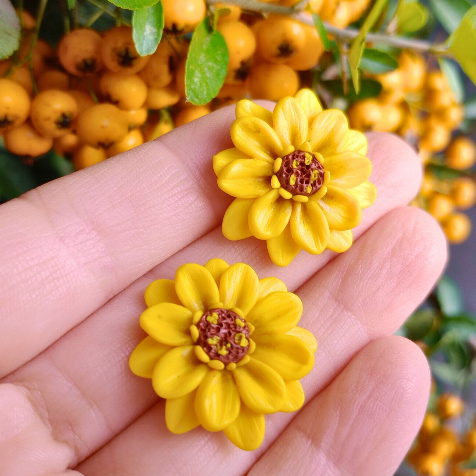 Cerceii tip șurub cu floare galbenă sunt modelați manual din argilă polimerică, petală cu petală, pentru a reda bucuria unei mici margarete scăldate în soare. Discul central, texturat în nuanțe de cărămiziu și galben, creează un contrast cald cu petalele galbene luminoase, oferind un efect 3D delicat pe lobul urechii. Diametrul de 2,6 cm și greutatea de doar 2 g/cercel îi fac extrem de ușori și confortabili, ideali pentru a fi purtați întreaga zi fără senzație de greutate.