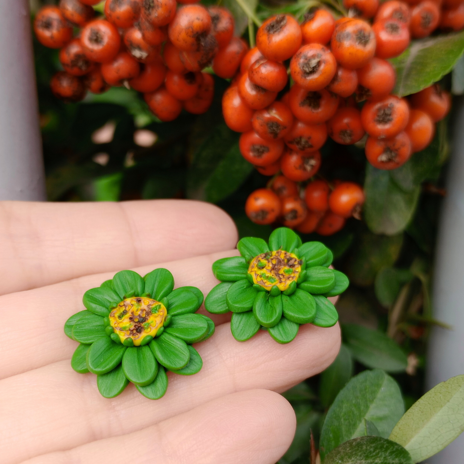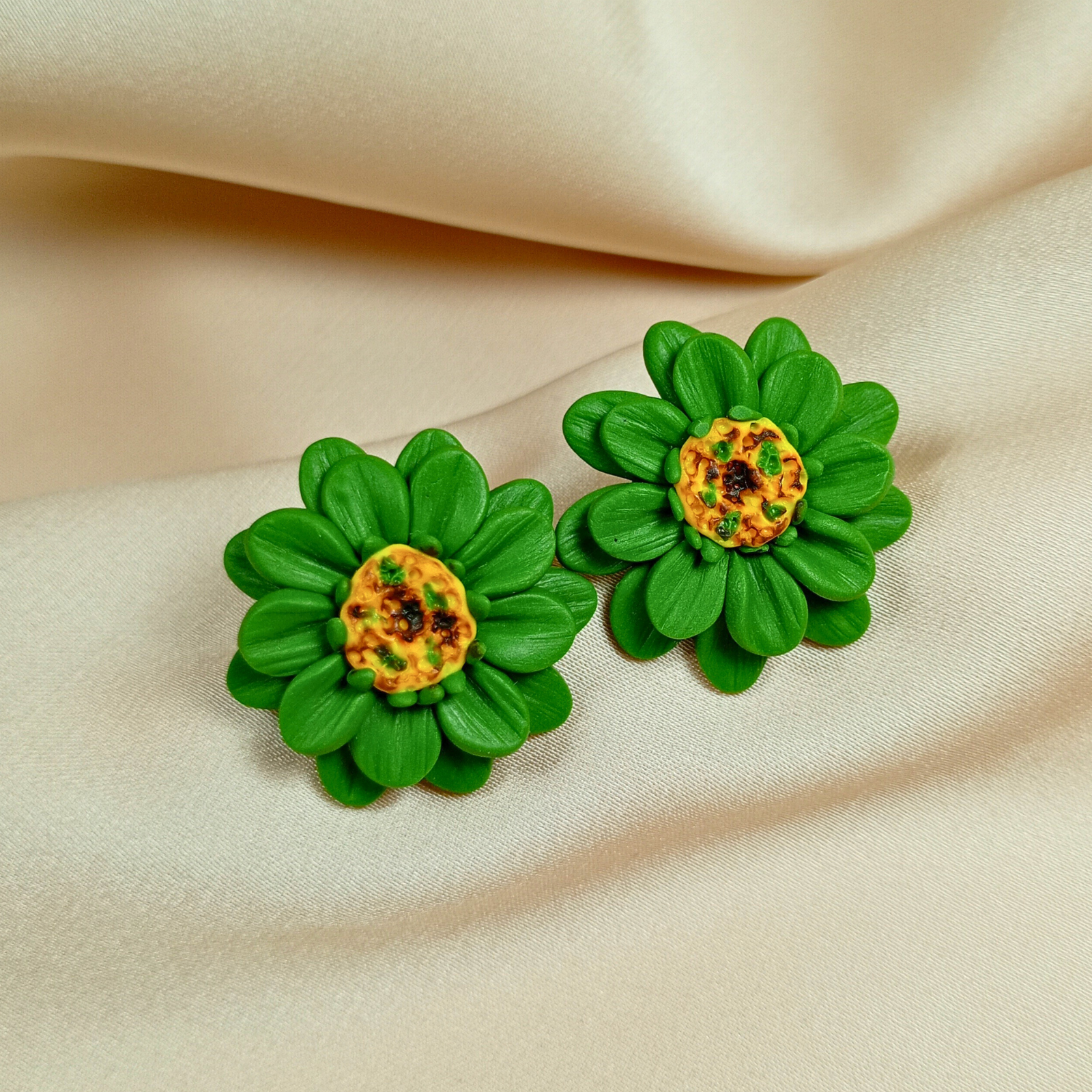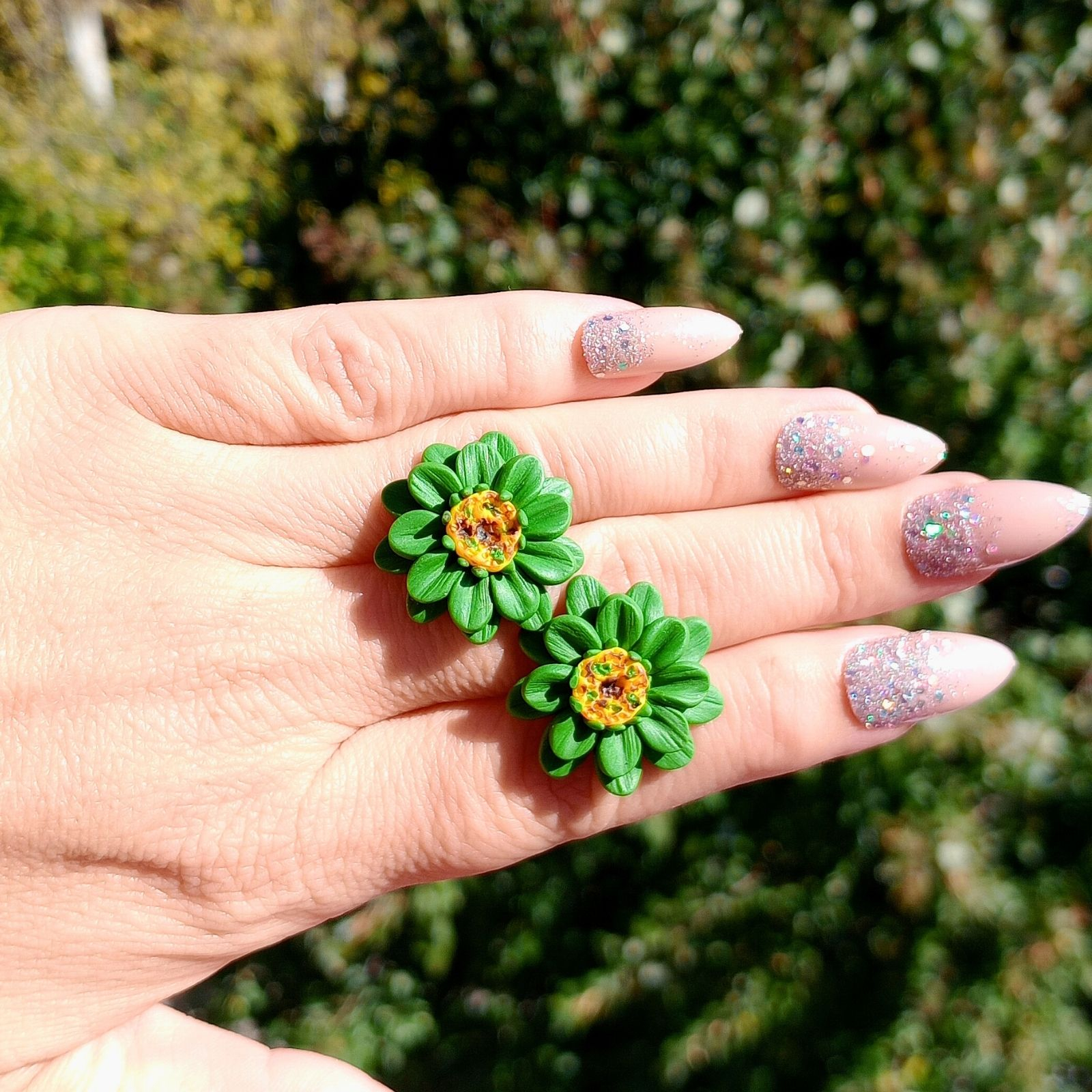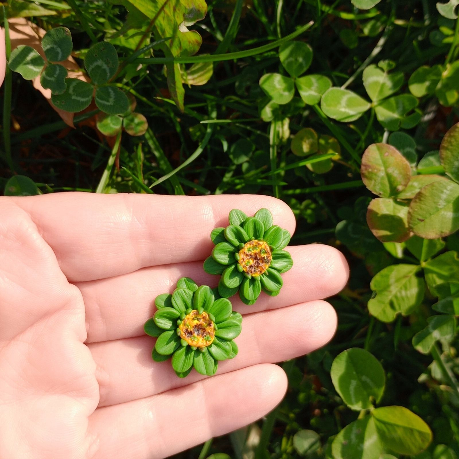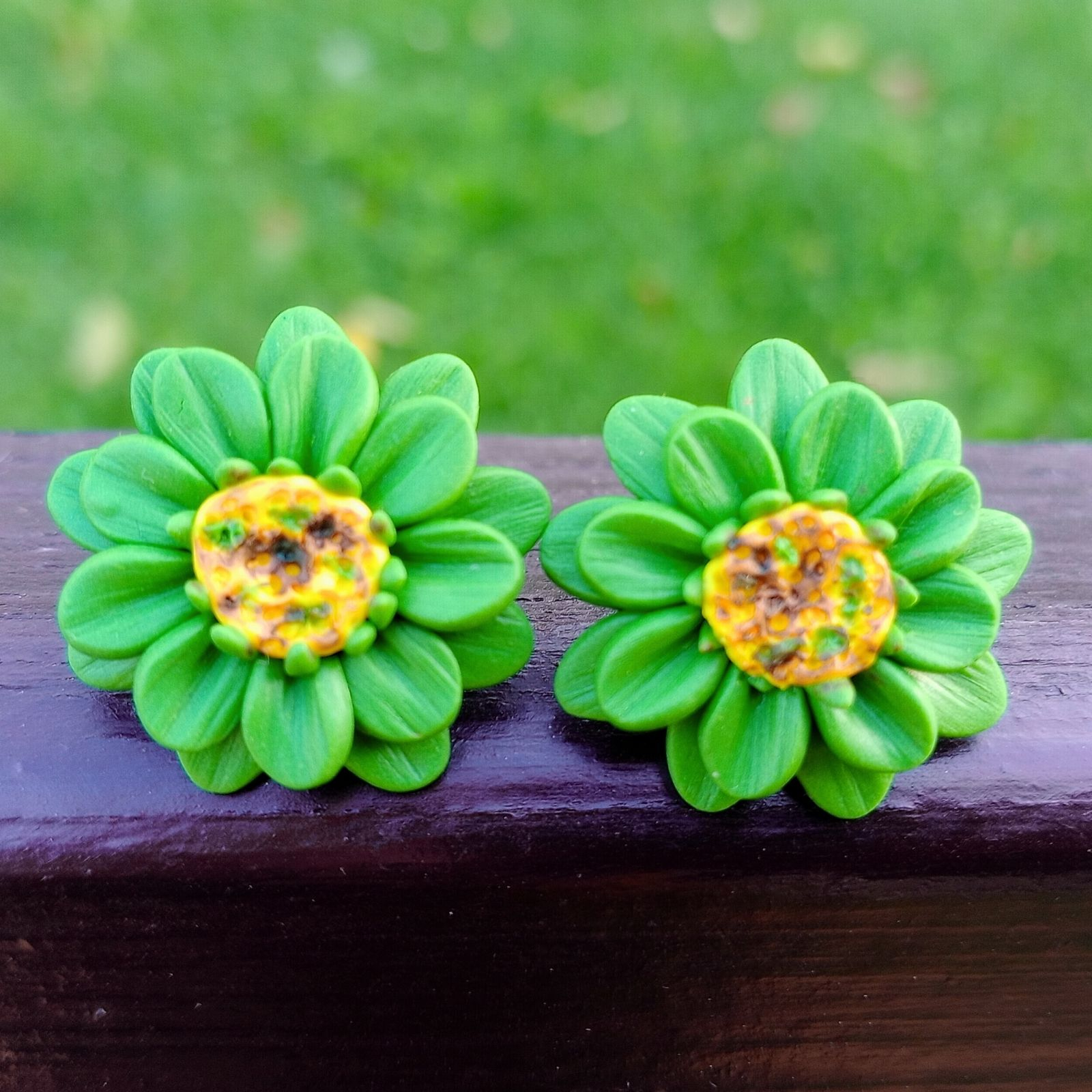 Cerceii sunt modelați manual din argilă polimerică, sub formă de floare cu petale verzi și mijloc galben texturat.
