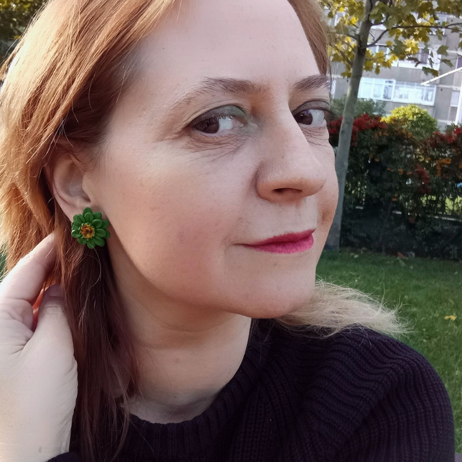 Cerceii tip șurub cu floare verde sunt modelați manual din argilă polimerică, petală cu petală, într-o formă rotundă plină și jucăușă. Mijlocul texturat, în nuanțe de galben-auriu punctat cu accente închise, creează contrastul perfect cu verdele intens al petalelor, amintind de un mic soare ascuns într-o margaretă de pădure. Diametrul de 2,5 cm și greutatea de doar 2 g/cercel îi fac ușori și comozi, ideali pentru a fi purtați întreaga zi fără disconfort.