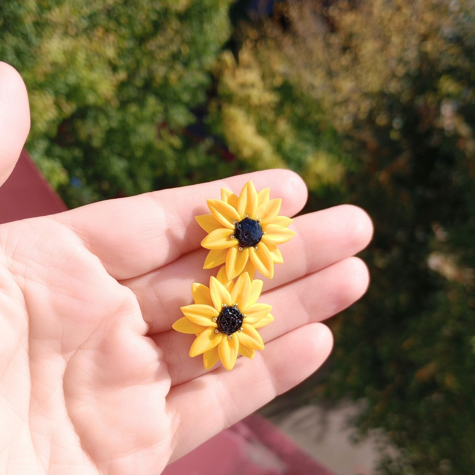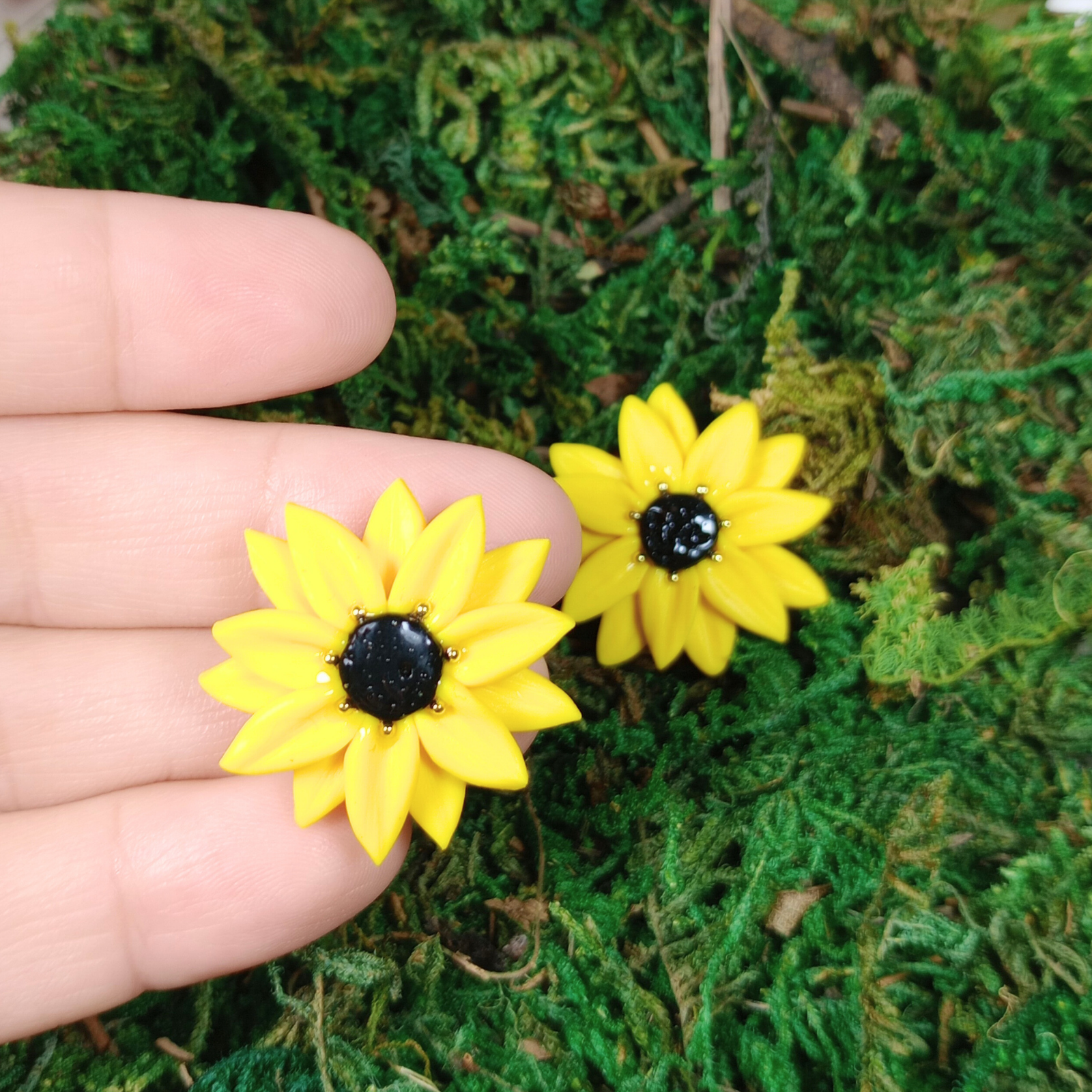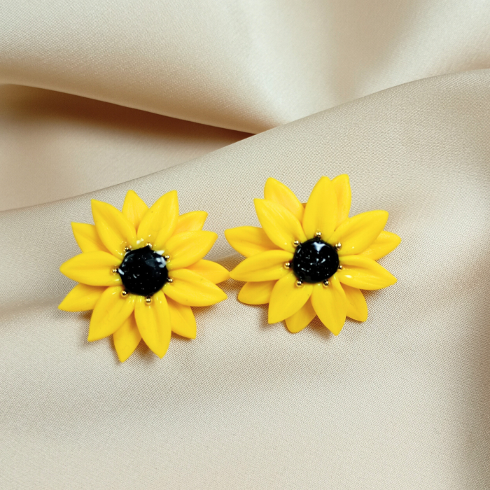 Culoare: galben turnesol, cu centru contrastant în nuanțe închise (negru) — un accent elegant și modern care scoate urechile în evidență.