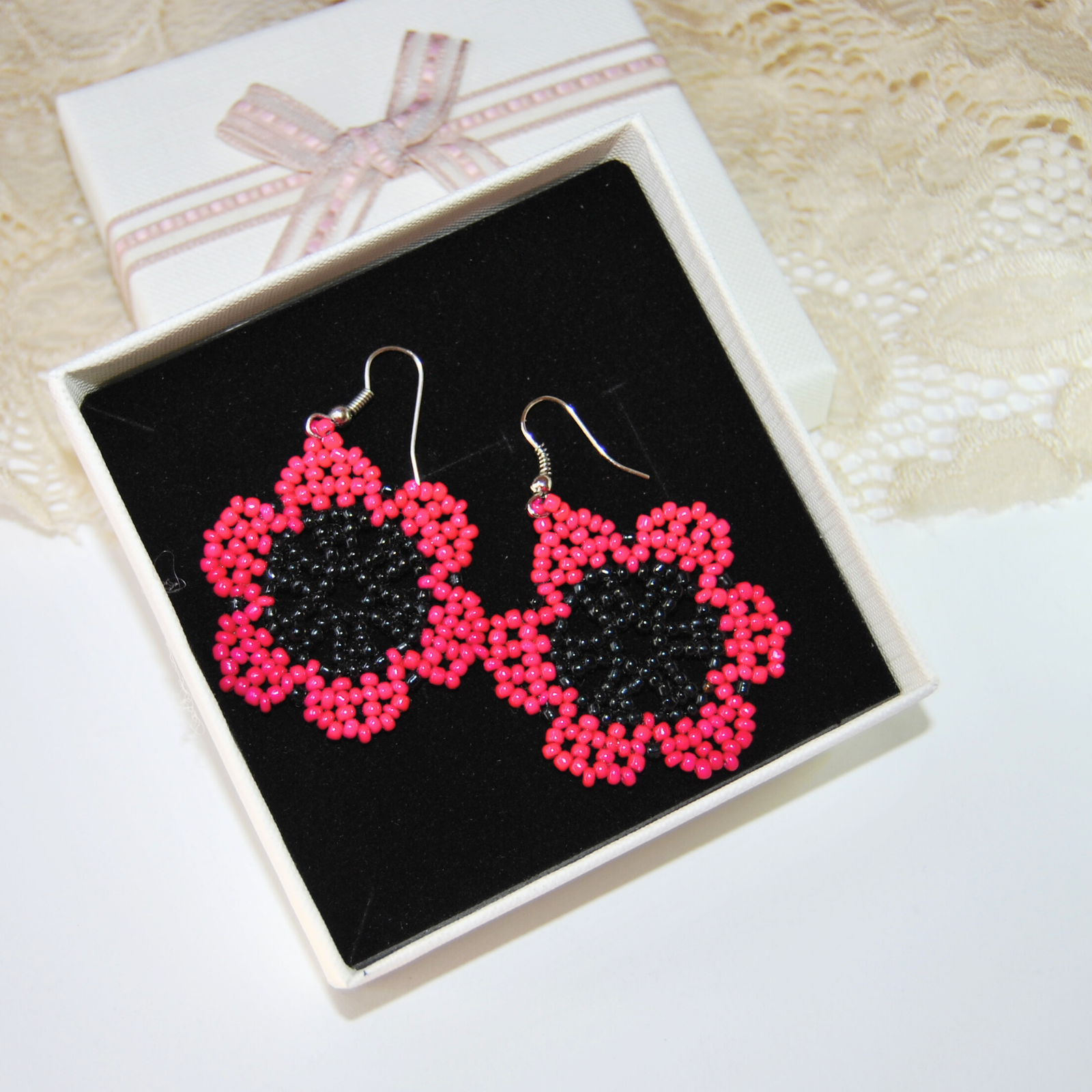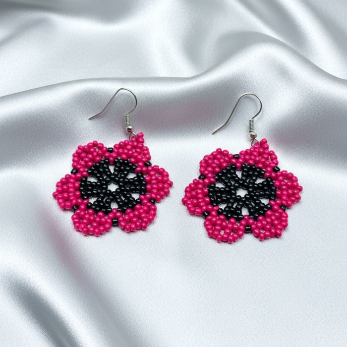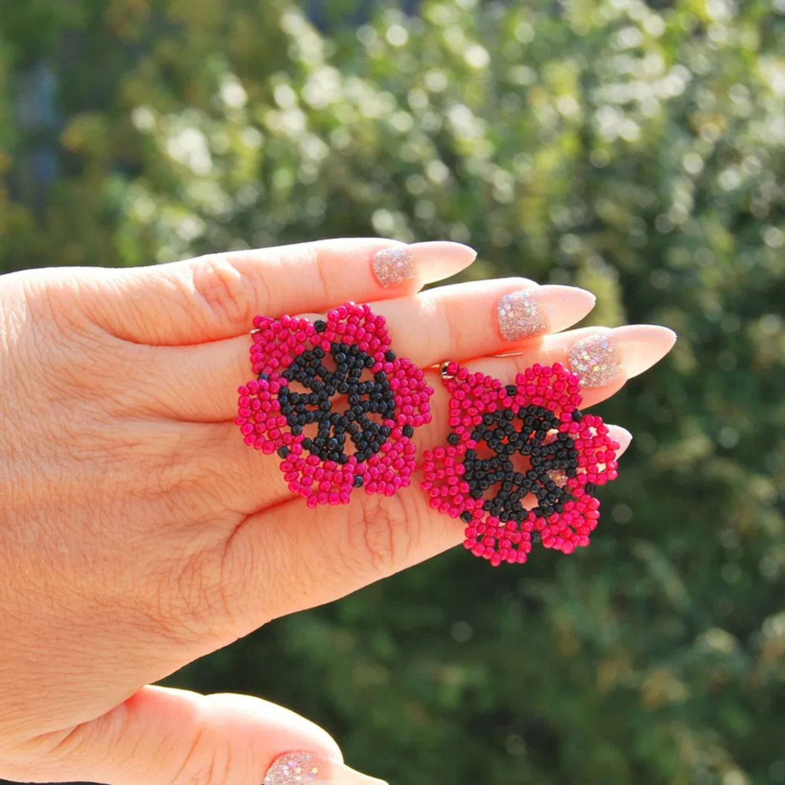Cerceii sunt lucrați manual din mărgele de sticlă, cusute atent în formă de floare, inspirați de stilul huichol.