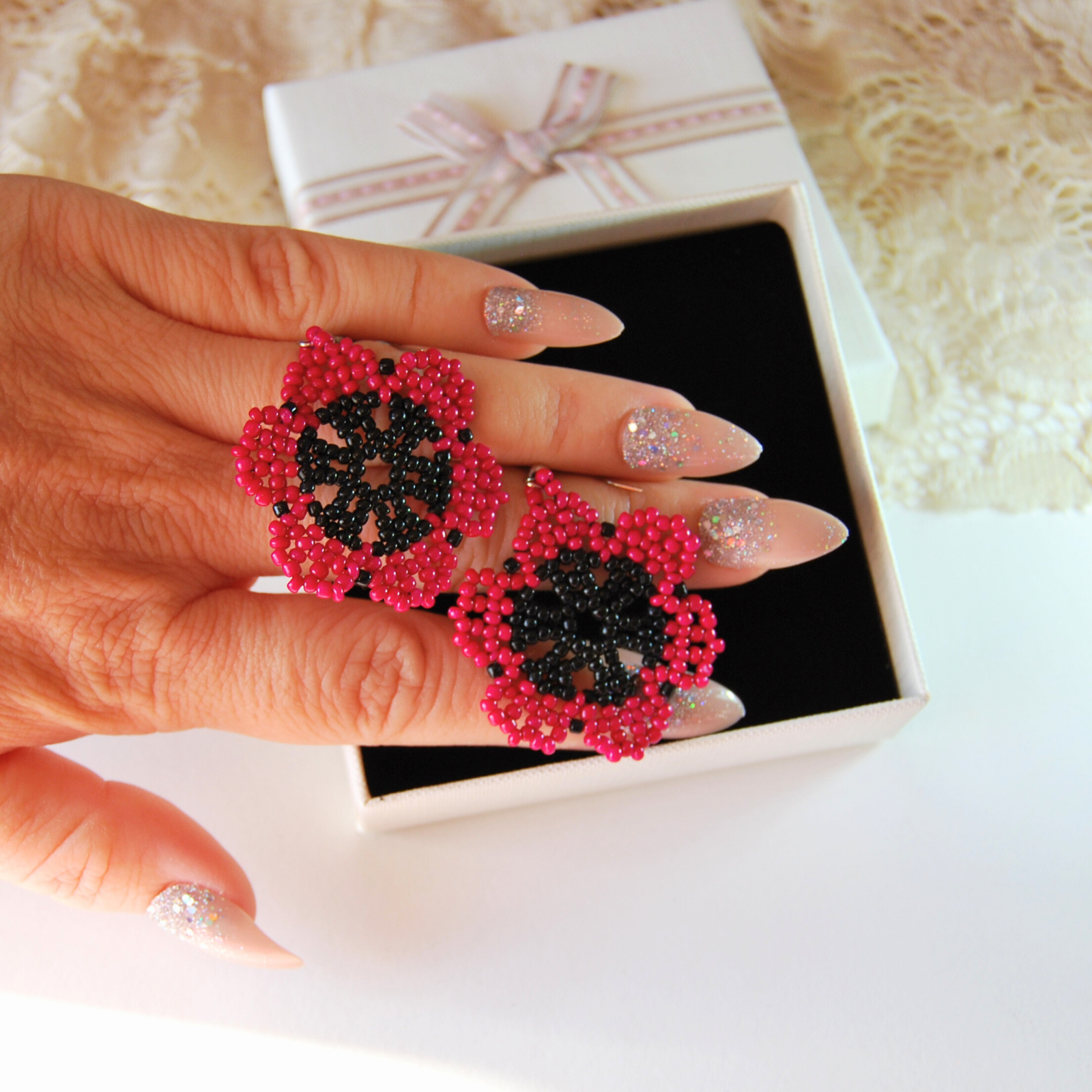 Adaugă o notă de culoare și veselie look-ului tău cu aceşti Cercei „Flori Fuchsia din Mărgele” de la Verdelysse – bijuterie lucrată manual, cu flori stilizate şi mărgele vibrante care reflectă lumina.