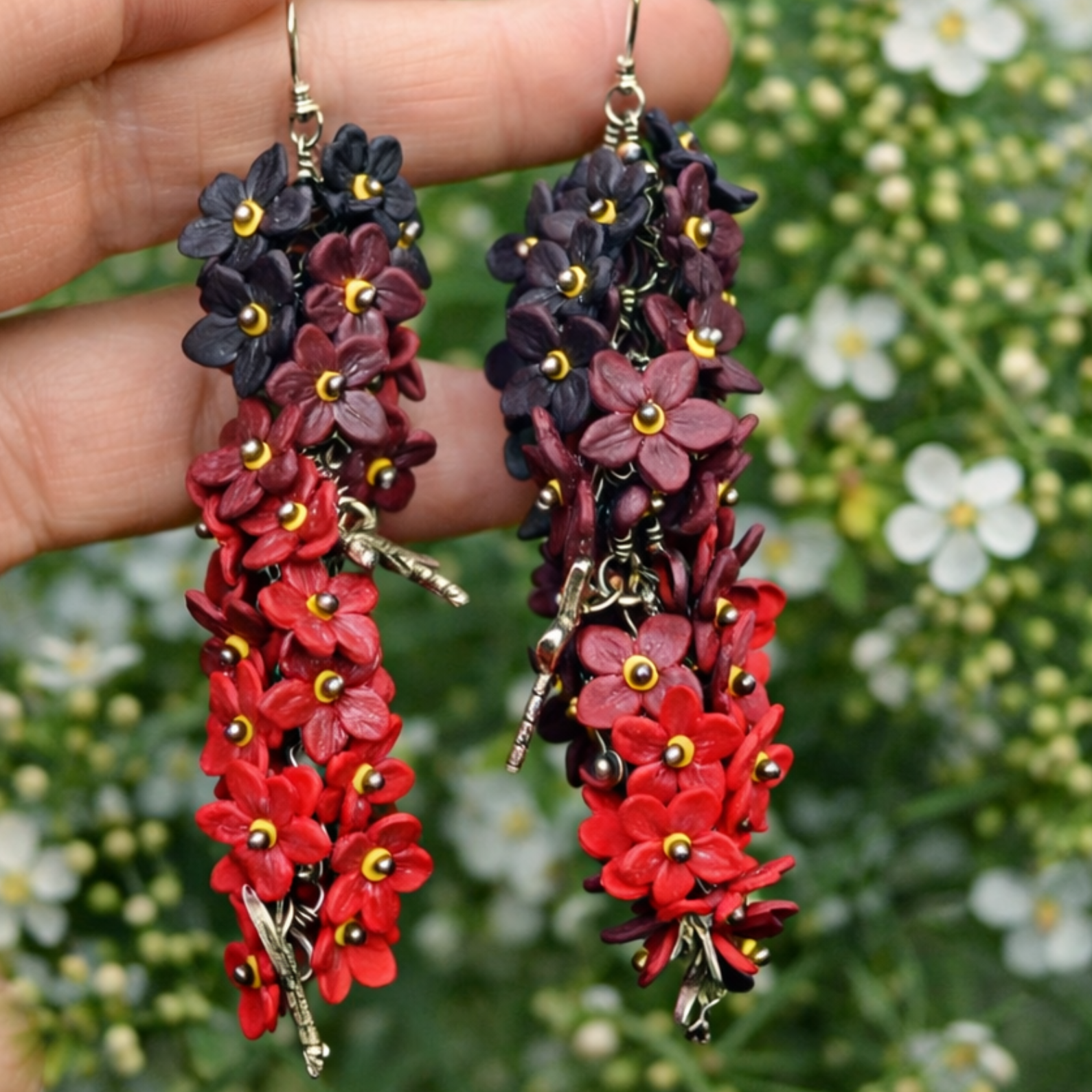 Flori din argilă polimerică și fluturi din aliaj metalic, fiecare piesă fiind lucrată manual.