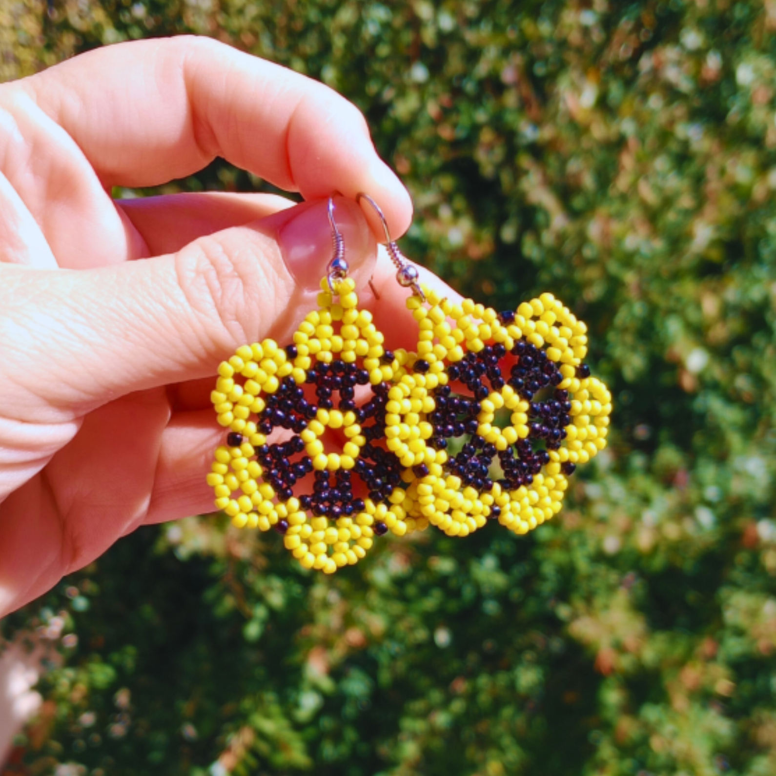 Cercei din mărgele de sticlă cusute cu atenție în formă de floare, inspirați de arta huichol – o celebrare a culorii și naturii.