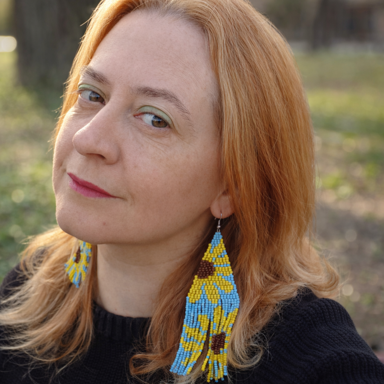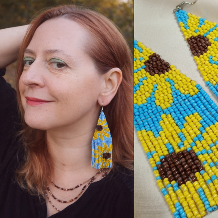 Adaugă un strop de culoare și veselie ținutelor tale cu acești cercei lungi realizați manual din mărgele de sticlă. Modelul cu floarea soarelui pe fundal albastru este cusut cu atenție, floarea fiind integrată în țesătură, nu în relief. Designul vibrant și forma alungită îi transformă într-un accesoriu statement, perfect pentru a-ți exprima personalitatea unică.