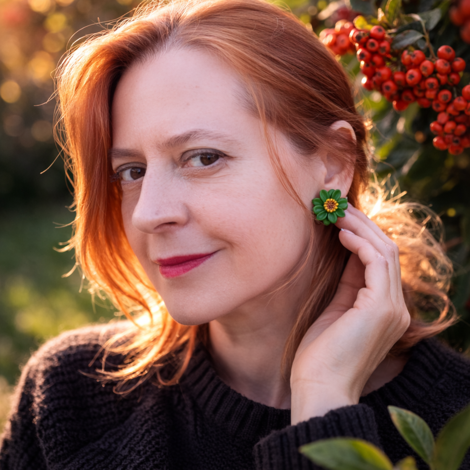 Cerceii tip șurub cu floare verde sunt modelați manual din argilă polimerică, petală cu petală, într-o formă rotundă plină și jucăușă. Mijlocul texturat, în nuanțe de galben-auriu punctat cu accente închise, creează contrastul perfect cu verdele intens al petalelor, amintind de un mic soare ascuns într-o margaretă de pădure. Diametrul de 2,5 cm și greutatea de doar 2 g/cercel îi fac ușori și comozi, ideali pentru a fi purtați întreaga zi fără disconfort.